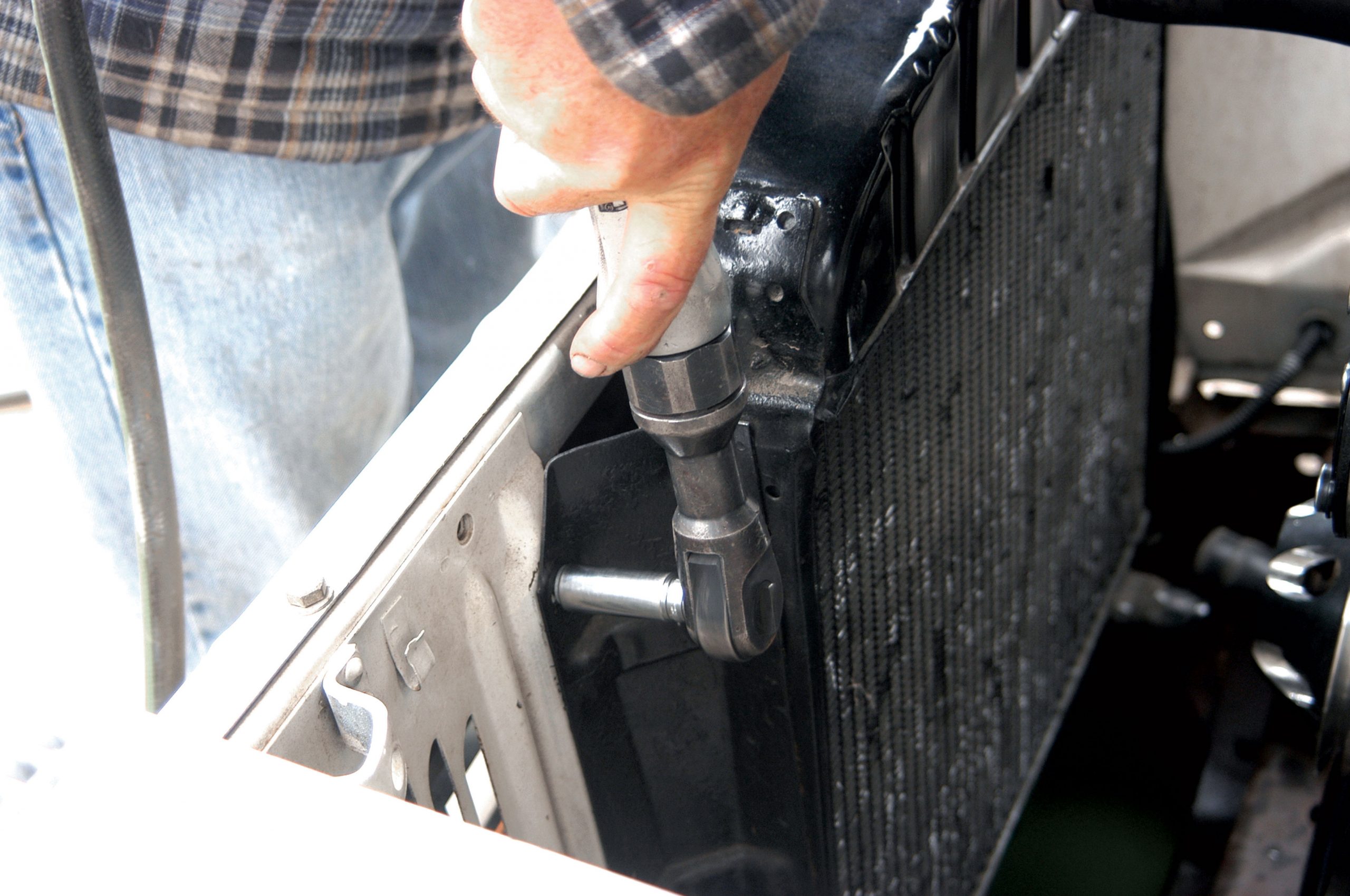 The radiator-to-core support bolts were removed with a power socket wrench and a 1/2-inch socket.