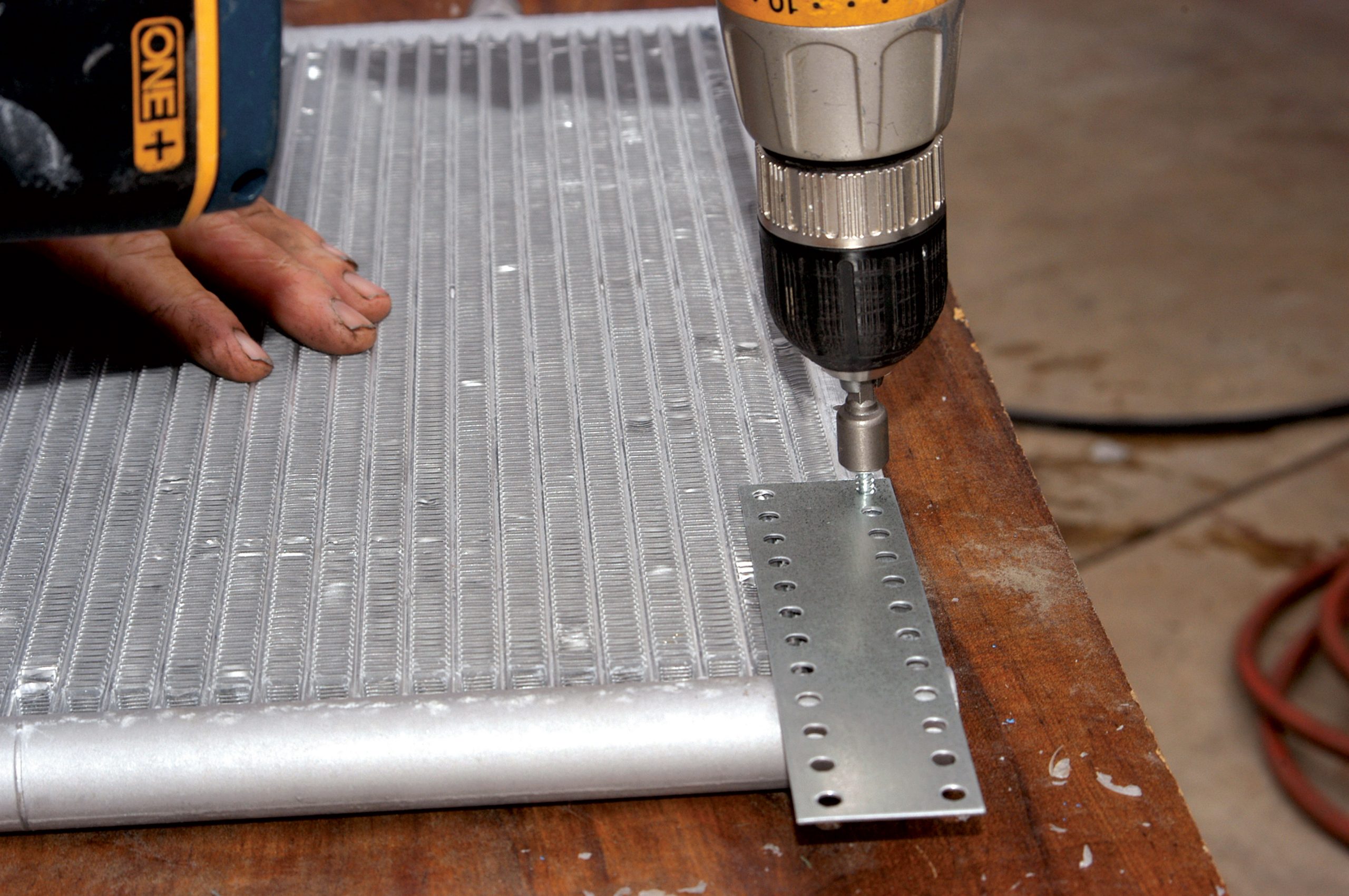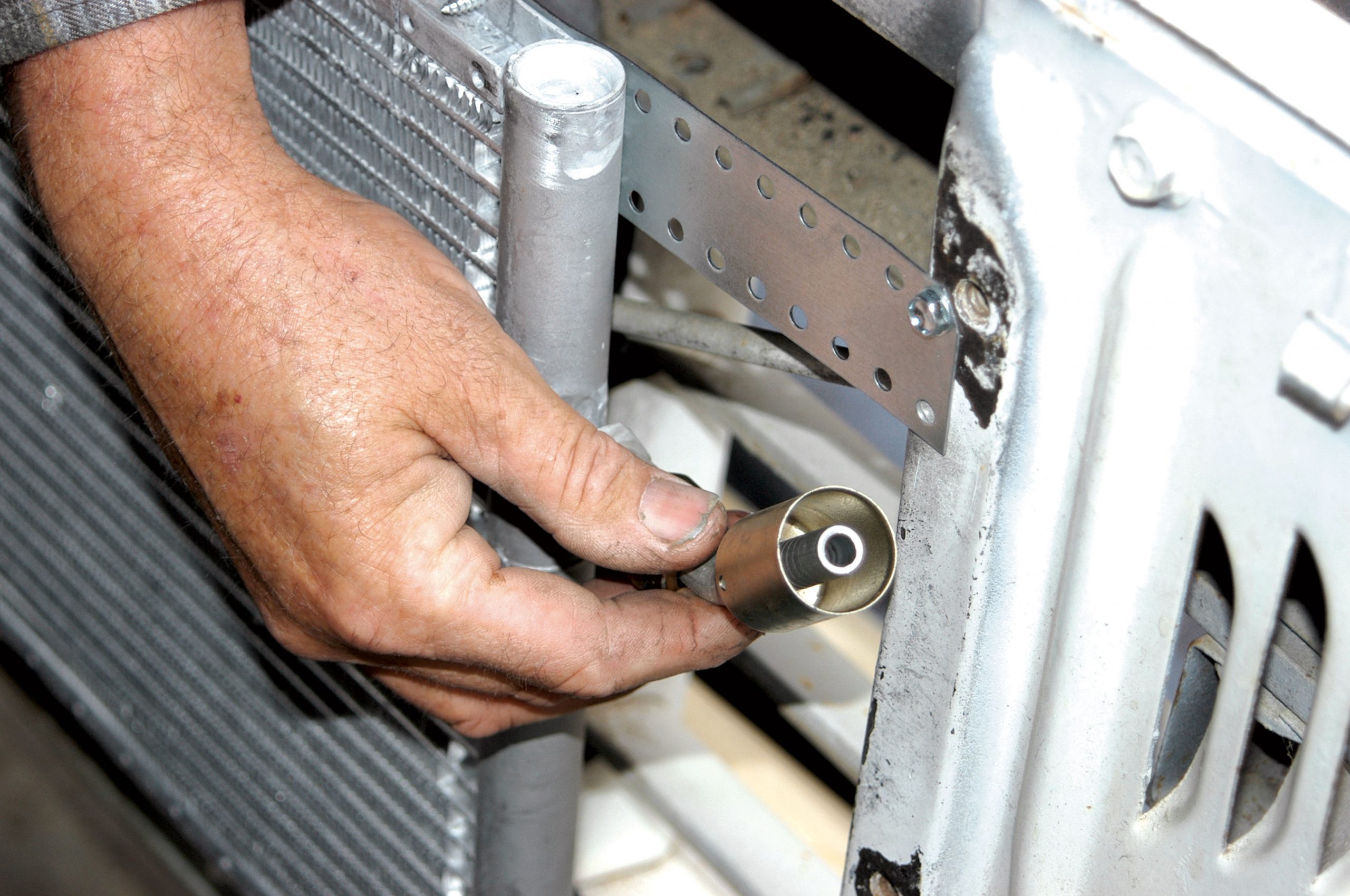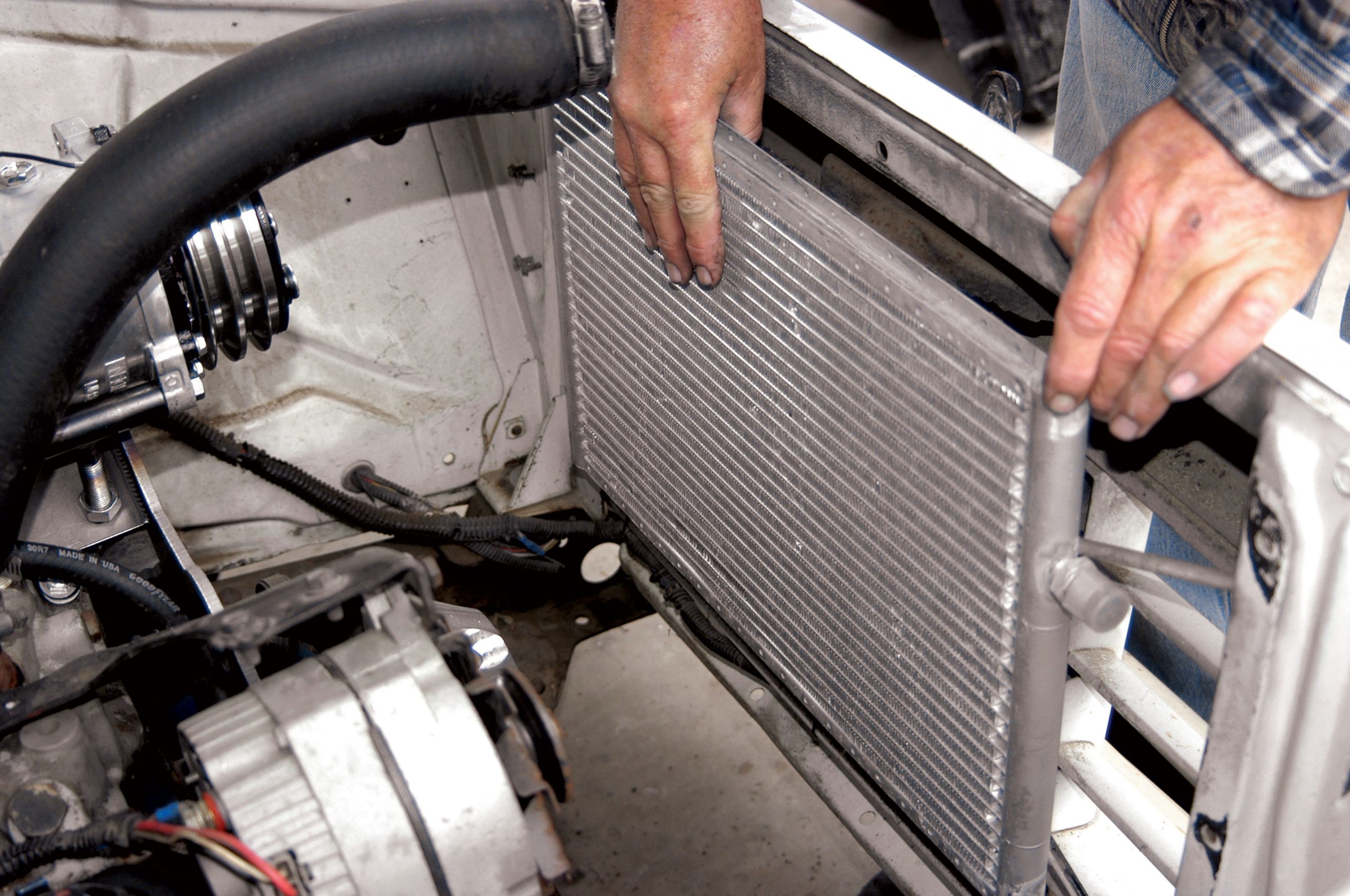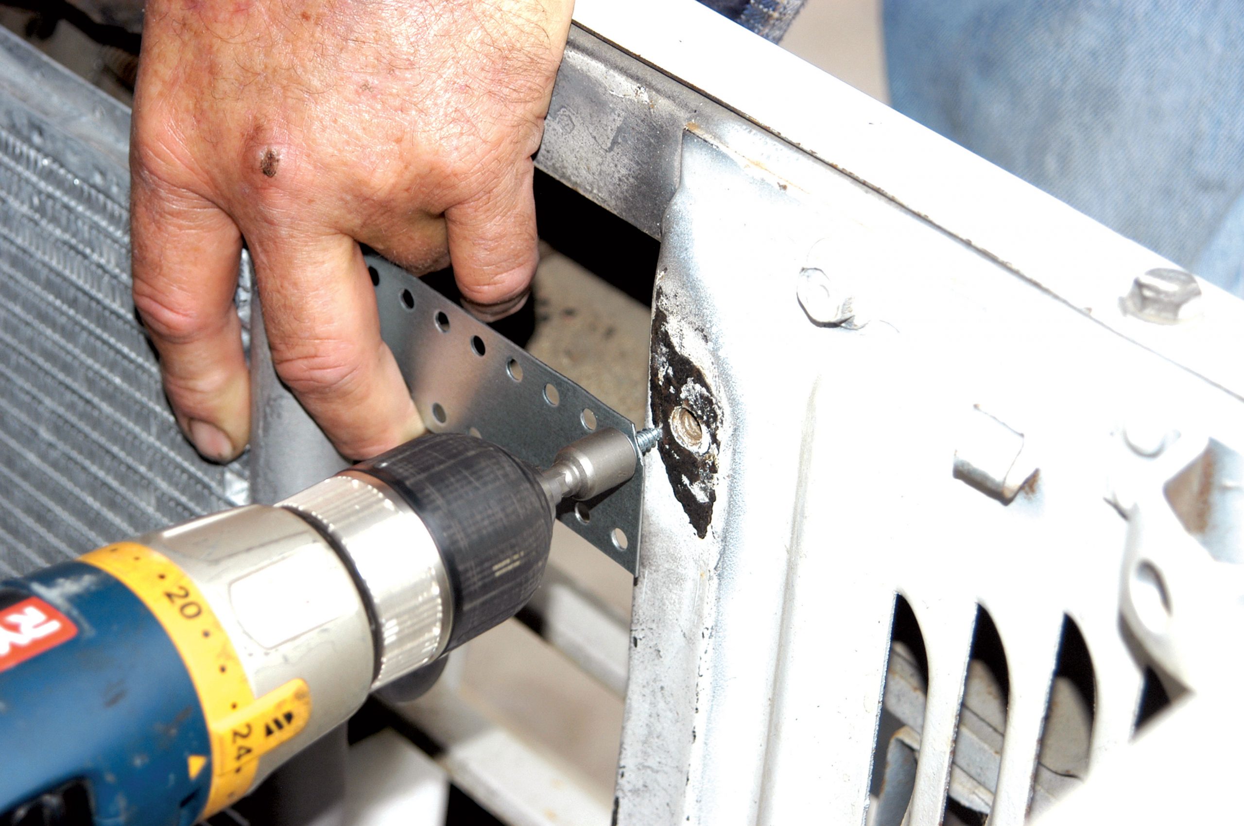 Using the self-tapping sheetmetal screws, the condenser was connected to the core support. If the brackets look lightweight, you’re right. However, the condenser doesn’t weigh much, and it is used to lower the temperature of a gas, which is not a heavy liquid.