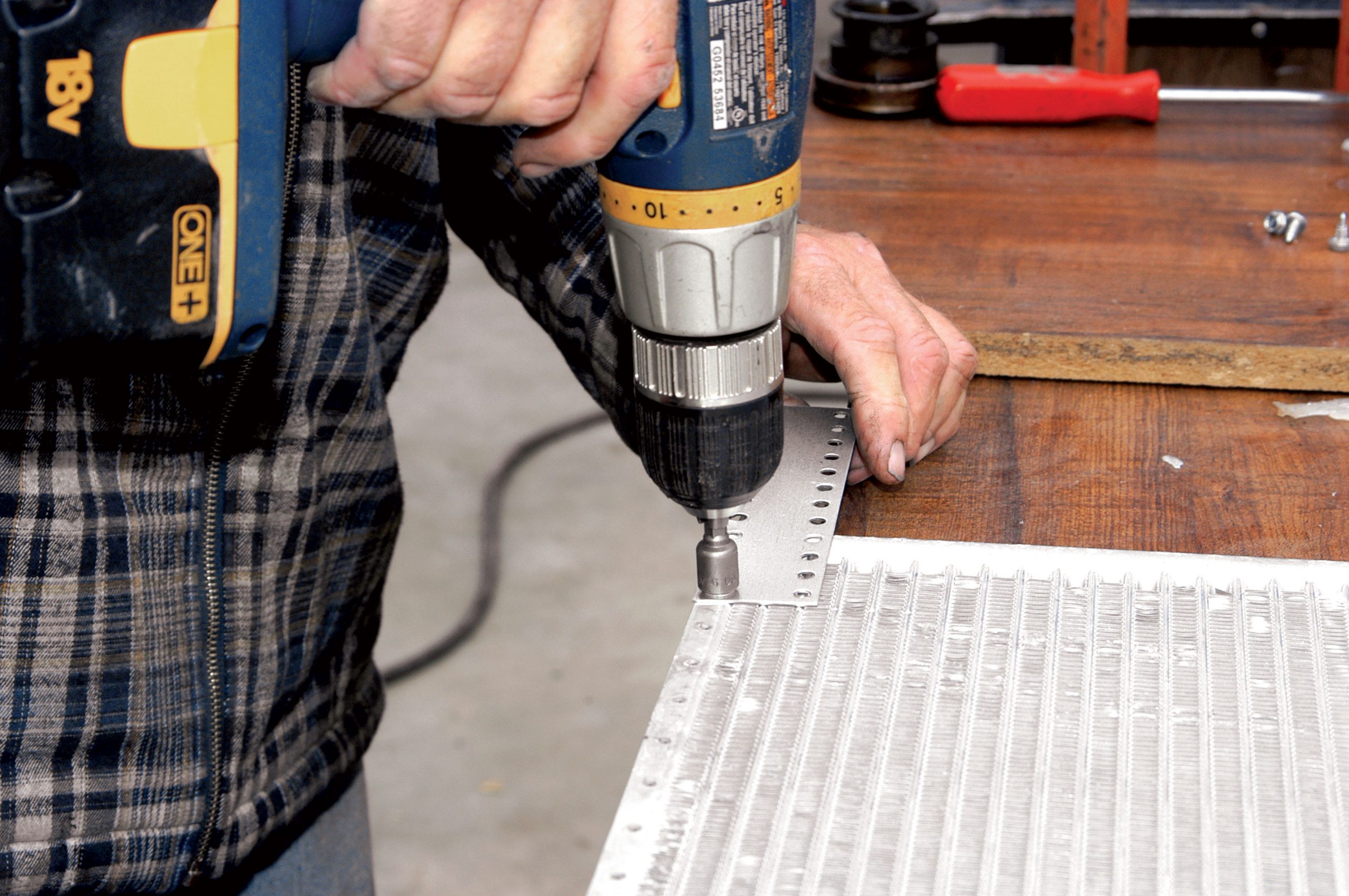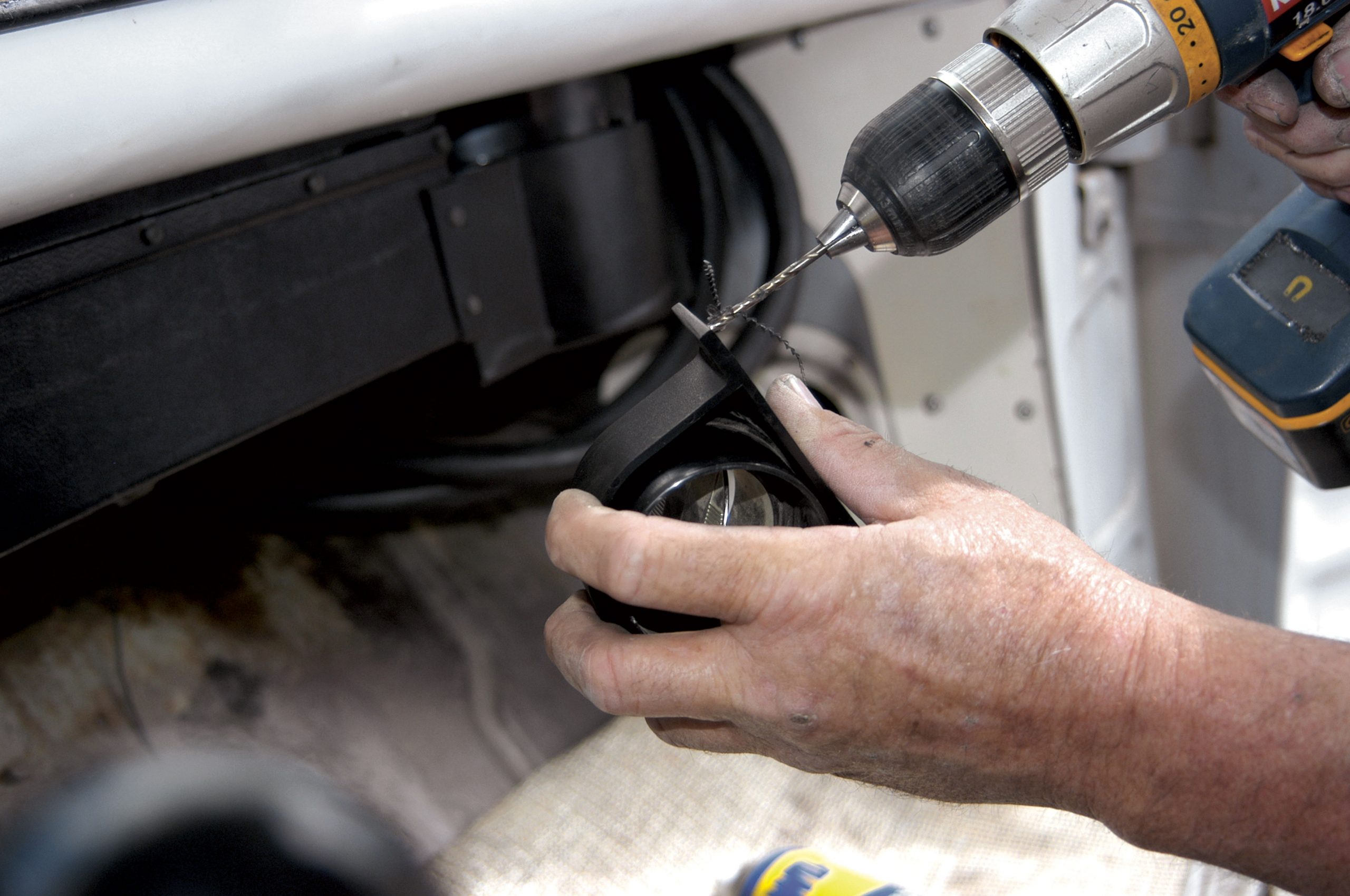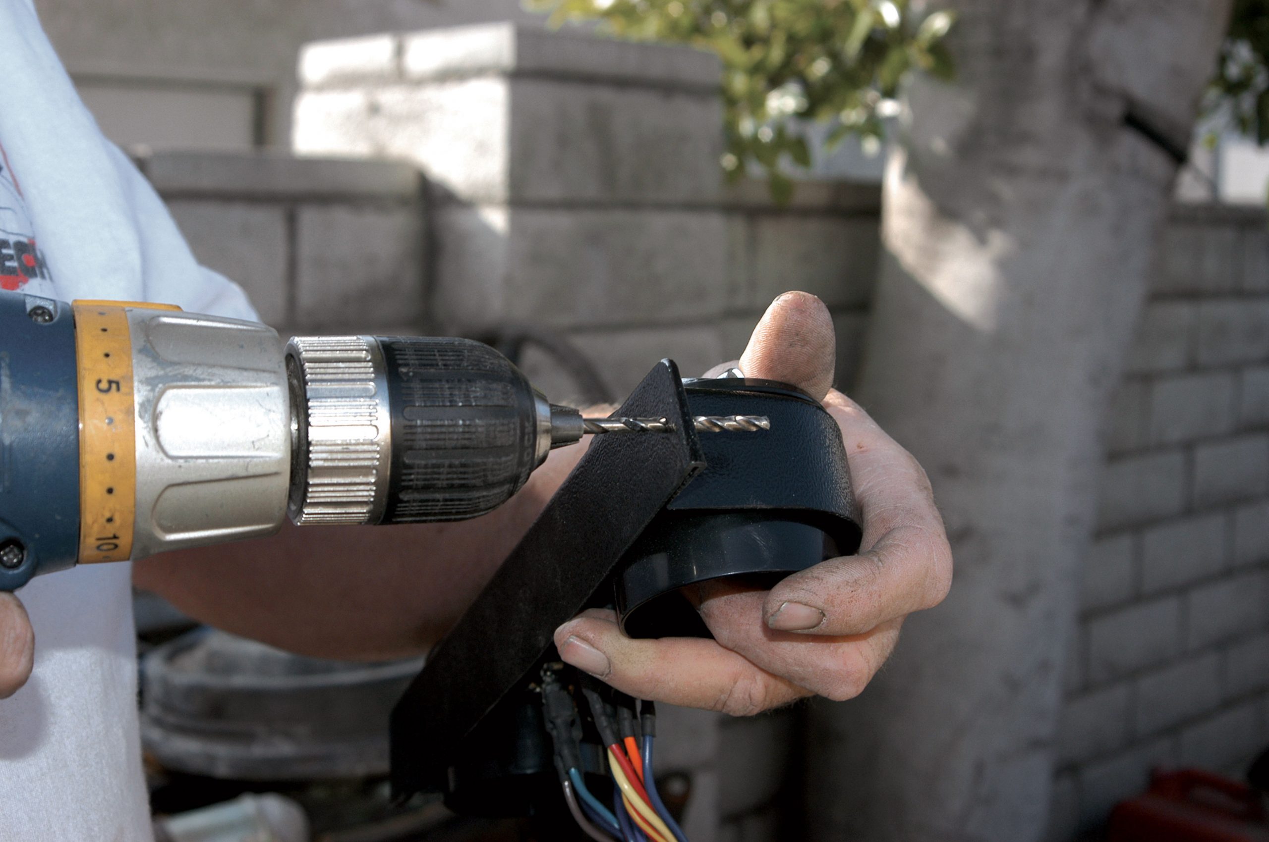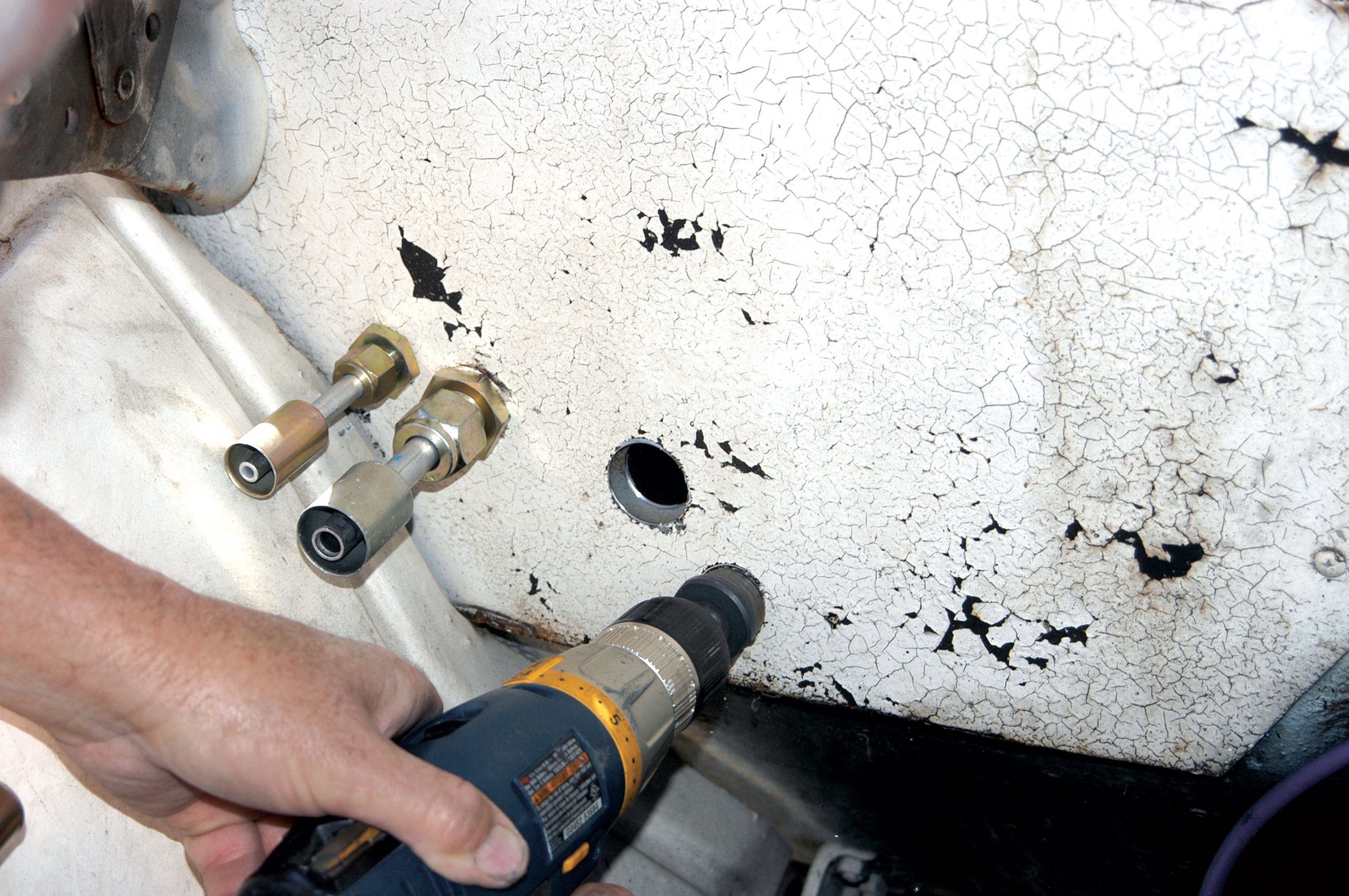 The A/C lines have to pass through the firewall, and that is done using bulkhead fittings. Here, one of the holes for the fittings is drilled with a step drill.