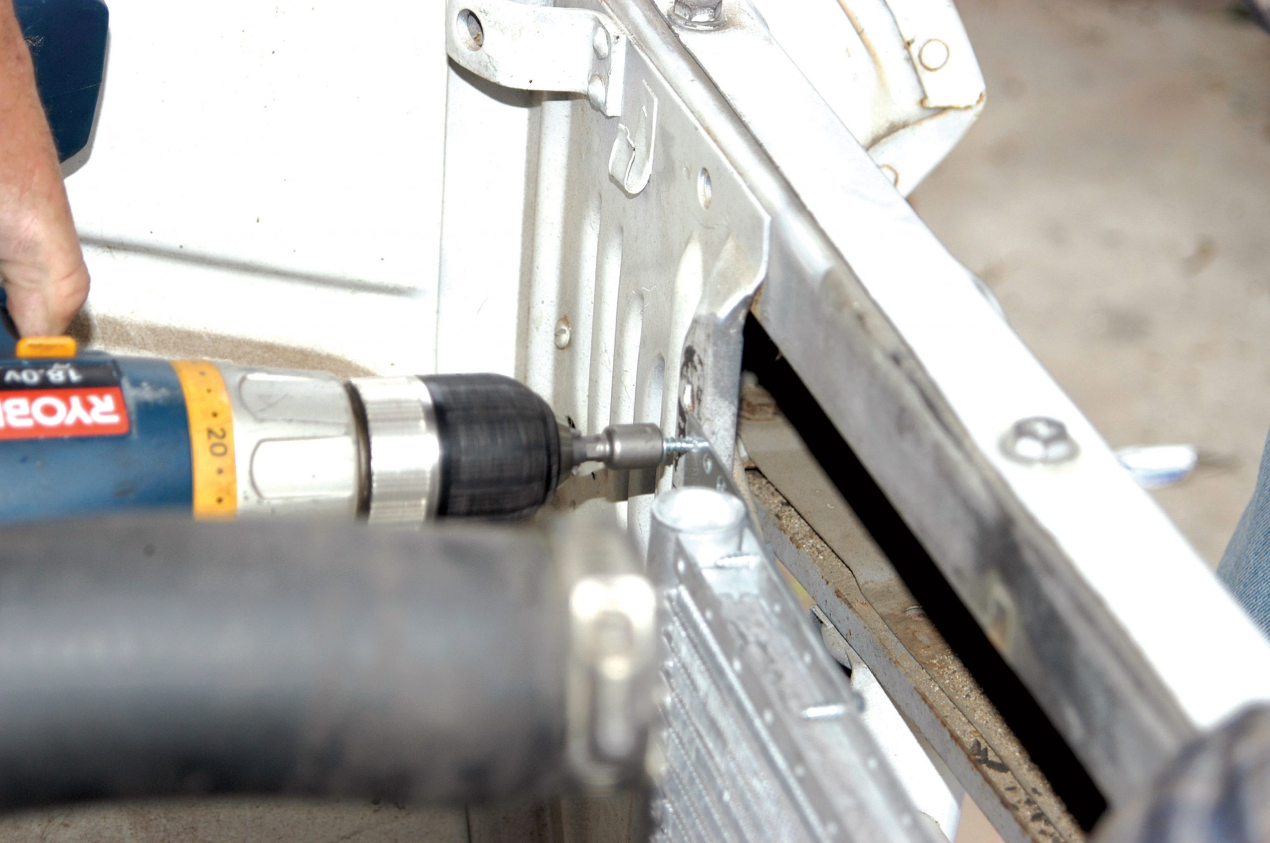 The radiator is connected to the core support using a power ratchet wrench and a 1/2-inch socket.
