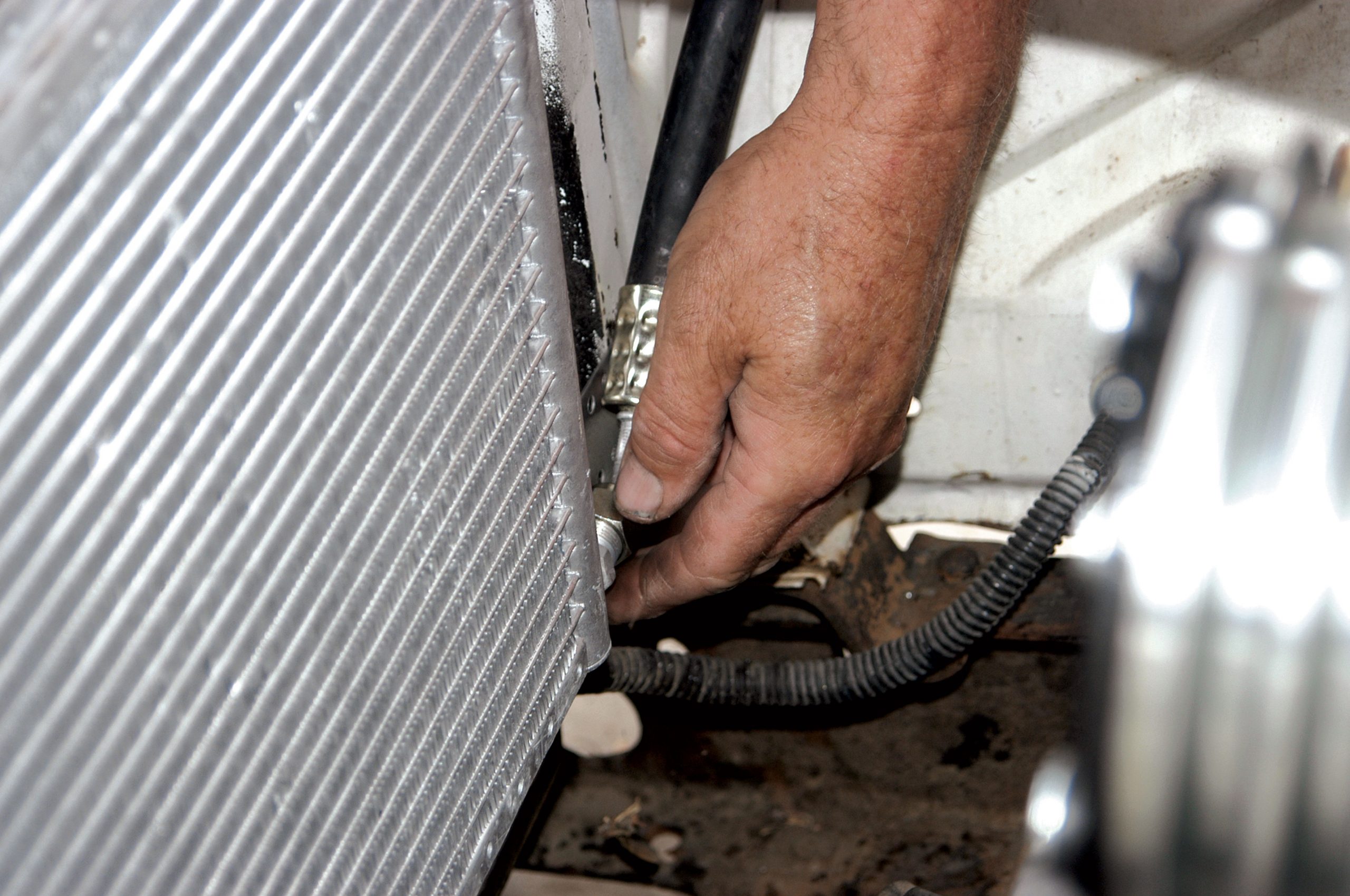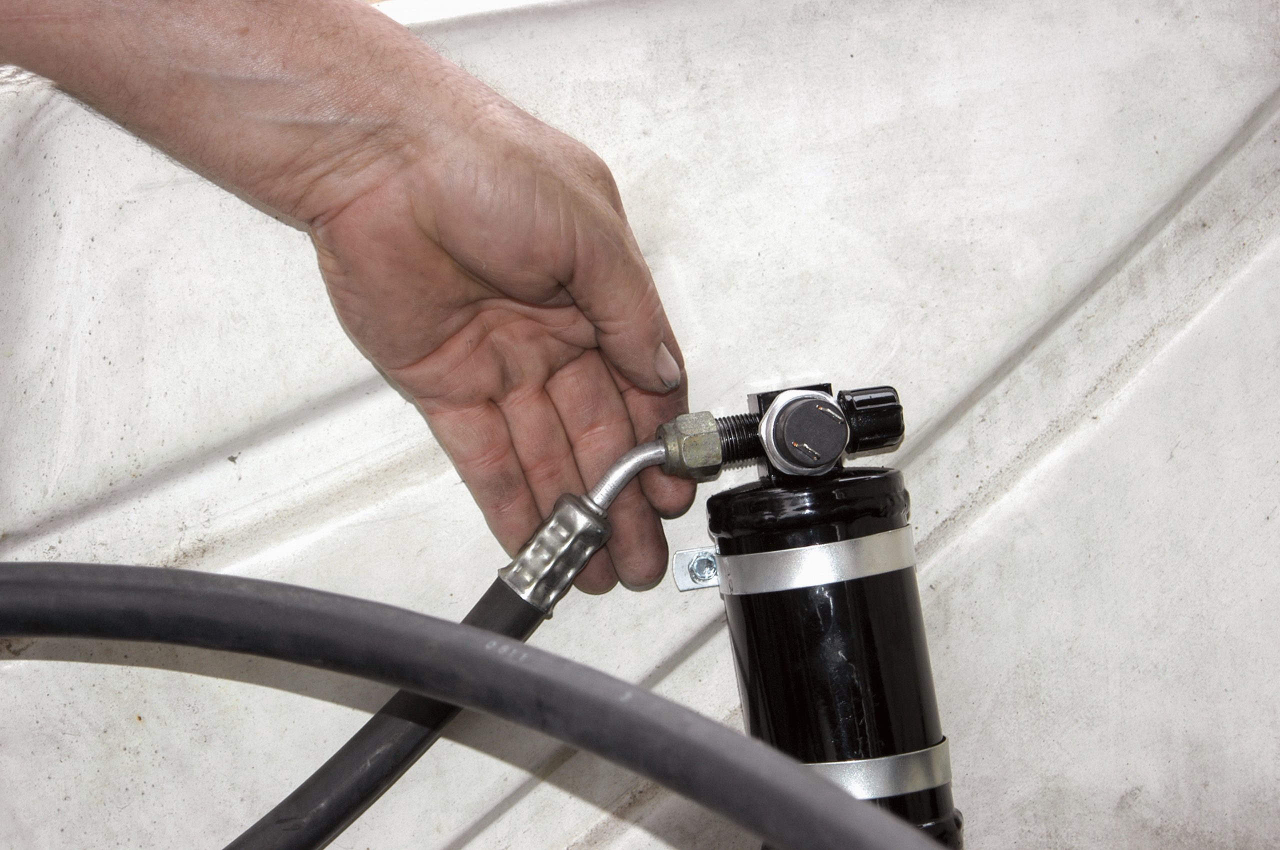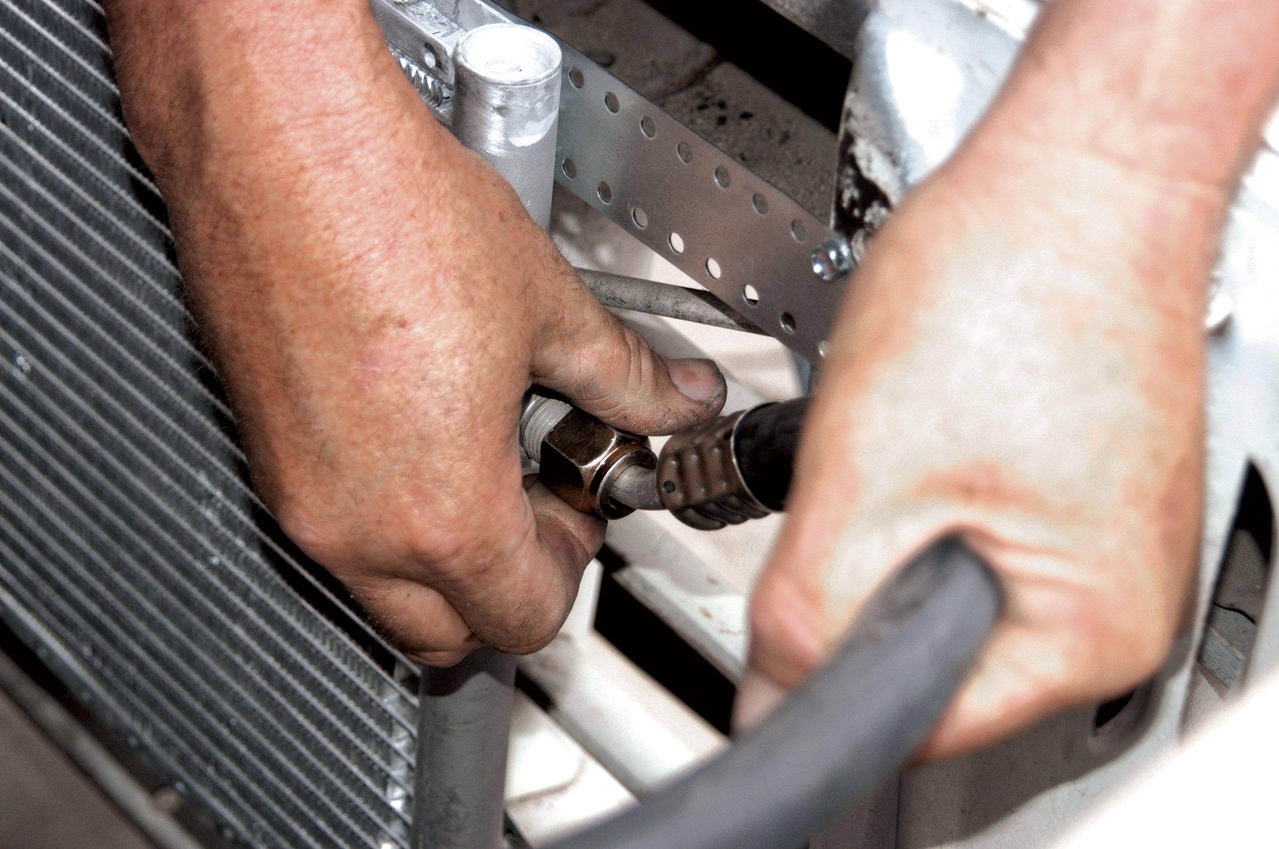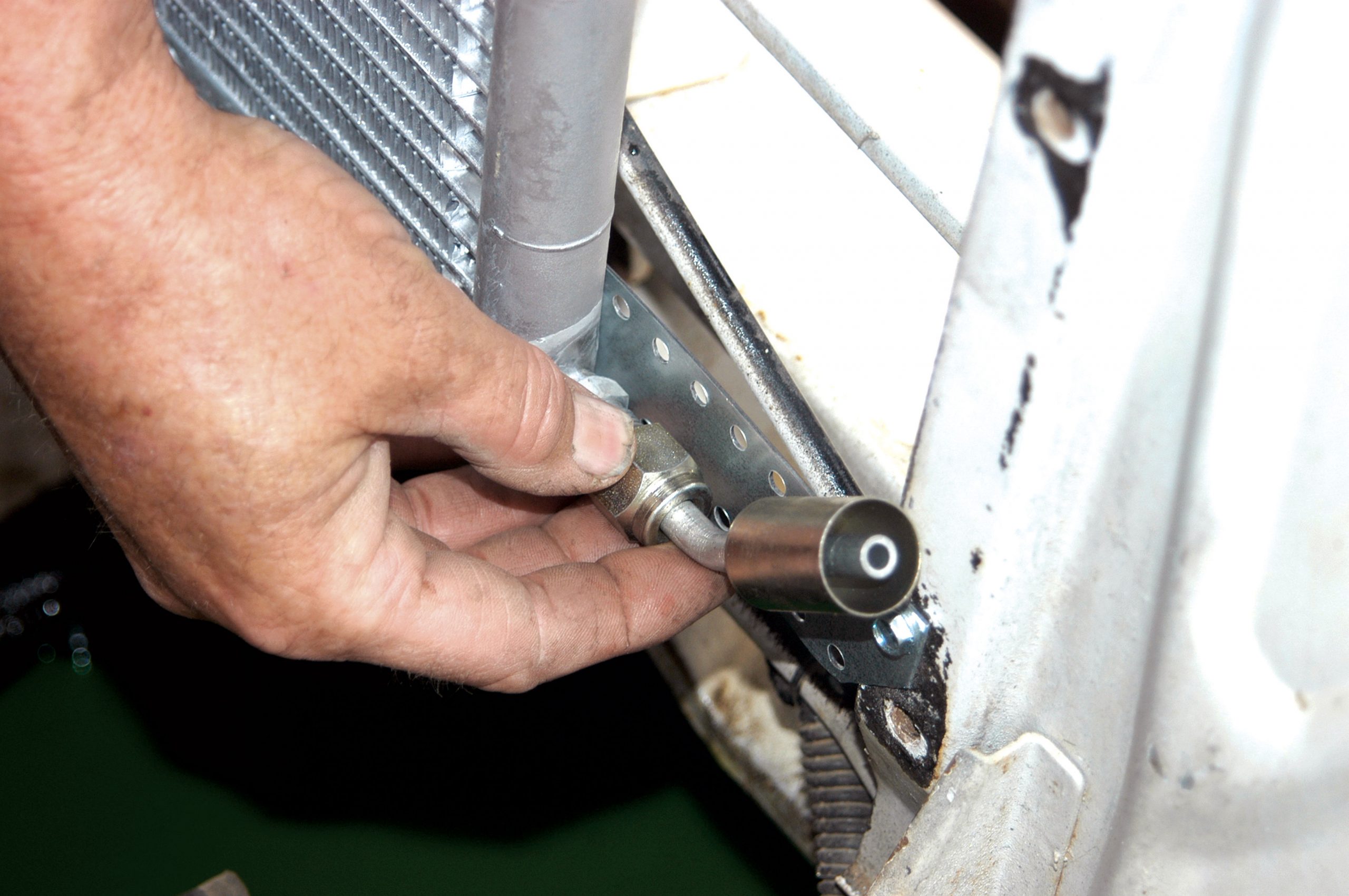 The other side of the hose was connected to the condenser. Here it is being connected fingertight.