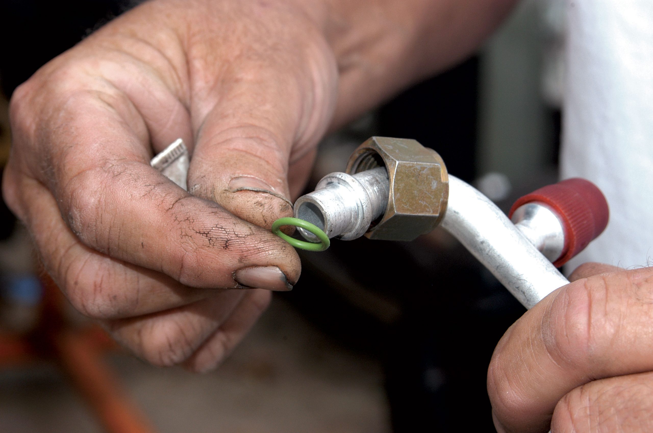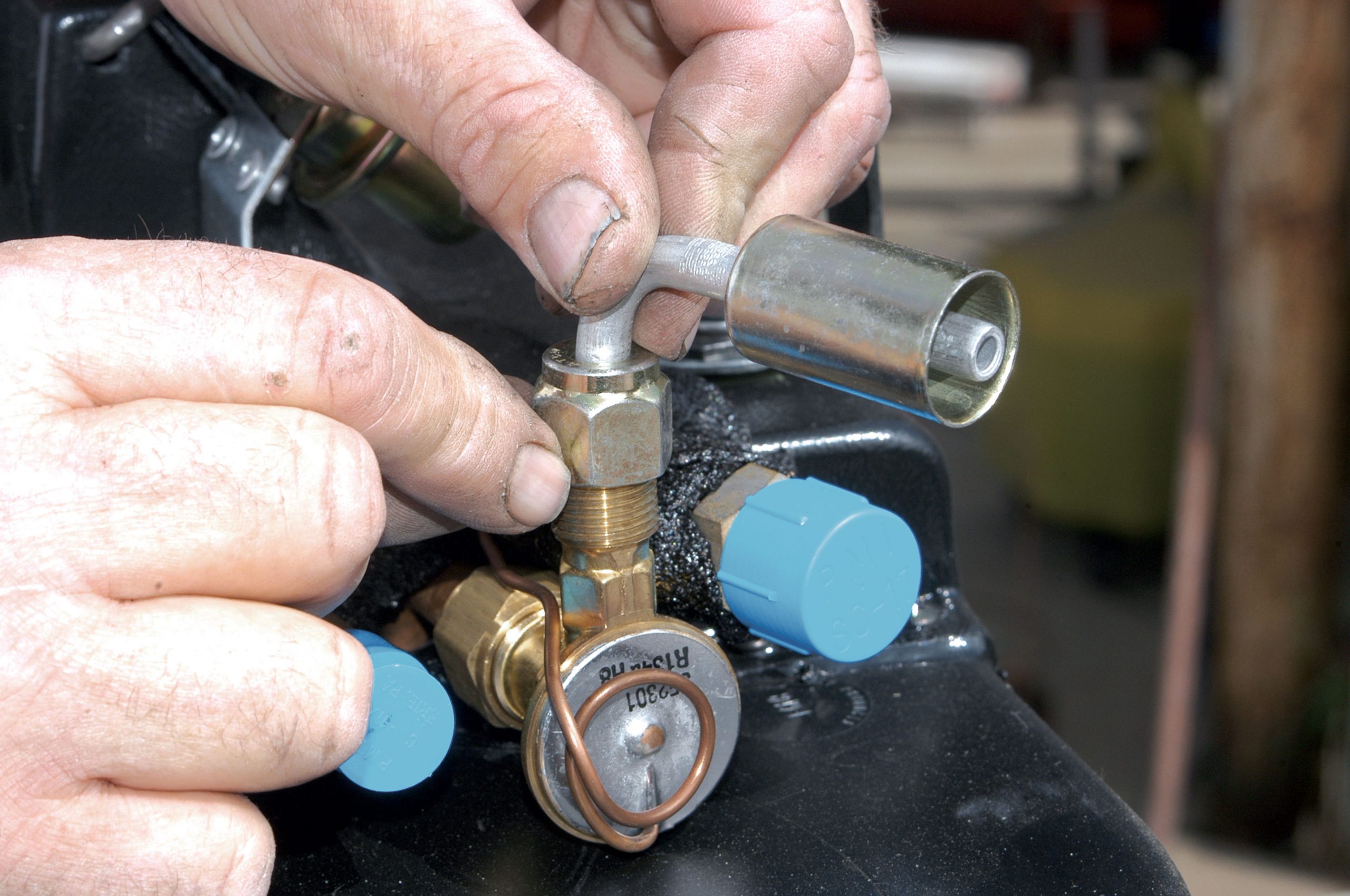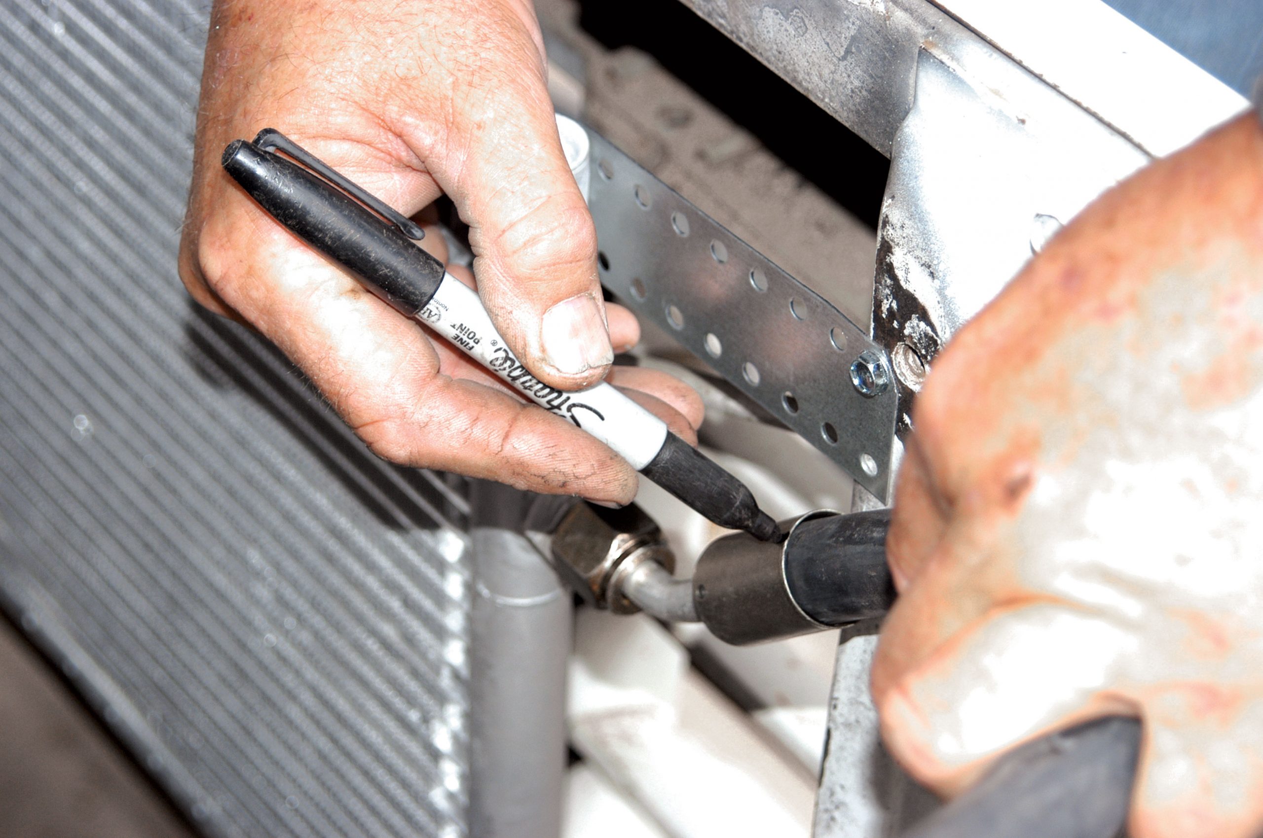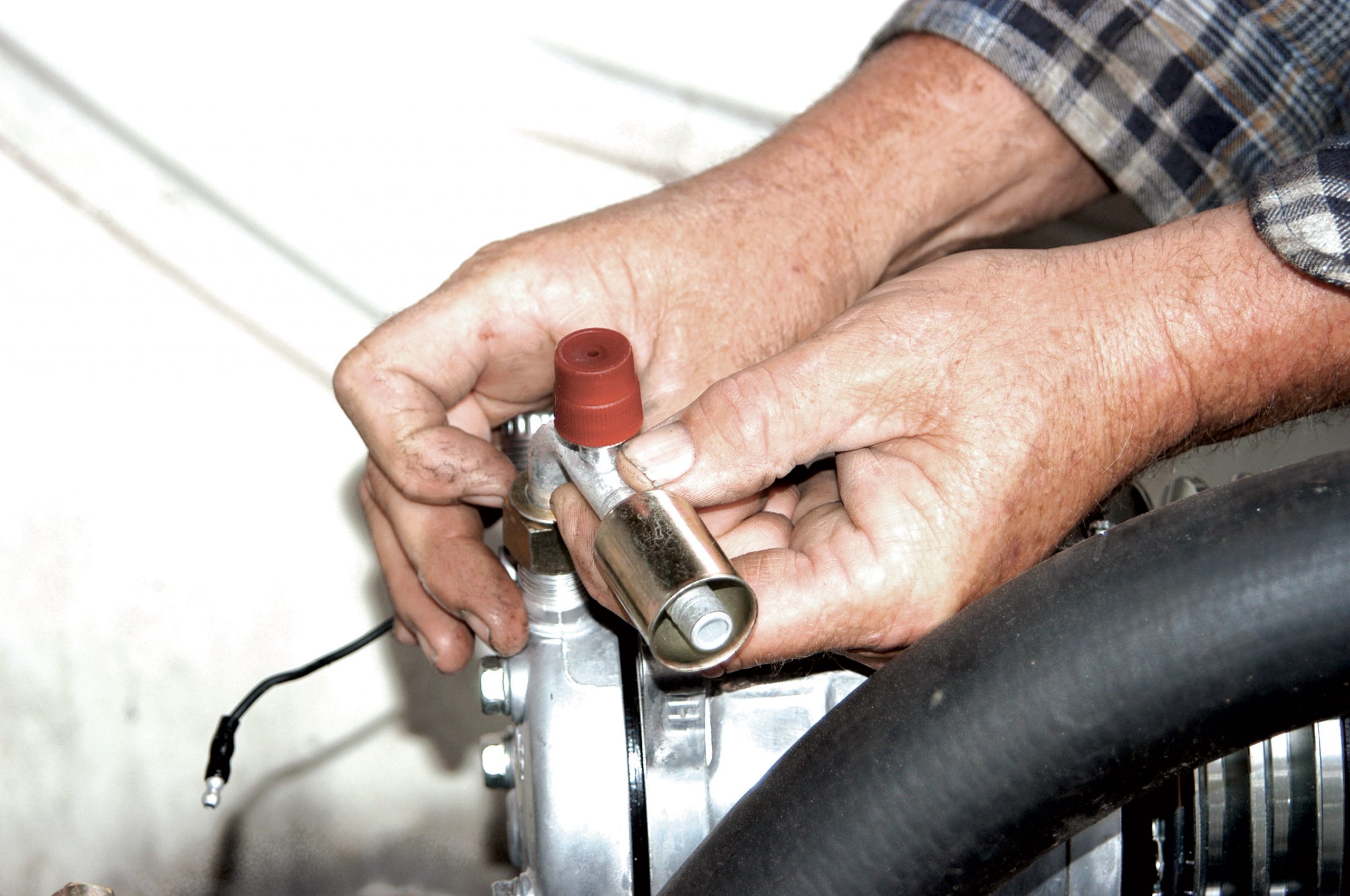 The other side of the hose was connected to the condenser. Here it is being connected fingertight.