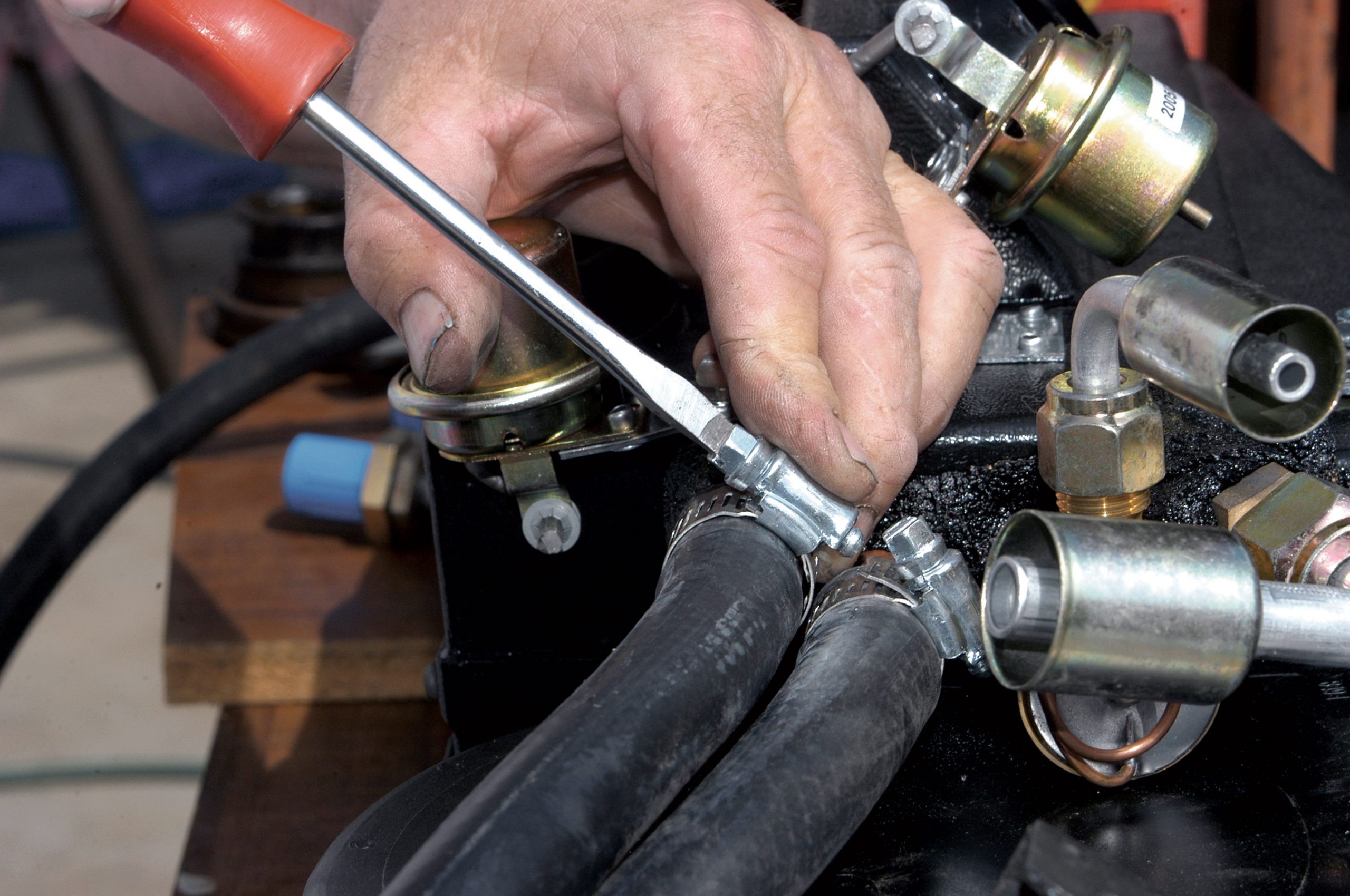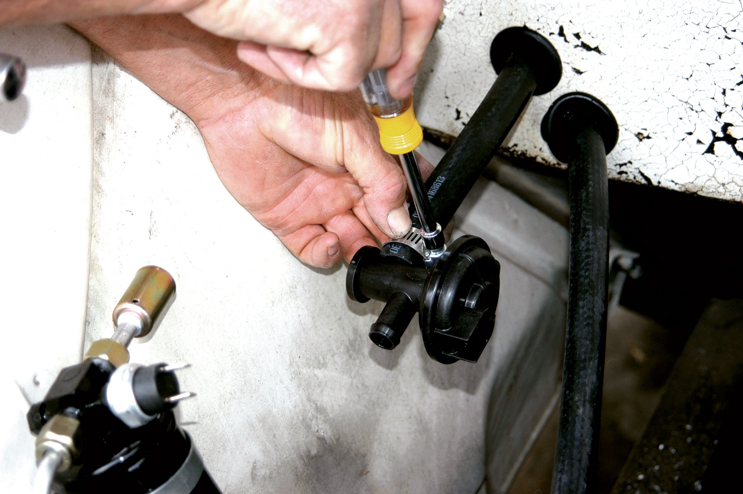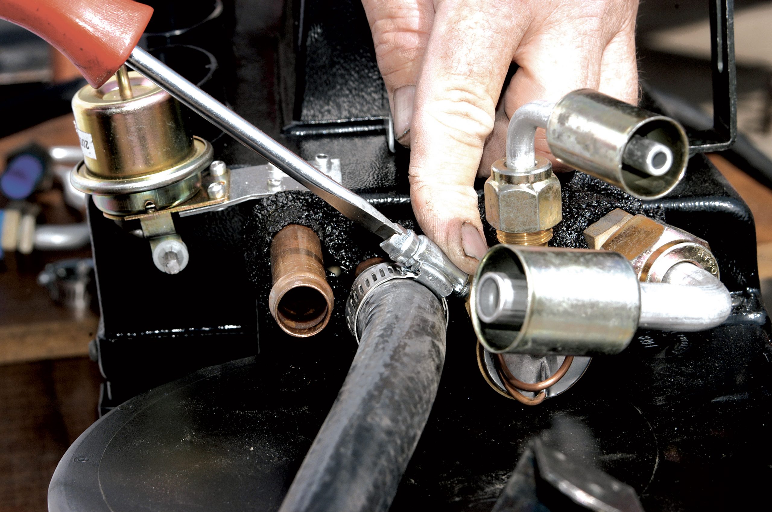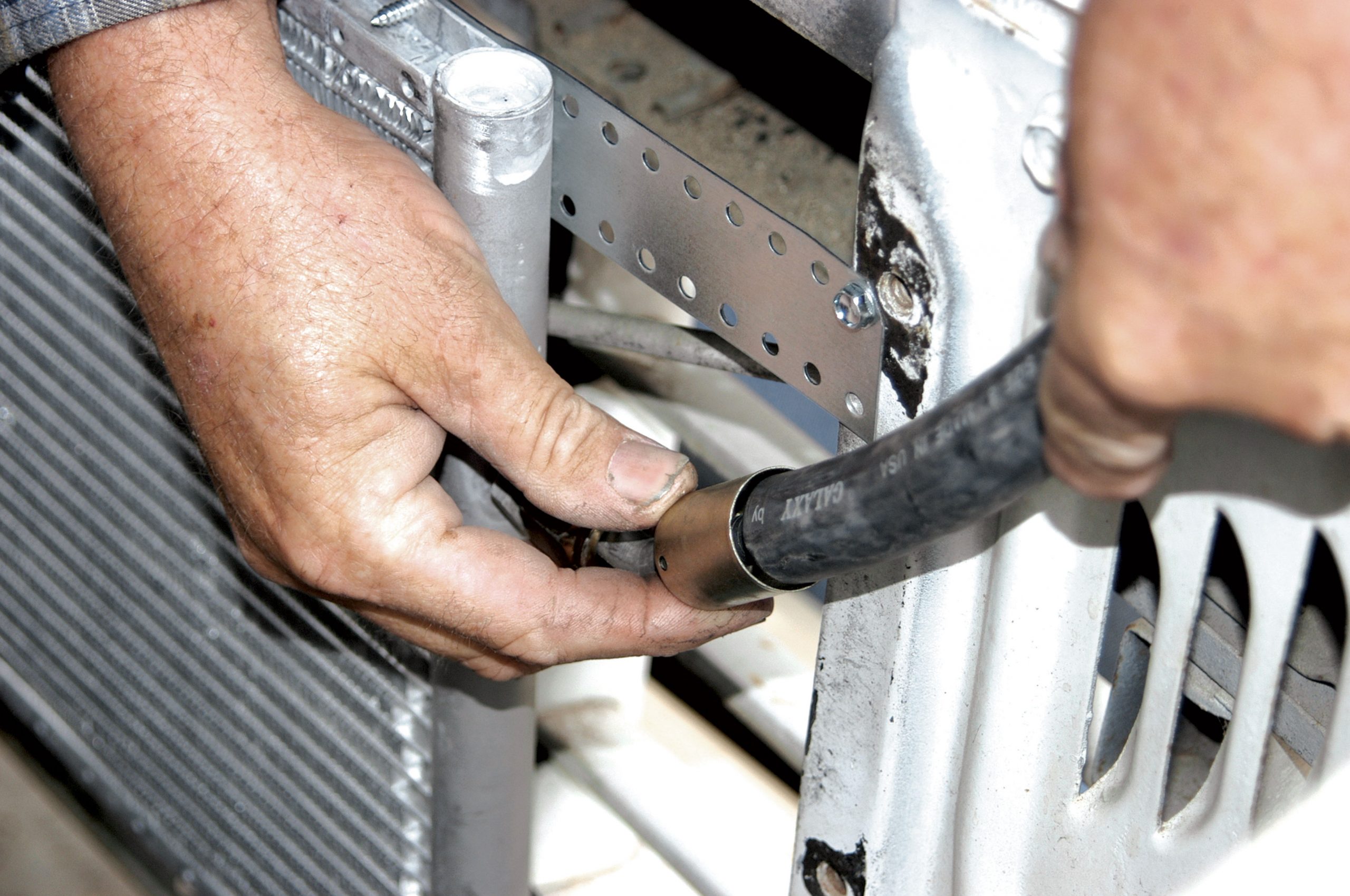A long length of 5/8-inch radiator hose was cut in half and then both lengths were connected to the evaporator. Here, the clamps are tightened with a screwdriver.