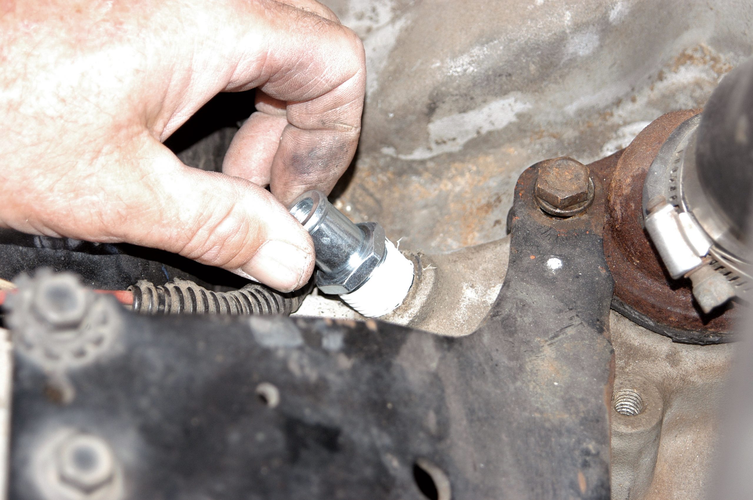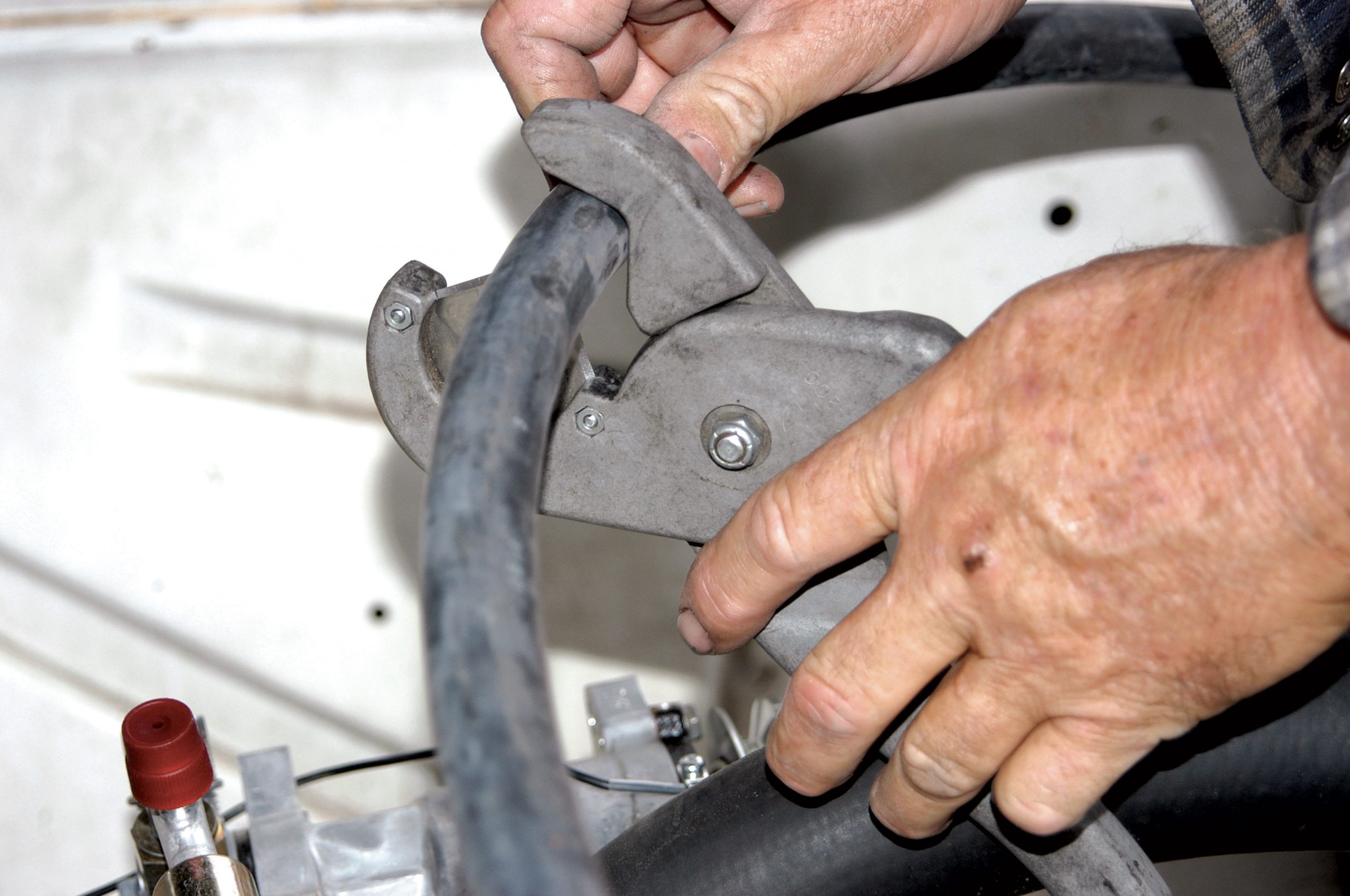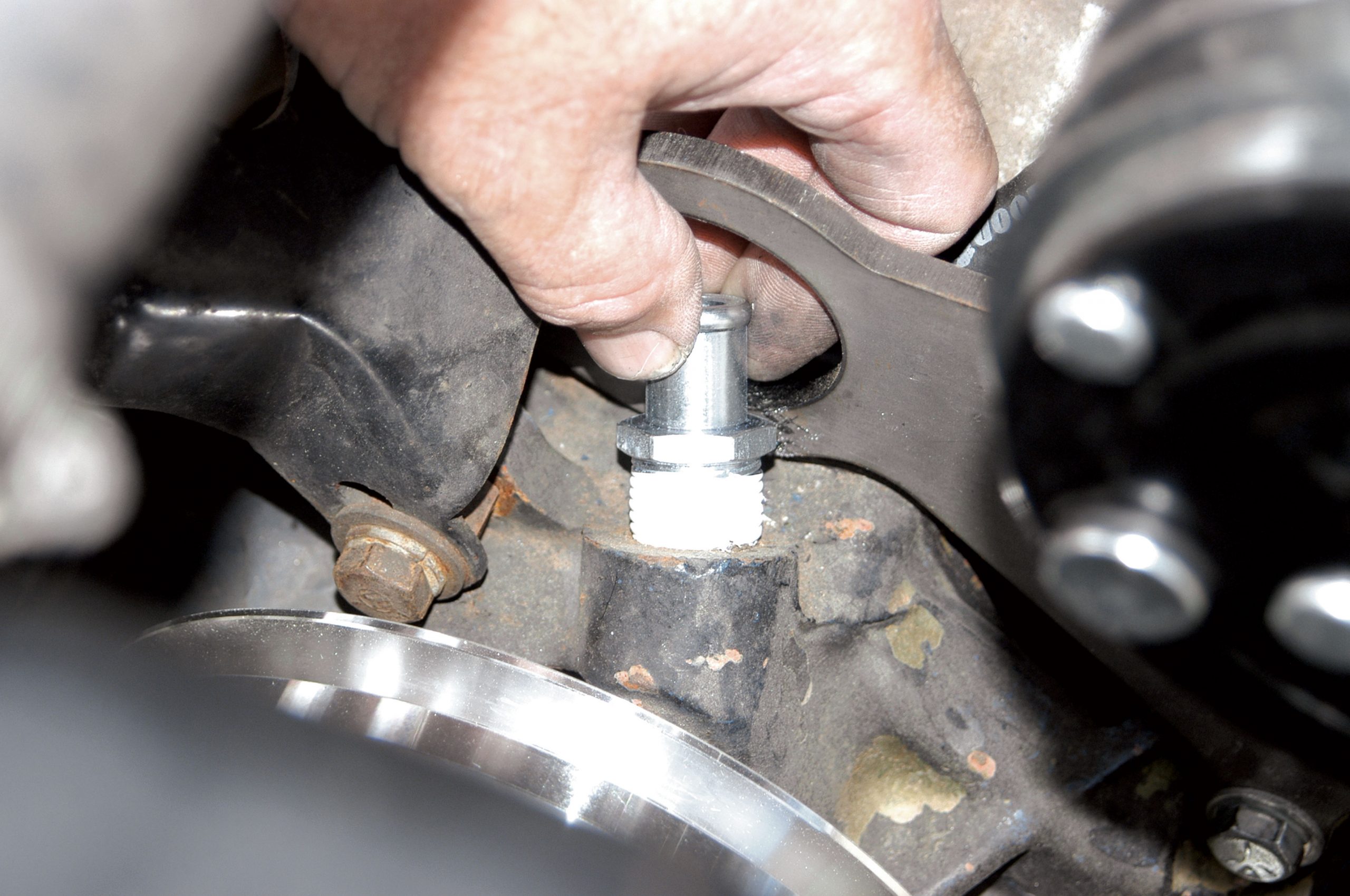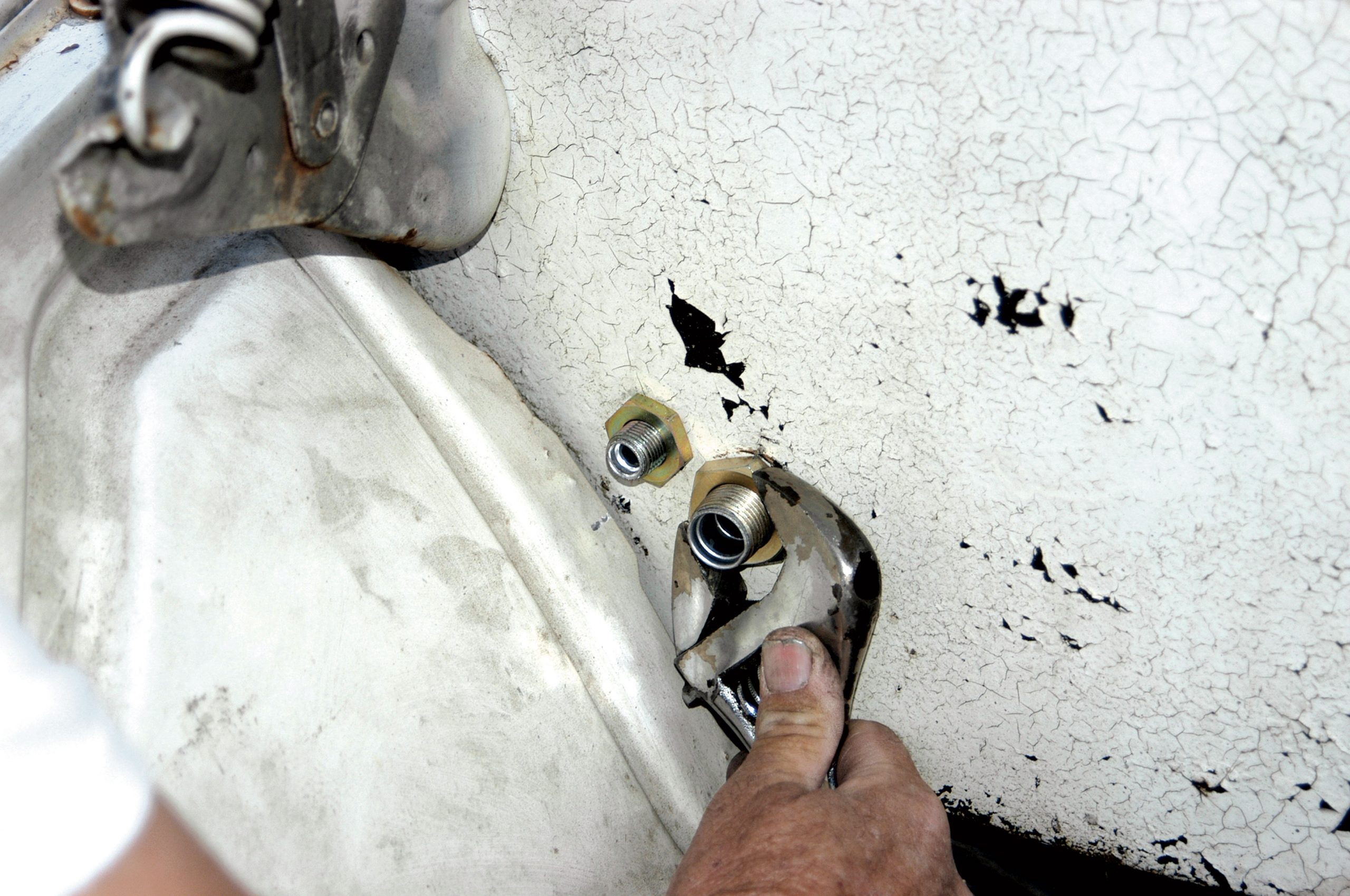 After the hole was drilled to size, the larger fitting was installed in the firewall. Here, the large nut is tightened with a crescent wrench