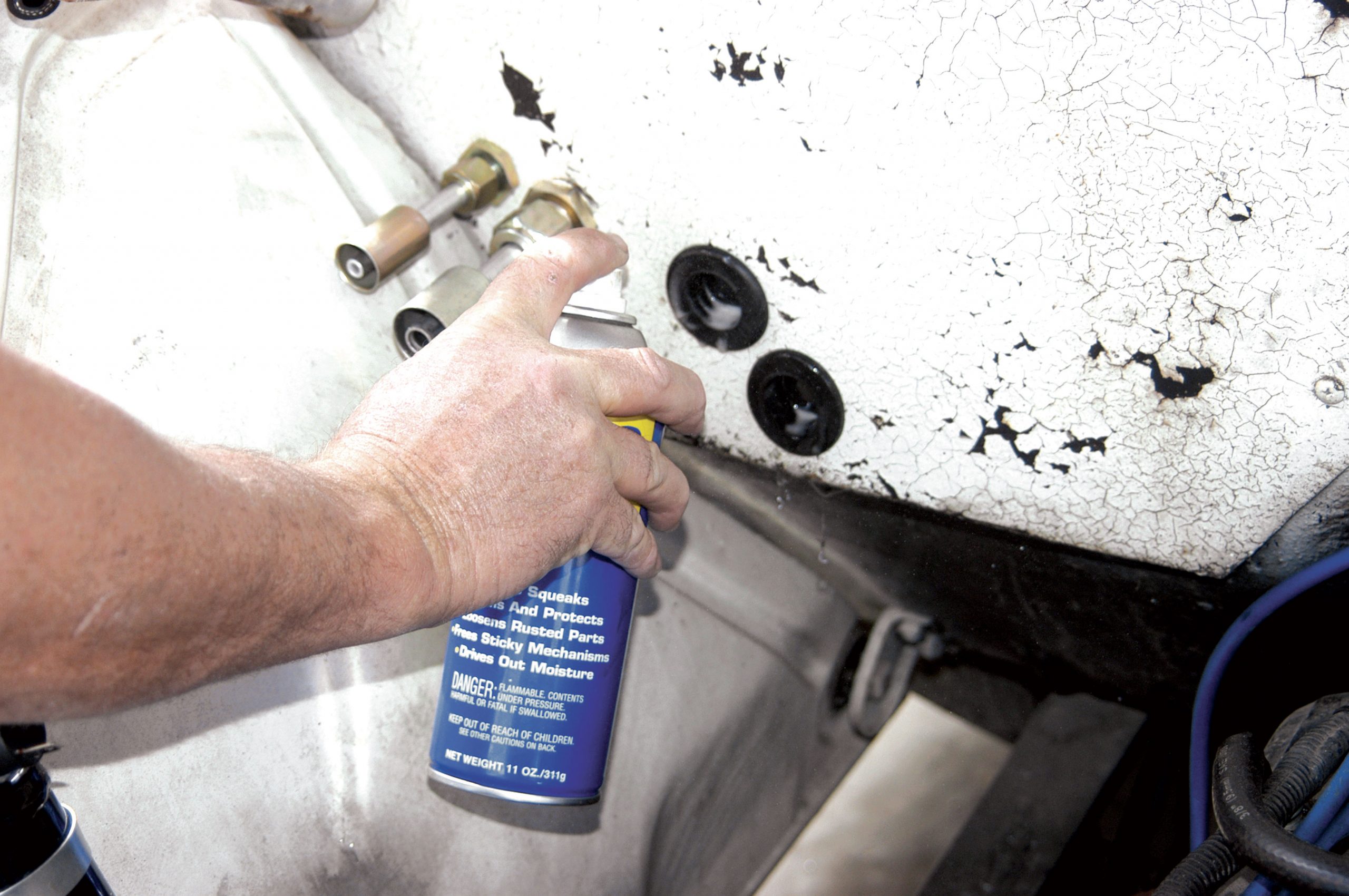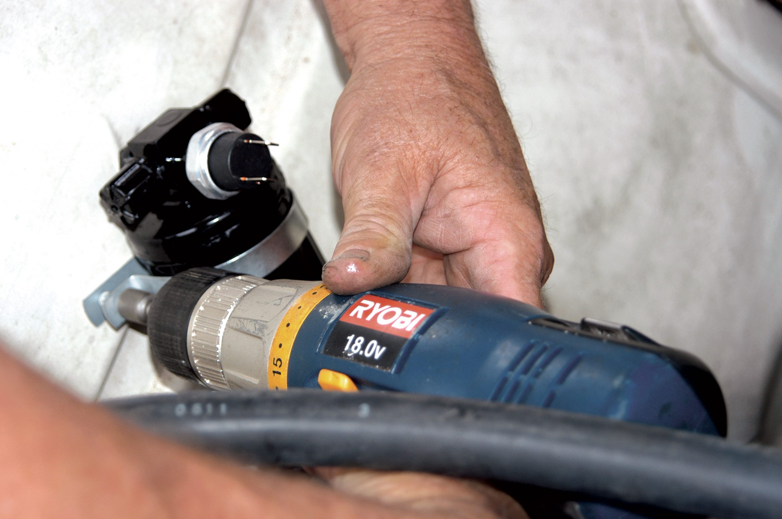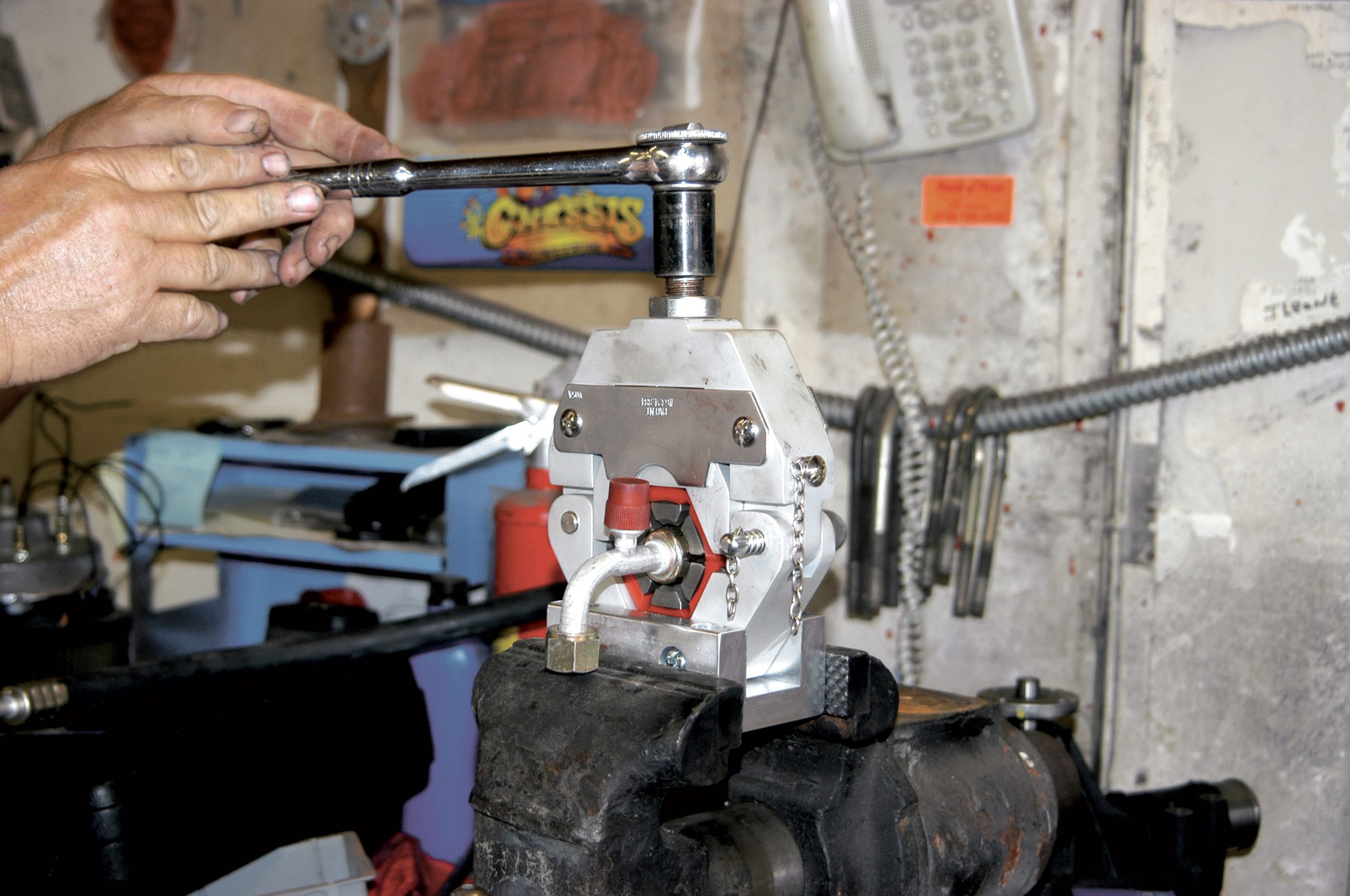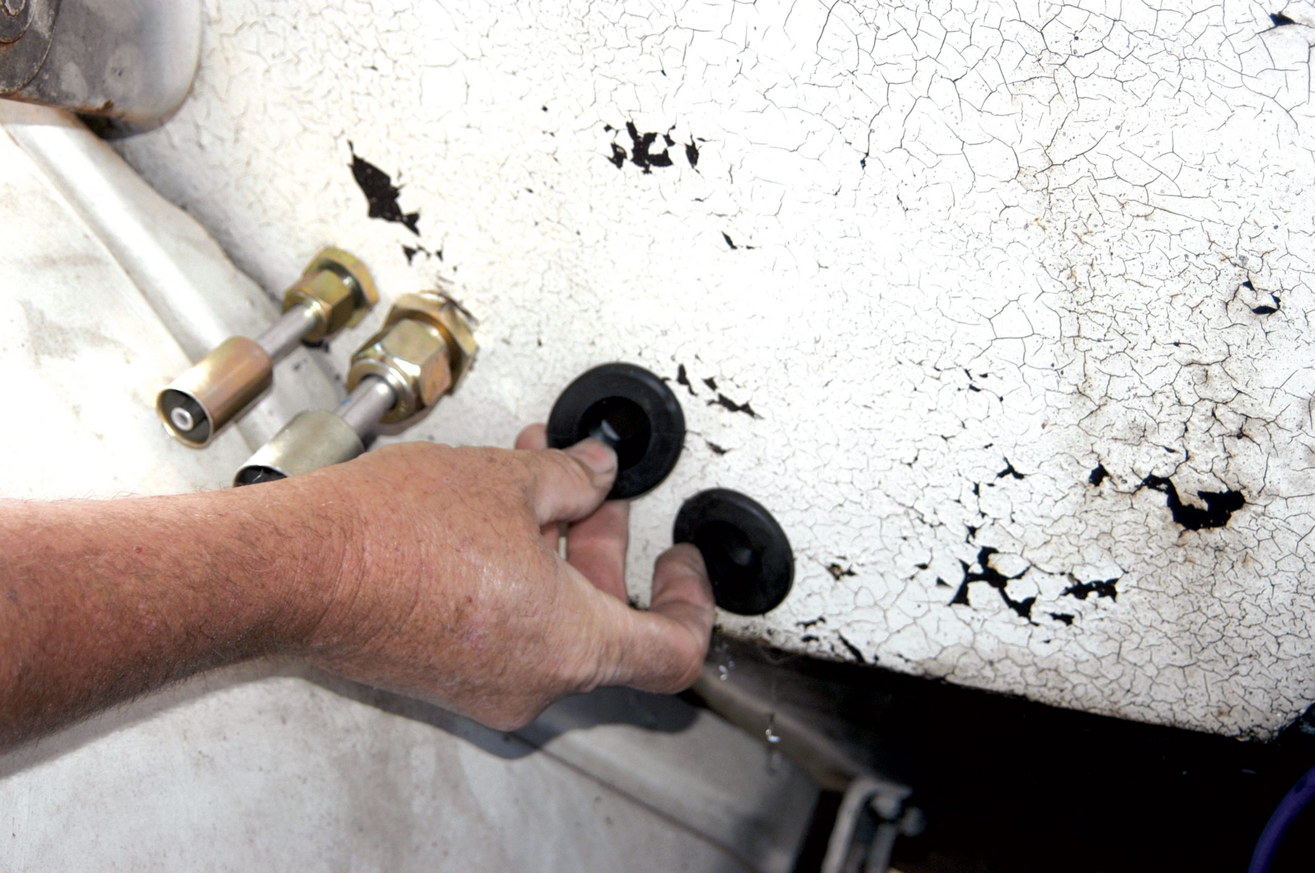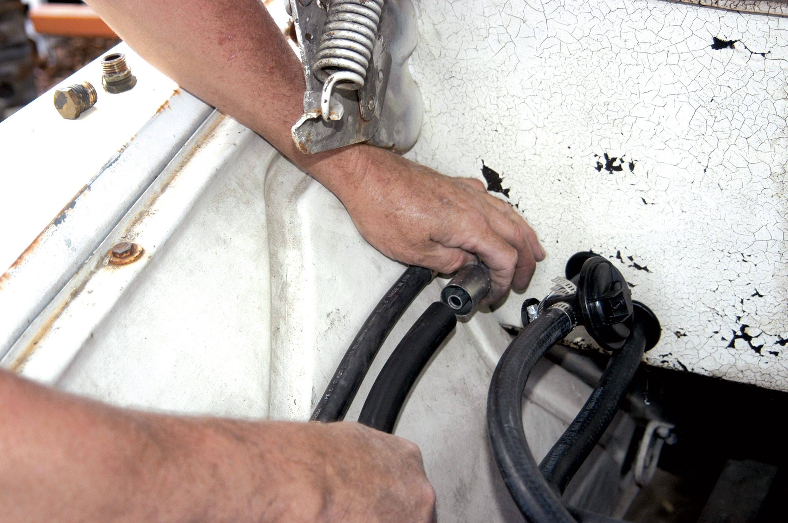 After the hole was drilled to size, the larger fitting was installed in the firewall. Here, the large nut is tightened with a crescent wrench