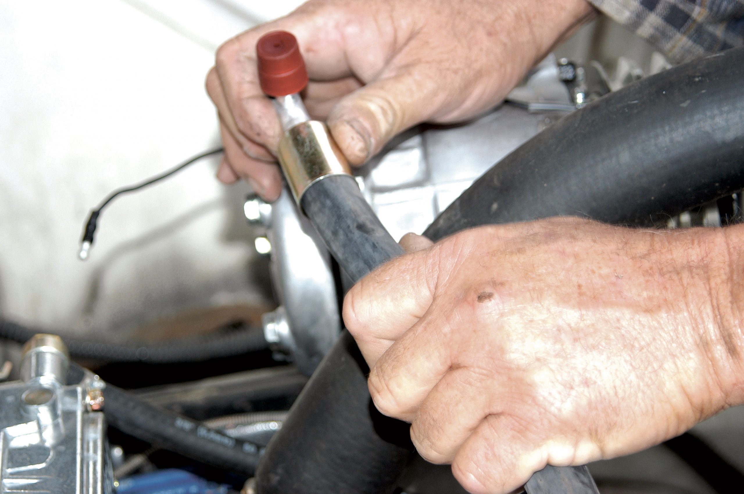 The heater control valve has to be installed in the radiator-hose inlet line. Here, a good mounting position for the fitting is found.