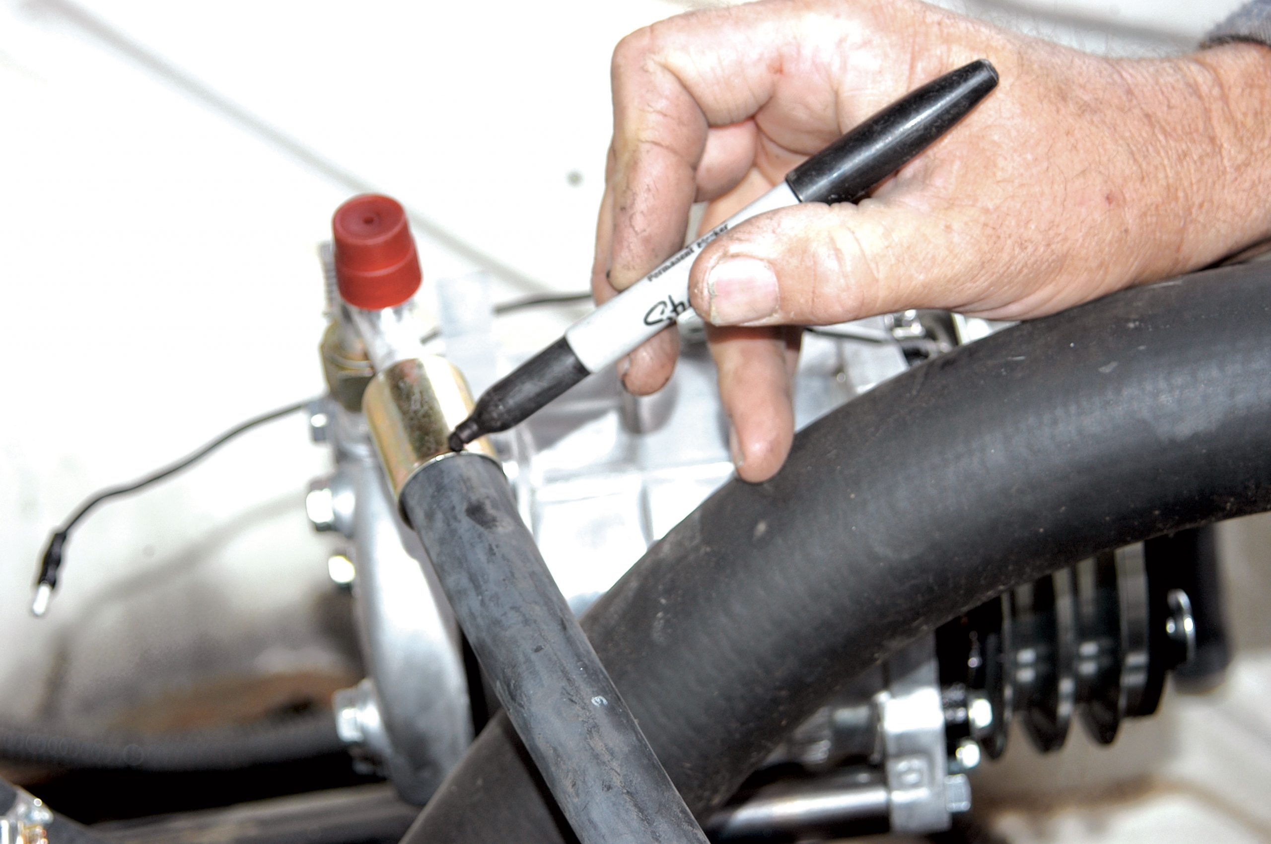 The other end of the heater hose was run to the fitting on the manifold and the measurement was taken. Here, the thumb marks the spot where the hose will be cut.