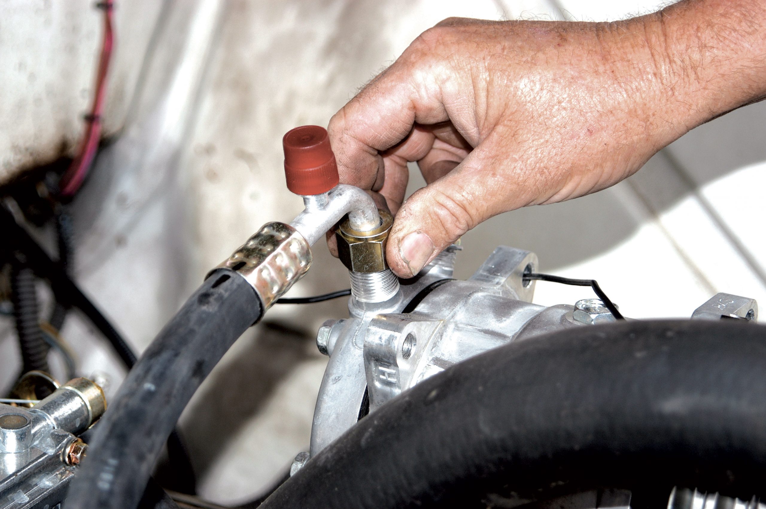 Here is the crimped fitting being installed to the compressor. The red cap covers the charging port.