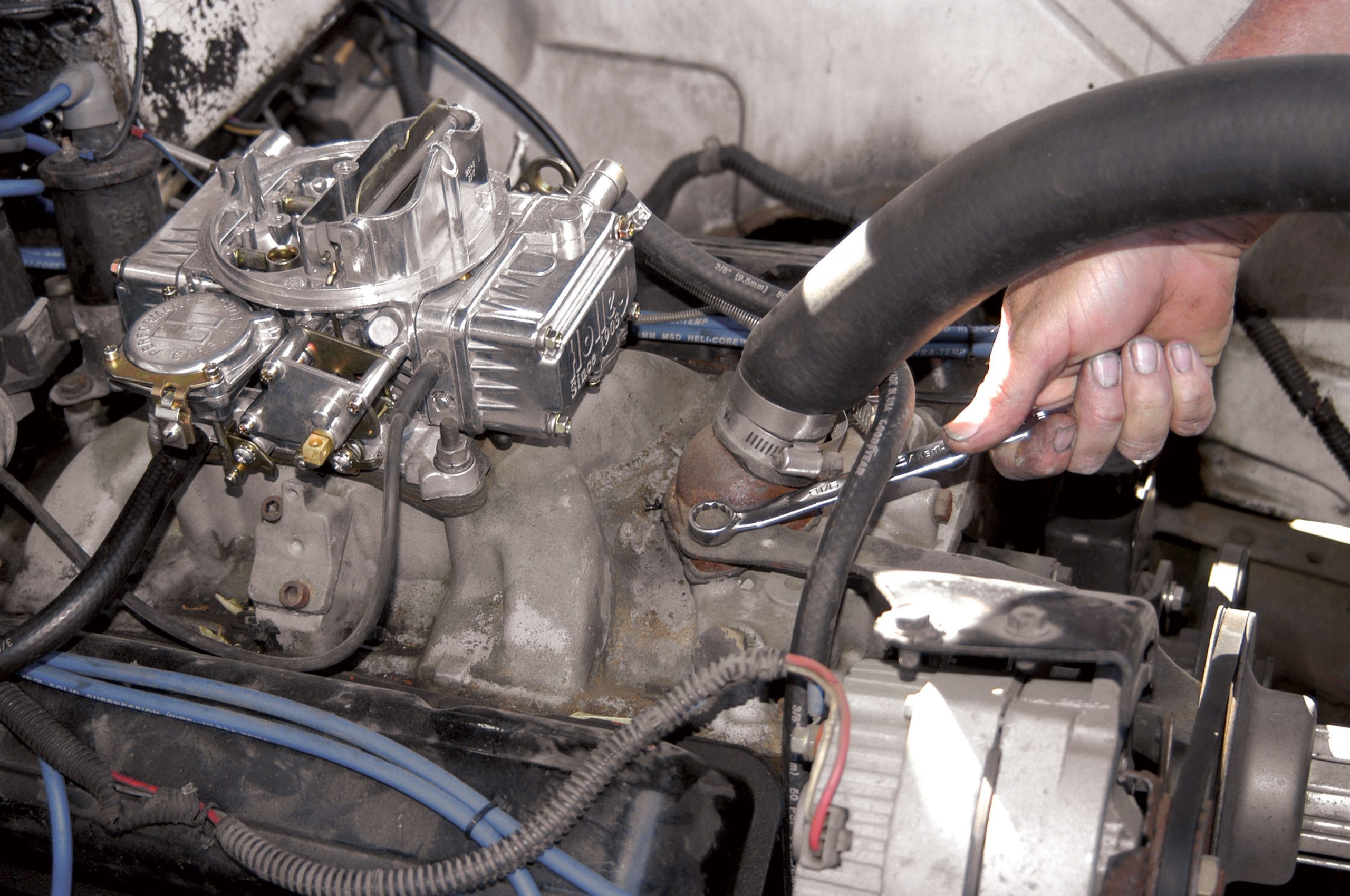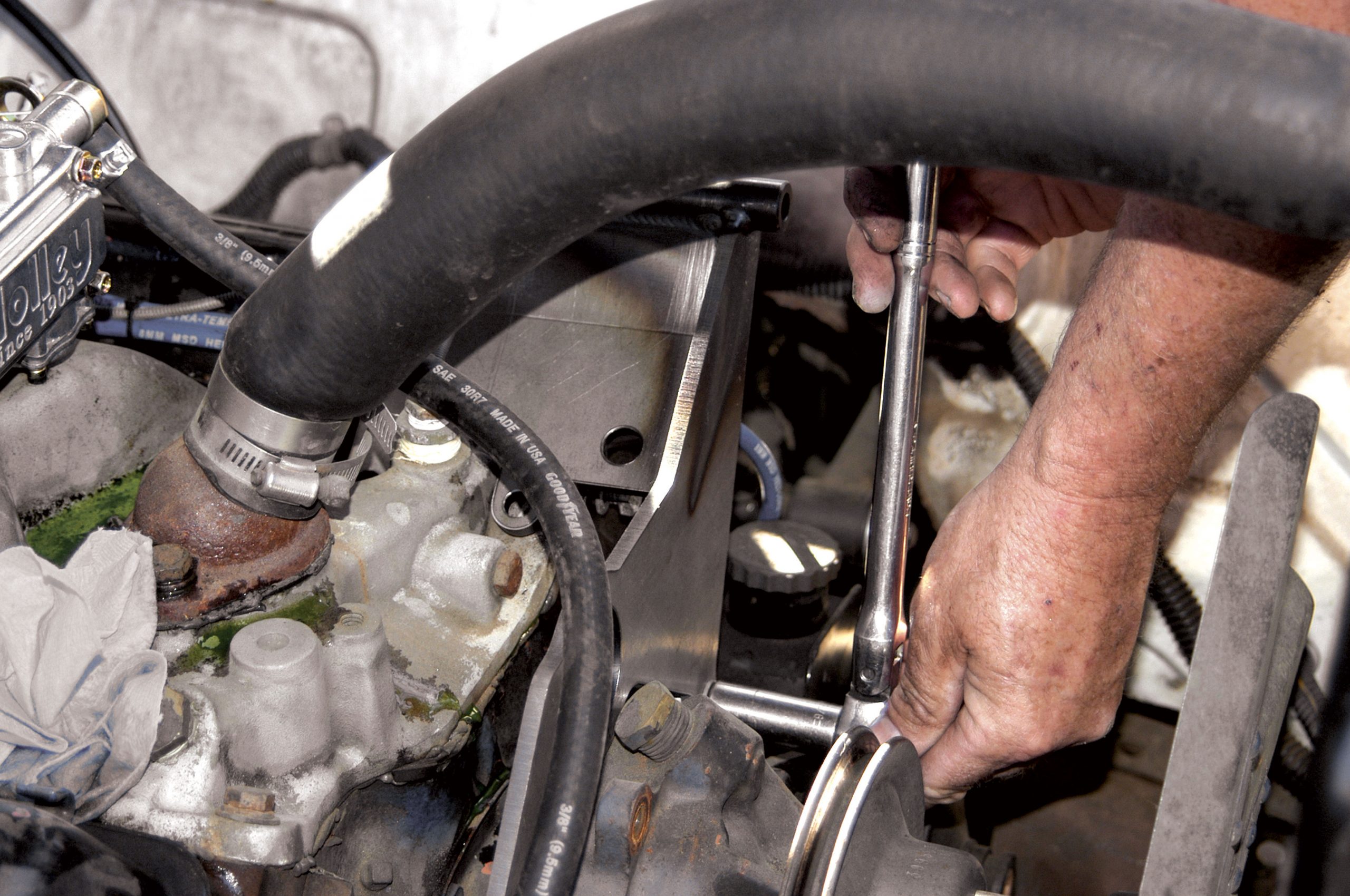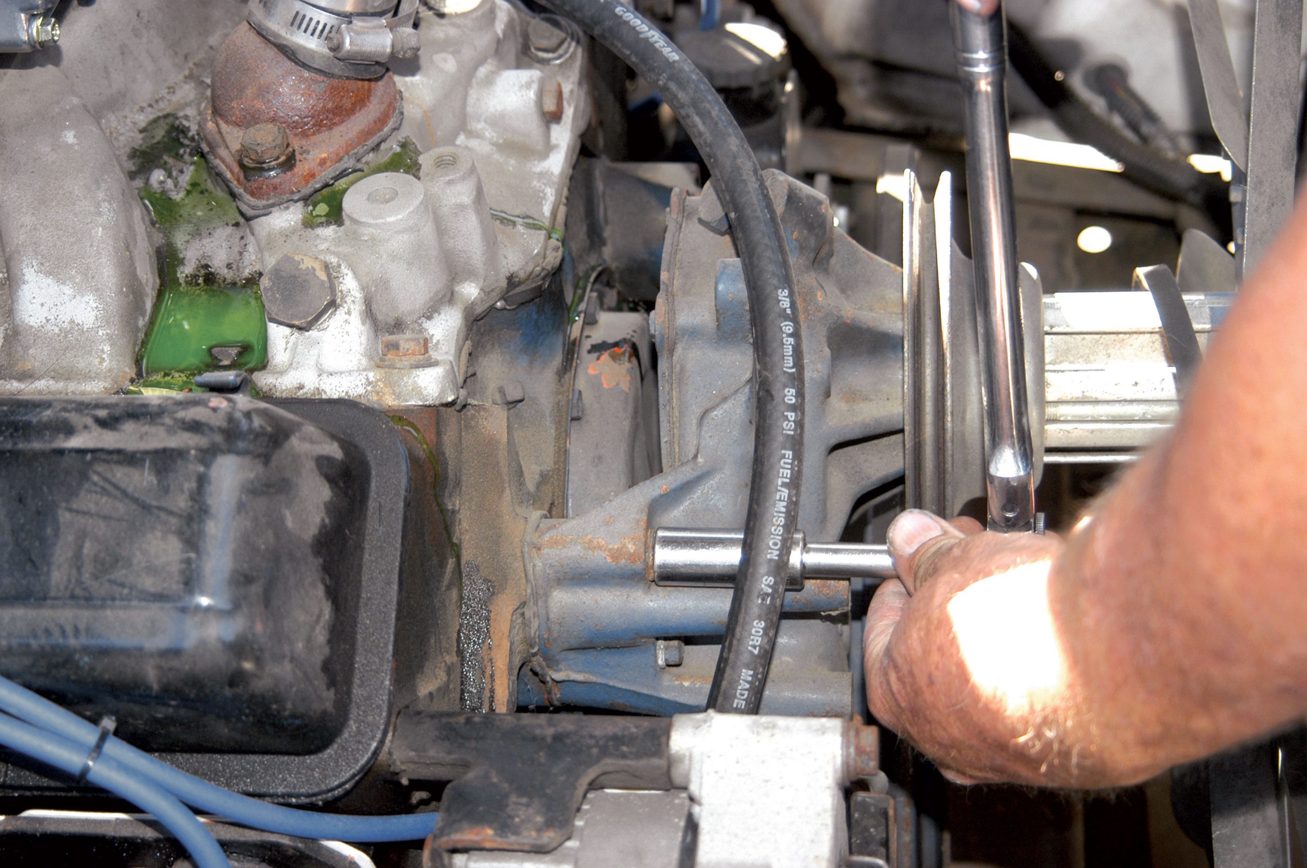 The new compressor bracket is held in place with the top two water pump bolts and two of the intake manifold bolts. Here, one of the bolts is removed with a 9/16-inch socket wrench.