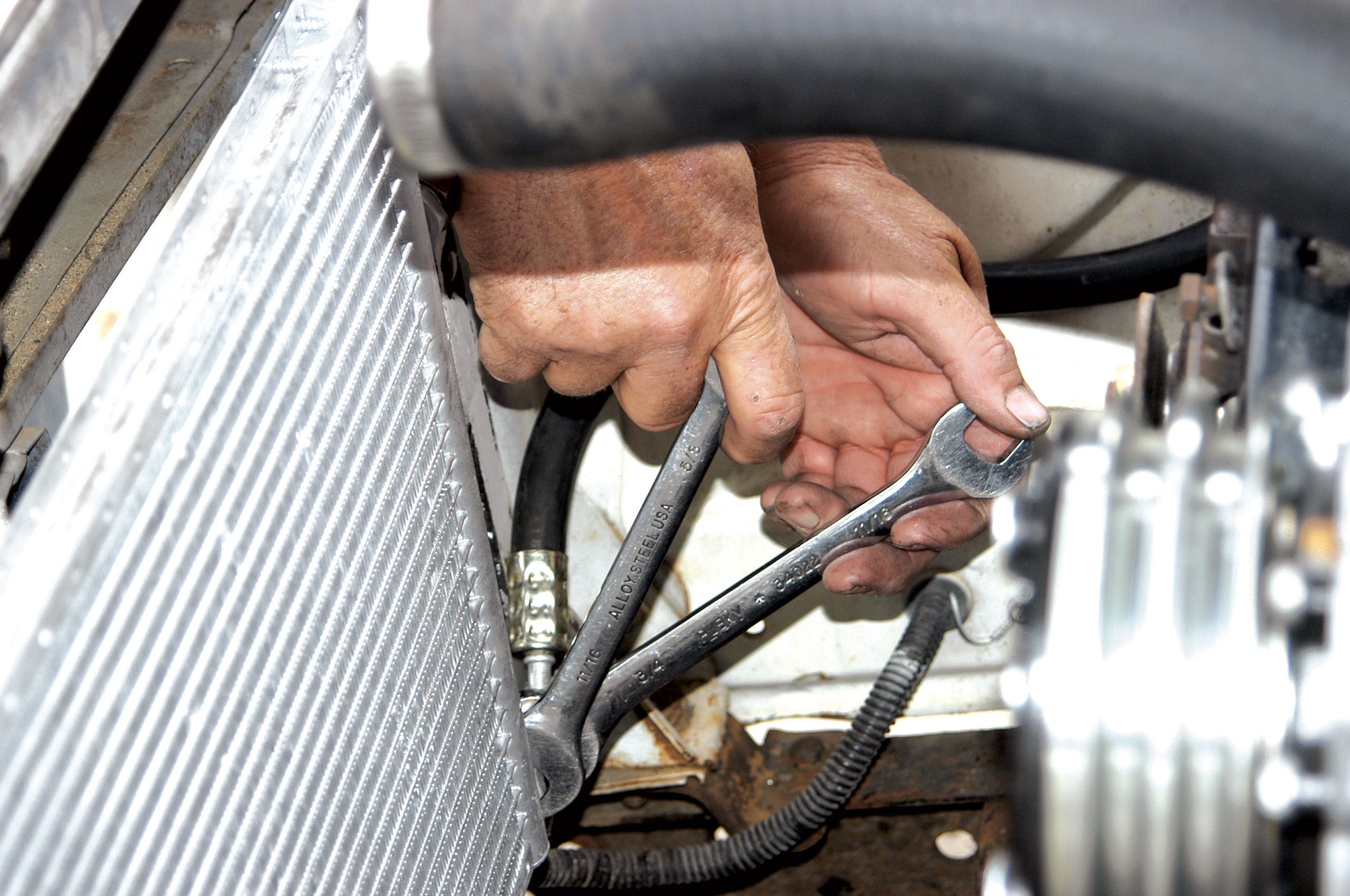 The hose from the upper condenser fitting runs to the compressor. Here, the fitting is tightened with a large open-end wrench.