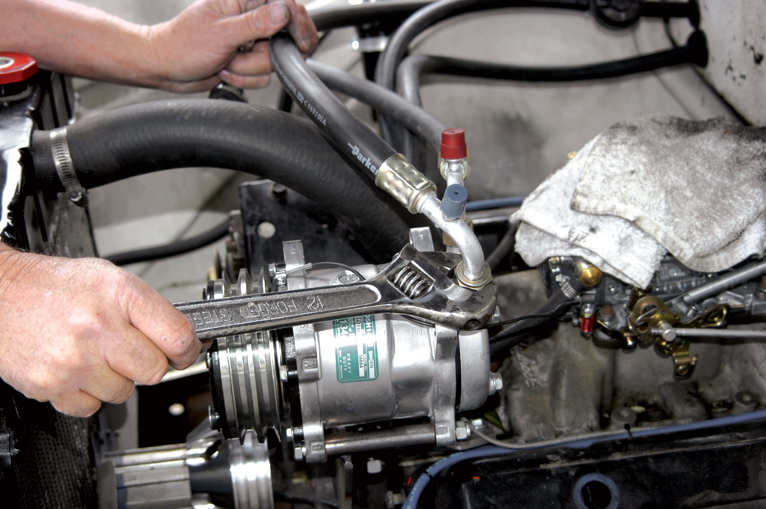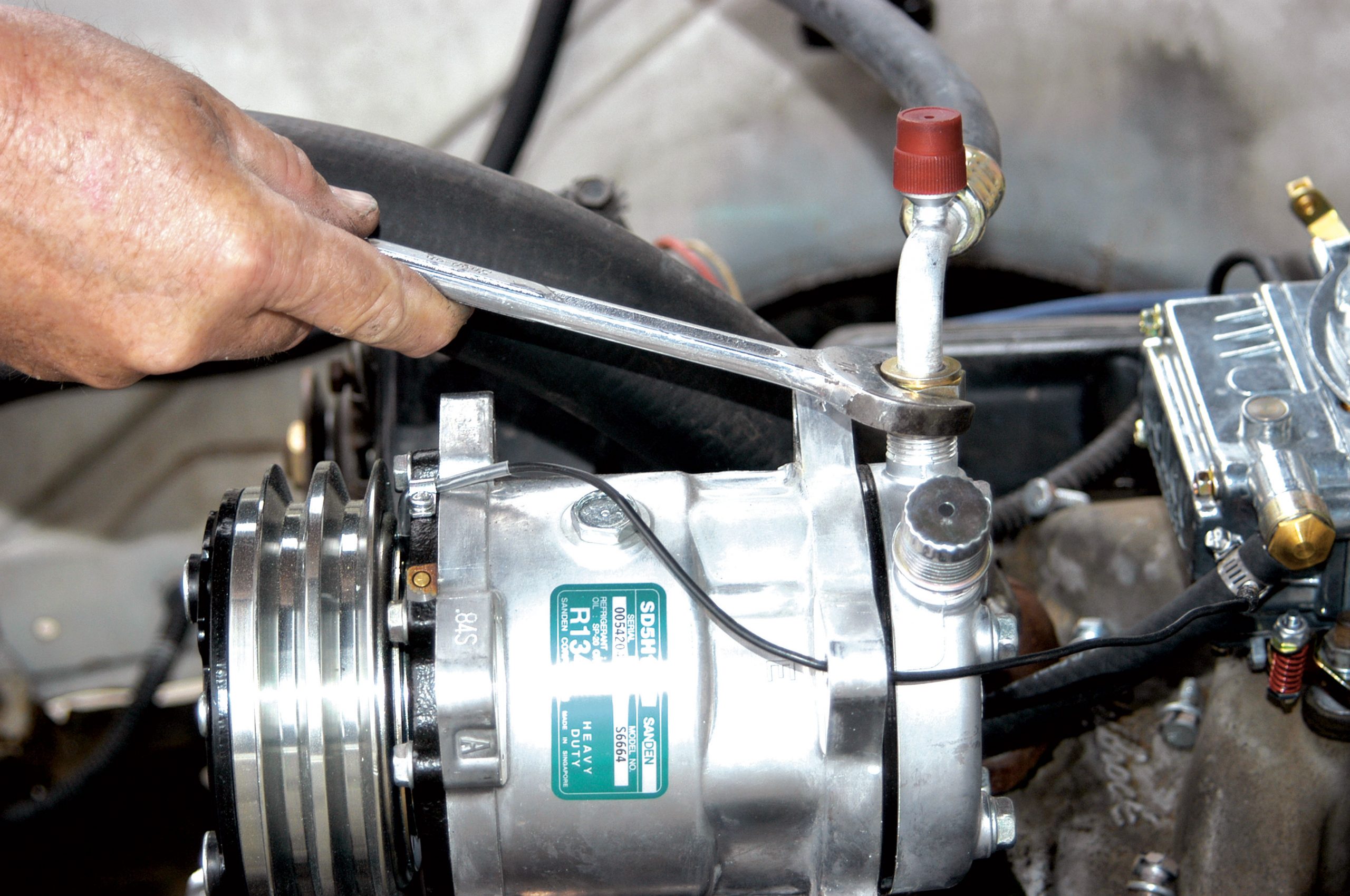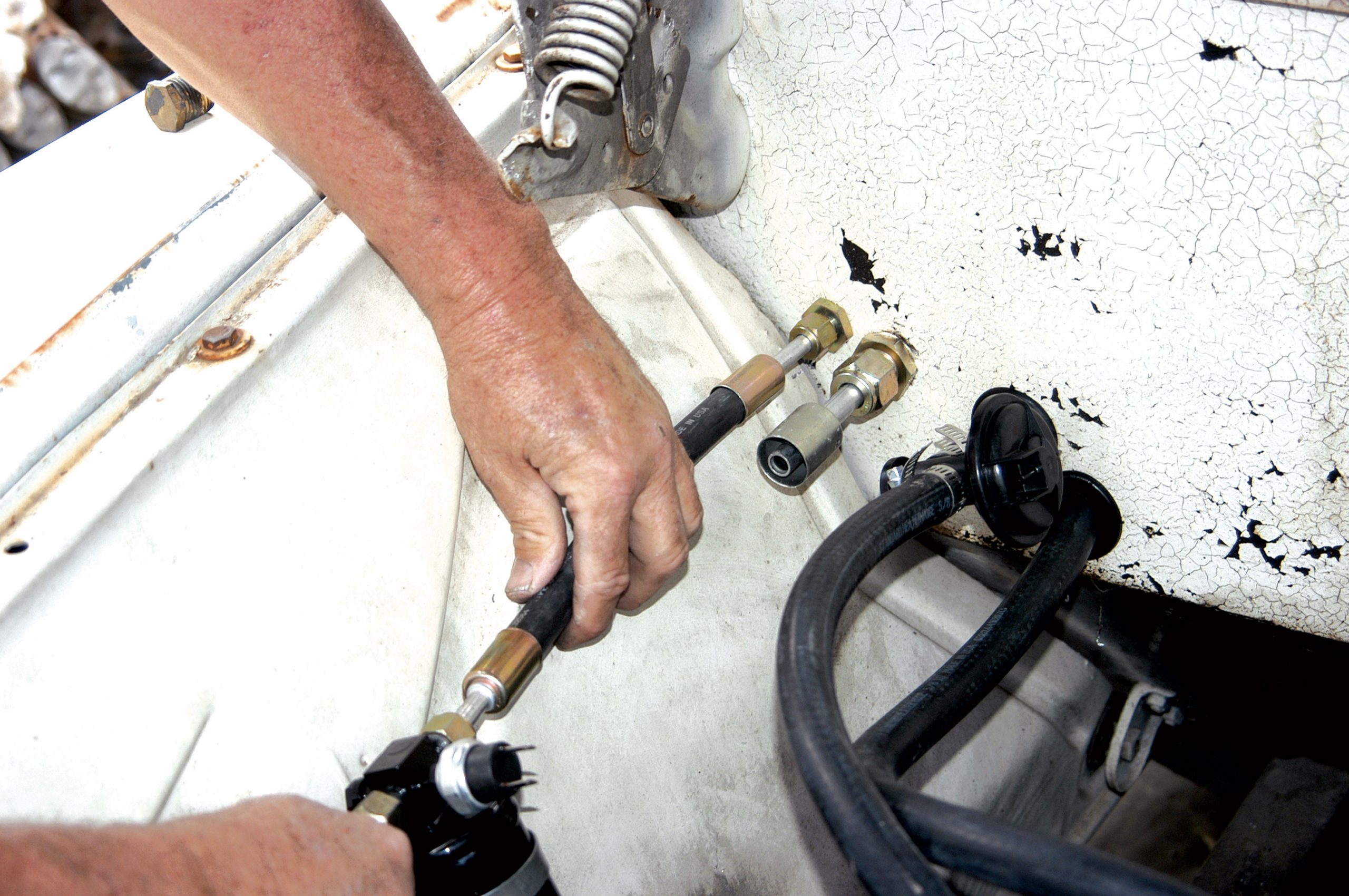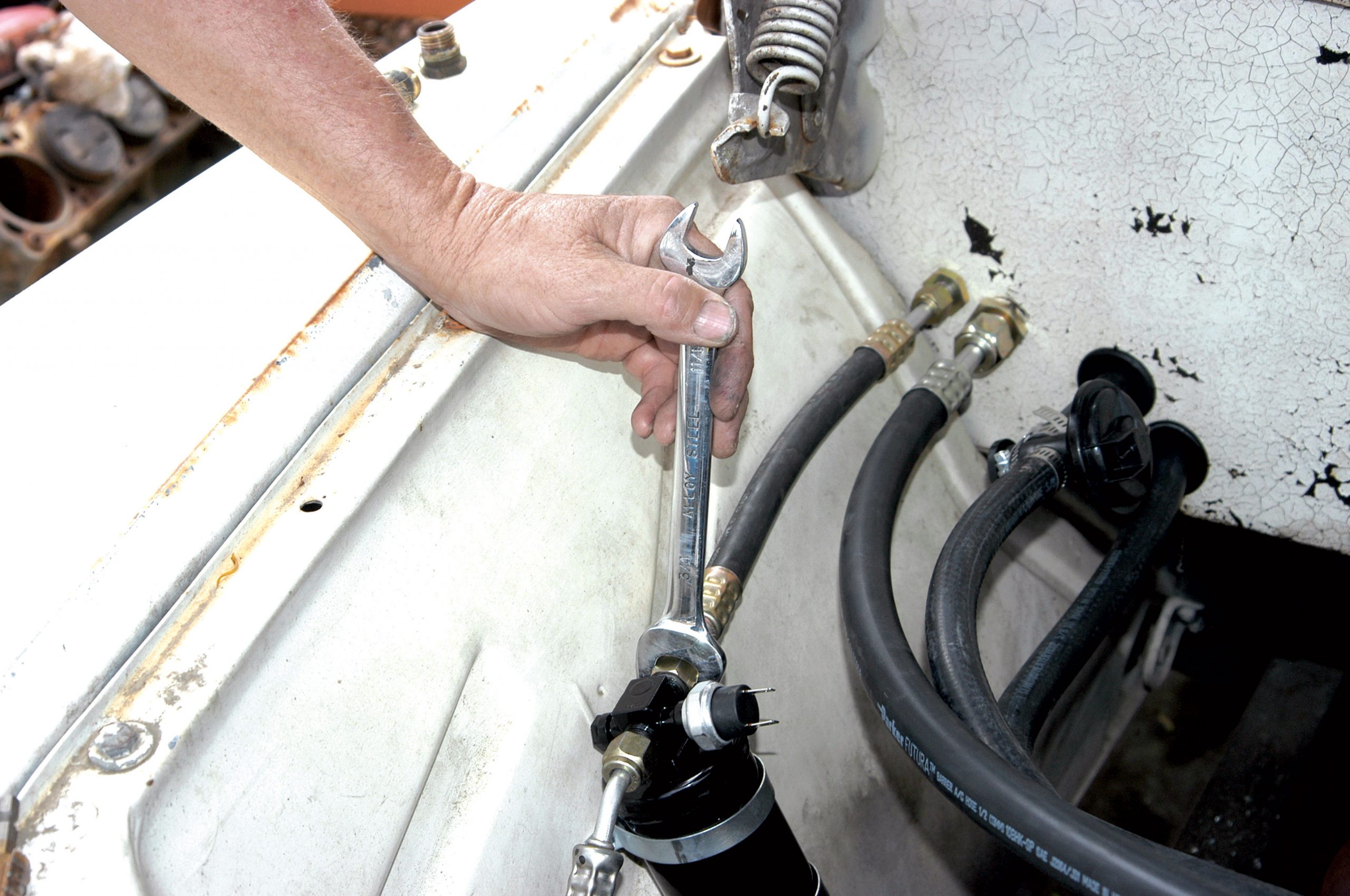 The other hose runs from the bulkhead to the compressor and it was tightened with a large crescent wrench.