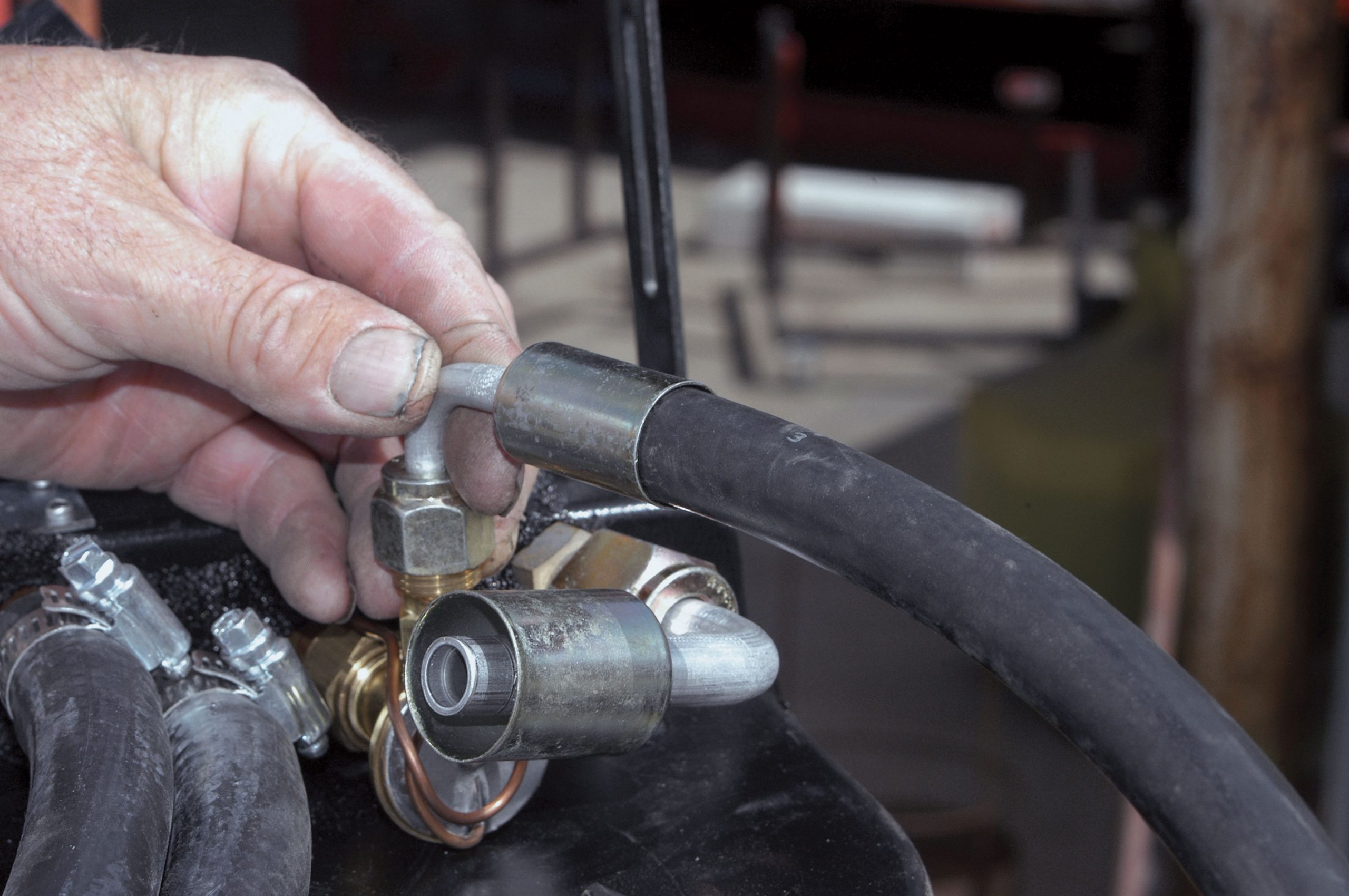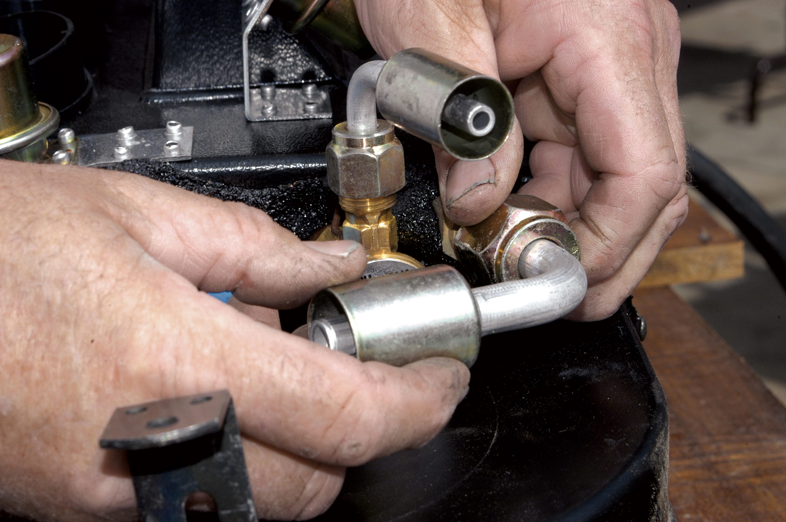 When the length of the hose running to the compressor was determined, it was cut and connected to the fitting, as seen here.