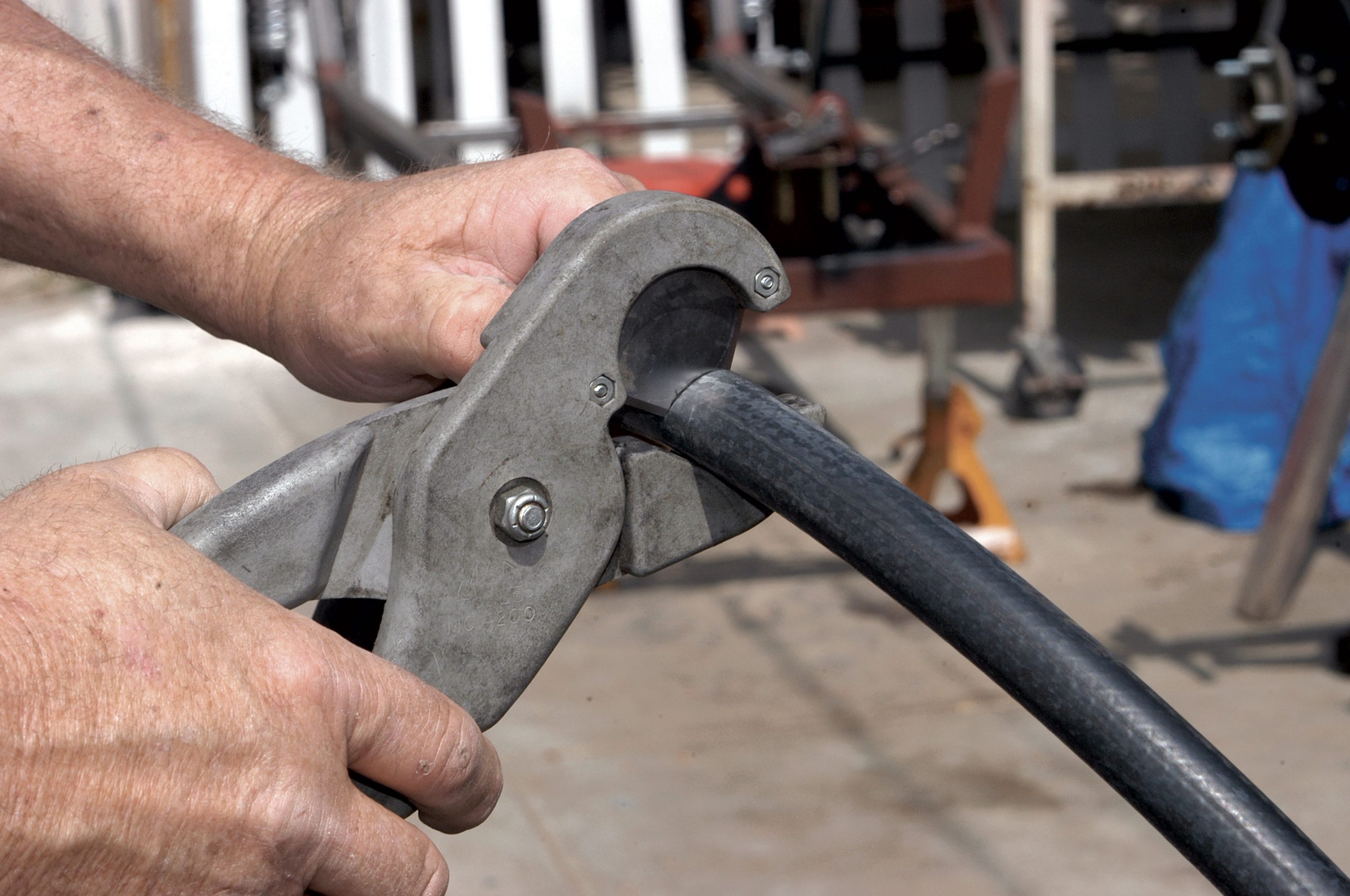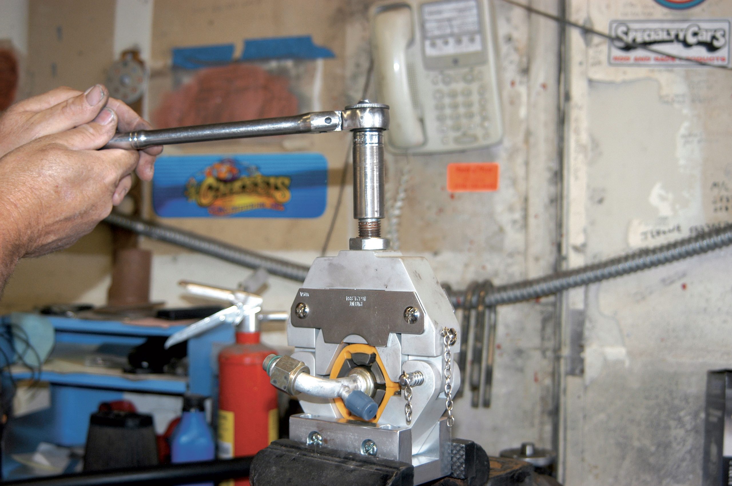 The hose was removed from the ’55, and then the fitting was crimped using this special crimping tool. If you plan to install quite a few air-conditioning systems, buying one would be a good idea, but if you plan to install only one, you can have the hoses crimped at your local air-conditioning shop.
