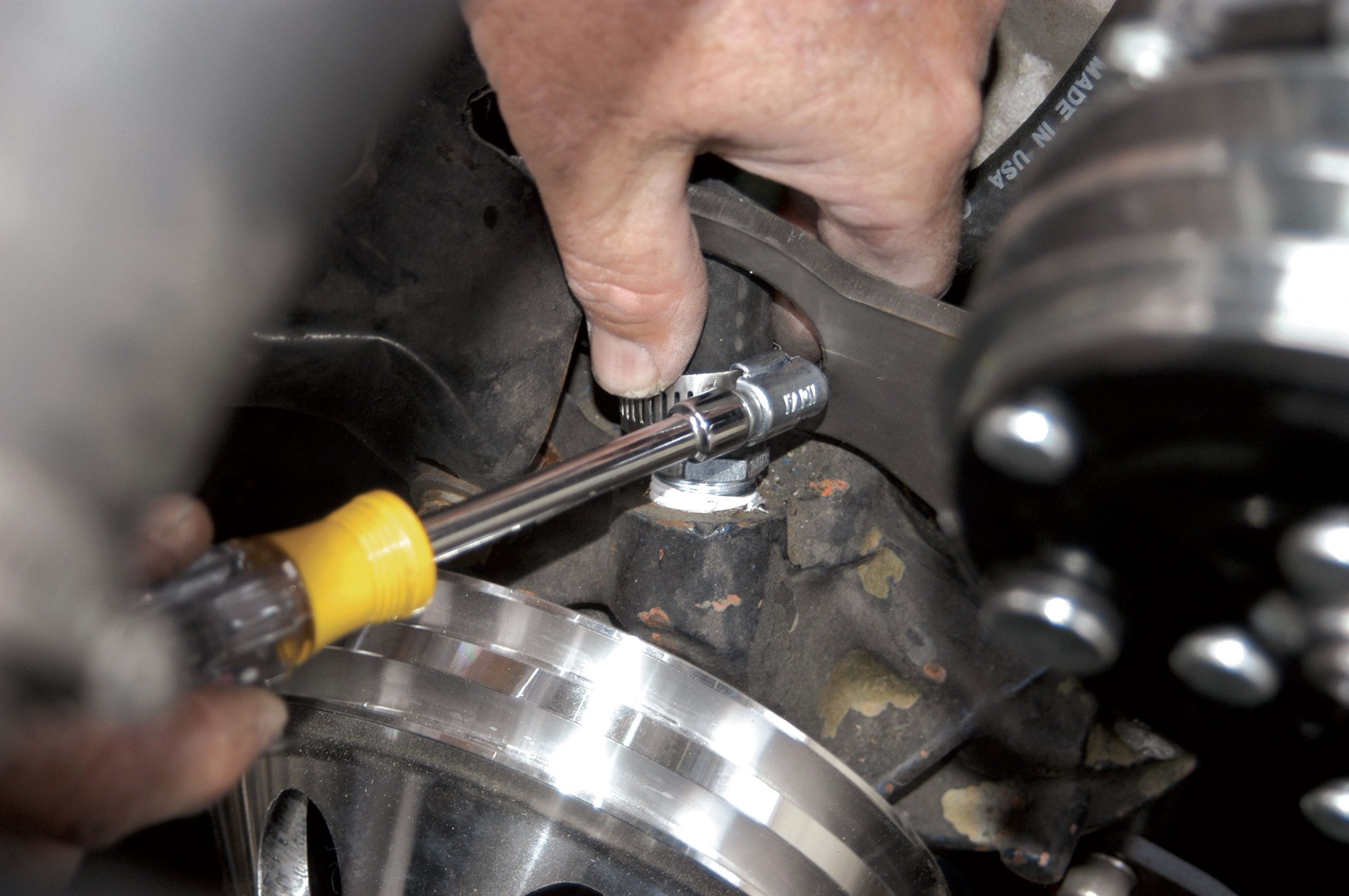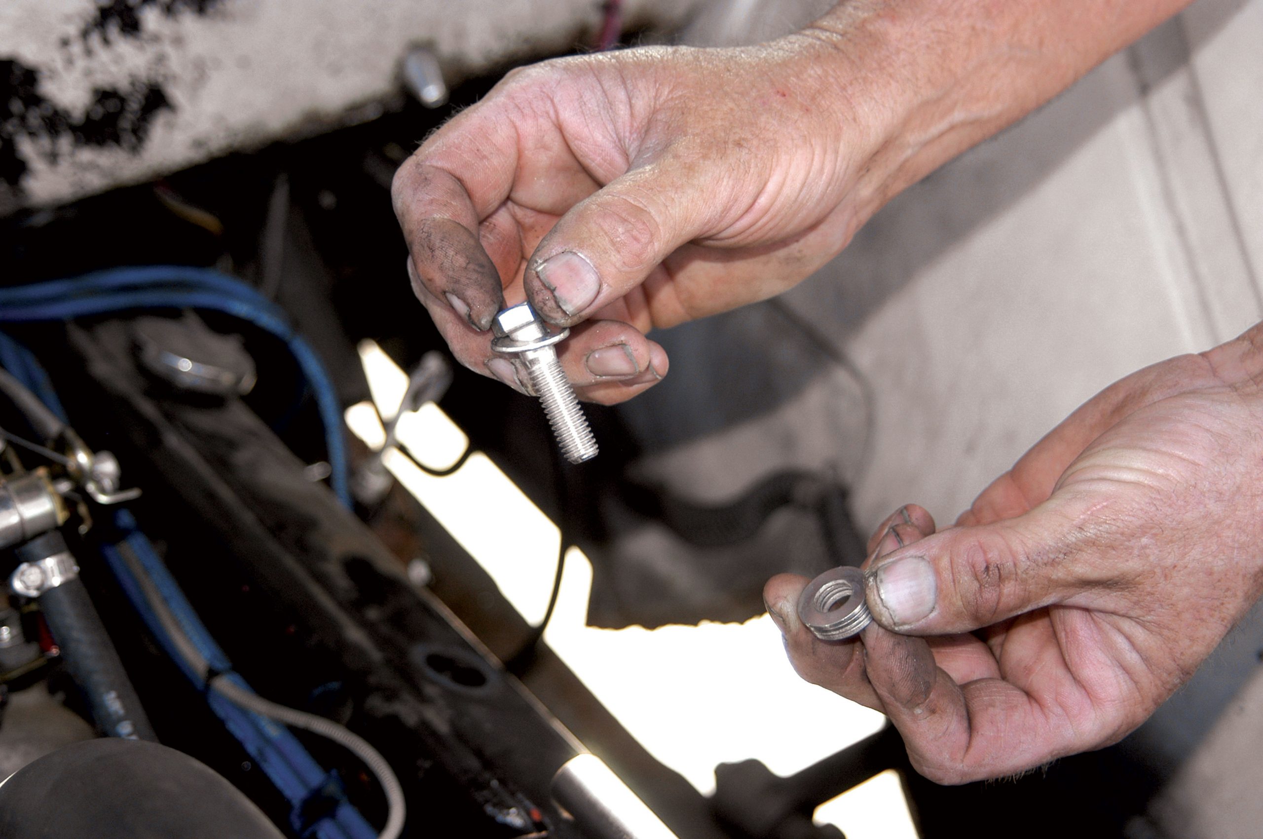 The bracket also connects to the two front intake-manifold bolts, but a spacer is required, as seen here. The bracket comes with the spacers and two longer intake manifold bolts.