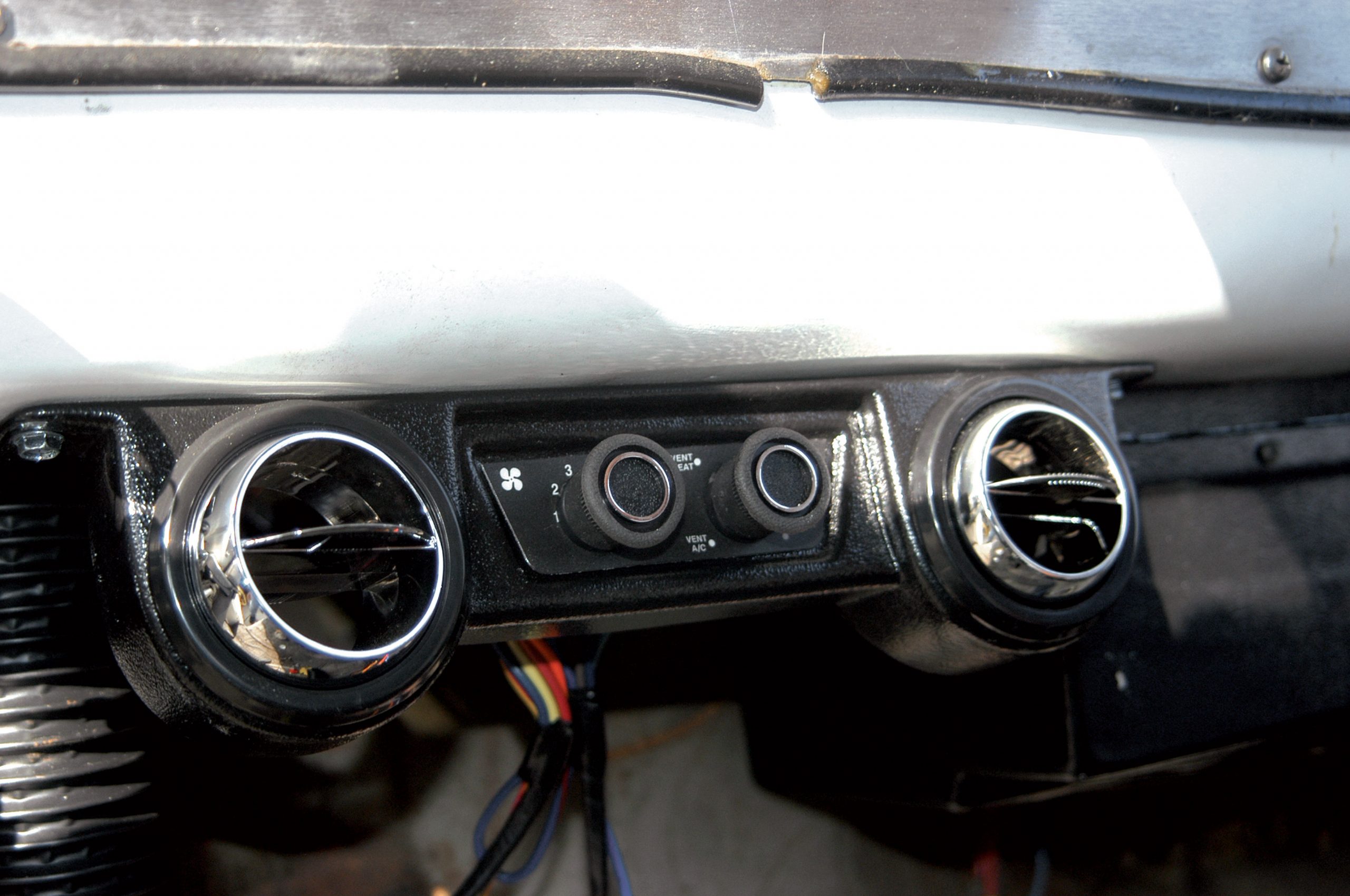 Using a drill motor and self-tapping screws, the vent was attached to the bottom of the dash. After the vents are installed, the air tubes can be connected from the evaporator to the vents. This completes the mounting of the air conditioning, and all that remains now is hooking up the wiring. You can do that to fit your application.