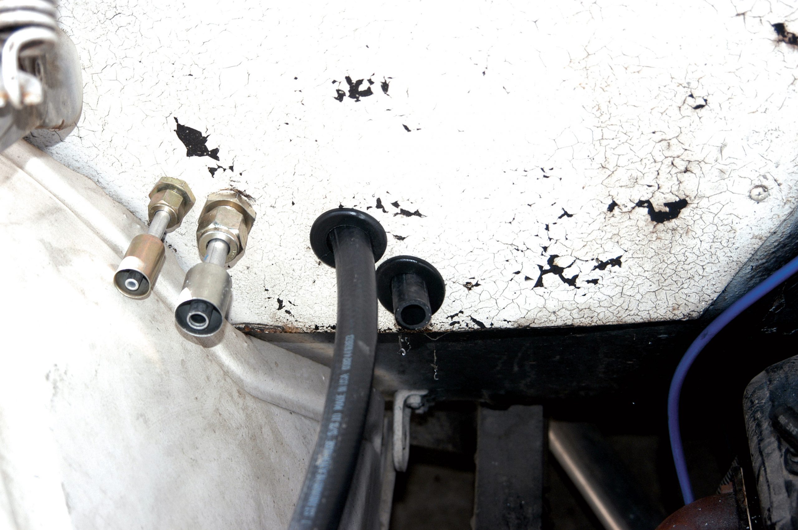 There are two remaining air-conditioning lines that need to be made and installed. Here, a small hose is connected to the fitting on the bulkhead, while a measurement was made to the dryer. When the size was determined, the hose was cut accordingly. Note that the dryer had an inlet and an outlet side. Be sure to hook it up correctly.