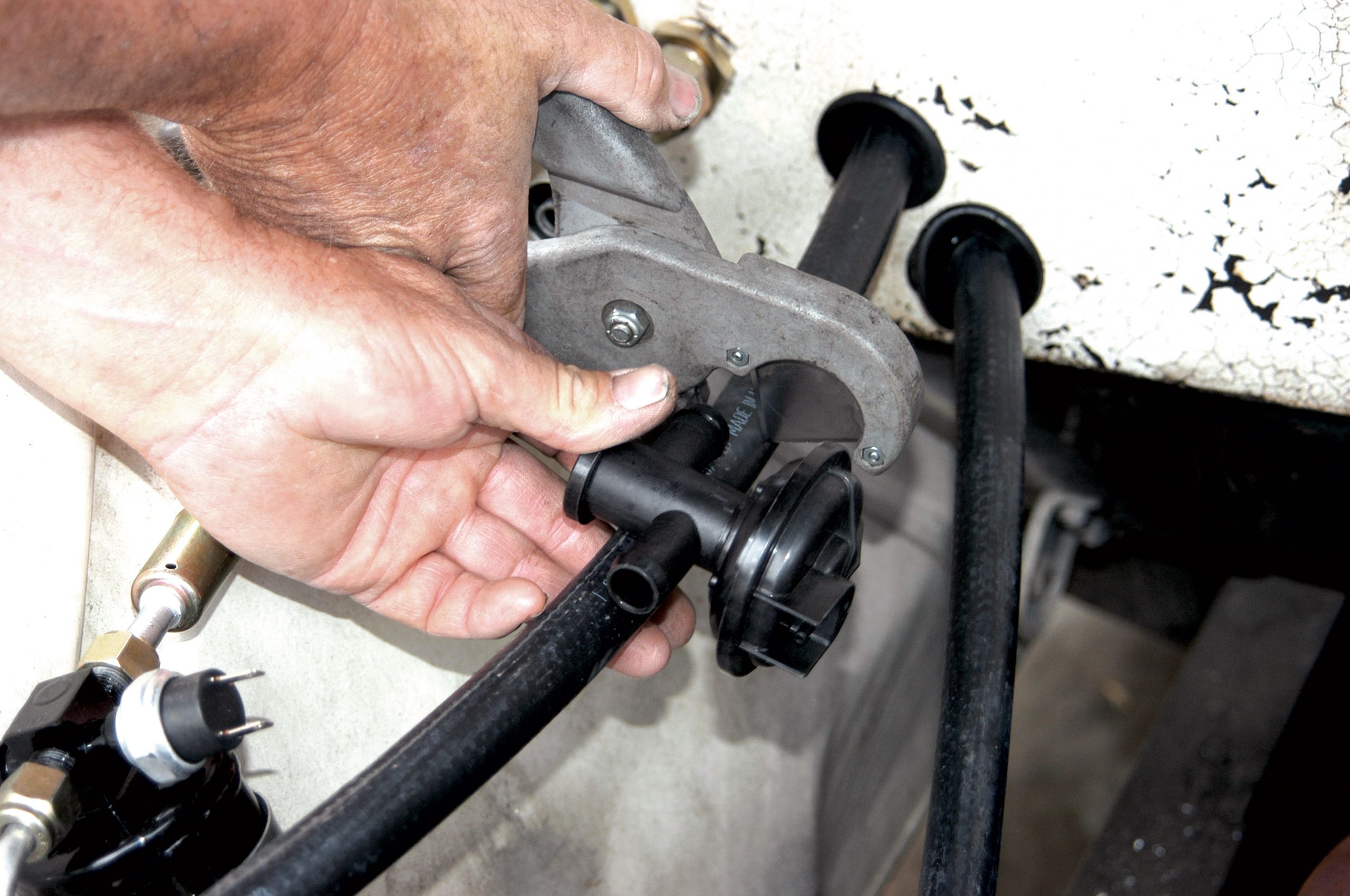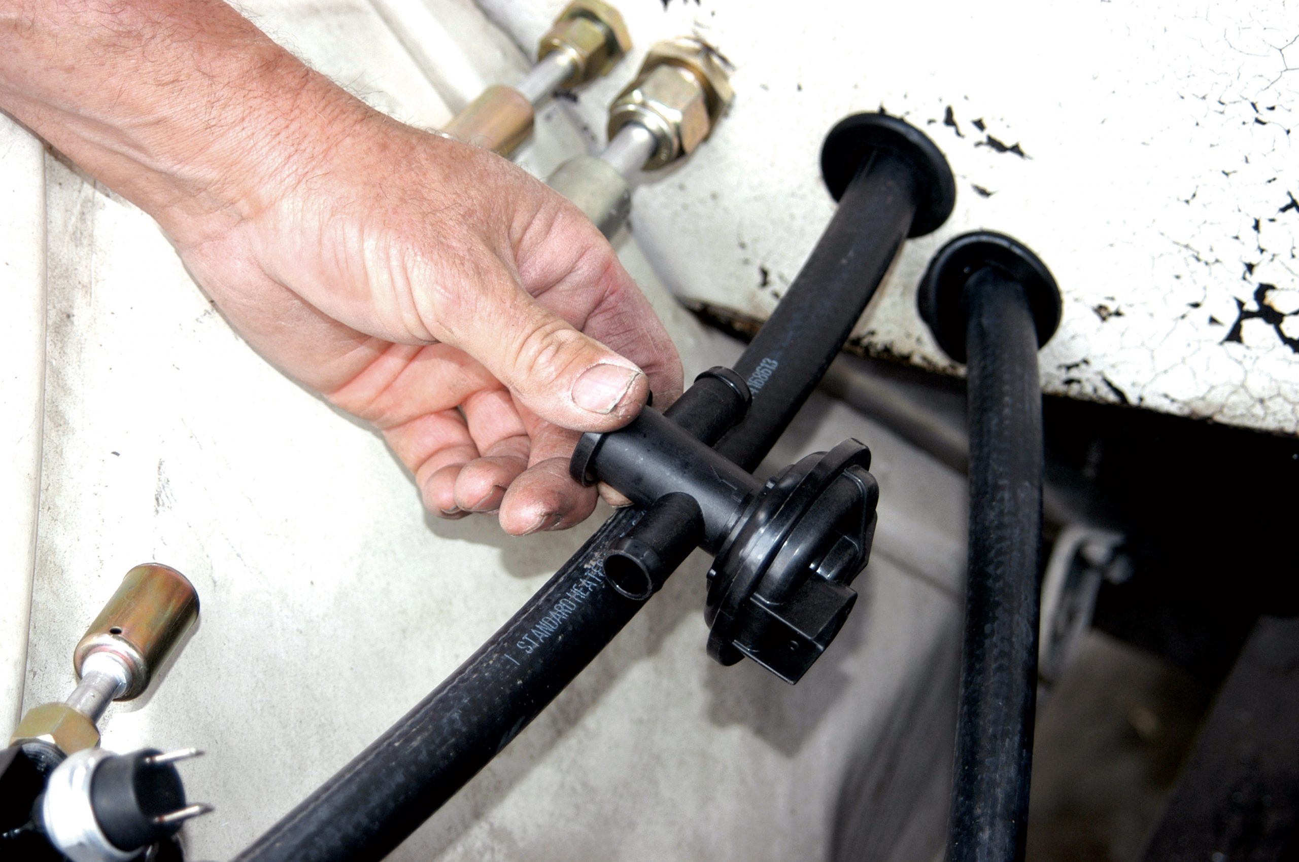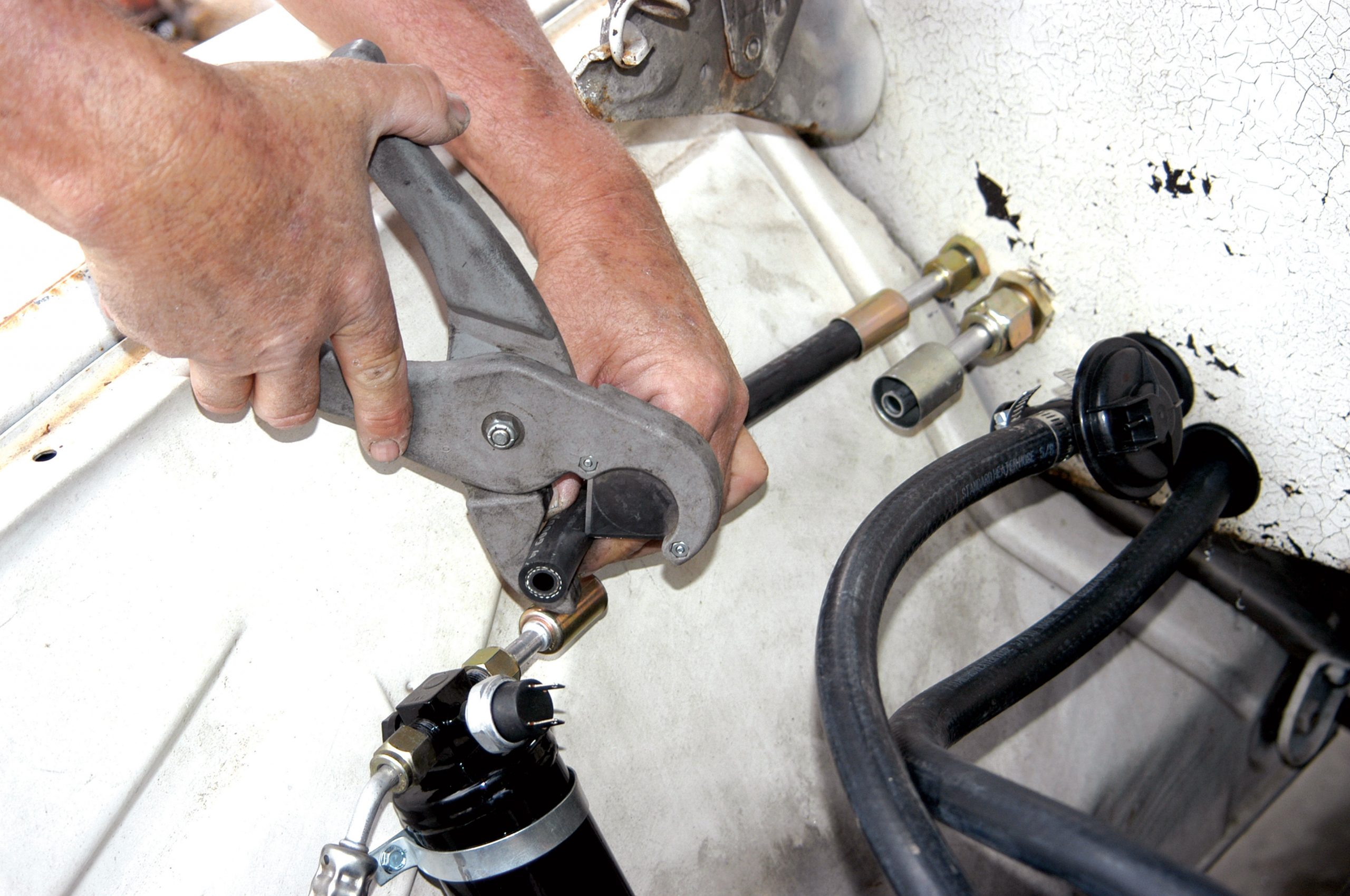 Two small sections of A/C hose were cut to size to complete an evaporator-to-firewall connection.