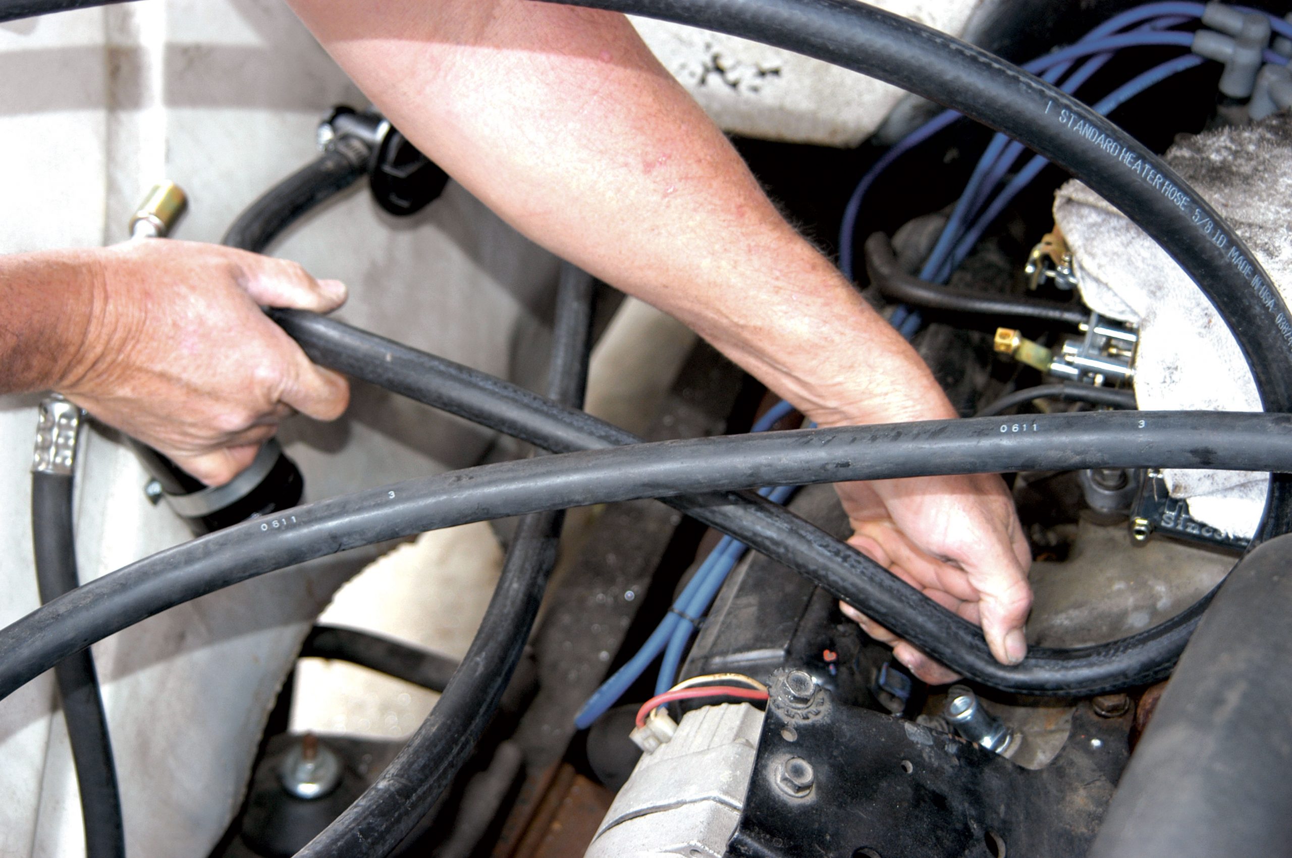 Both of the heater hoses were lubricated to make the heater-control valve installation easier. After the hoses were connected, the clamps were tightened with a small nut driver.