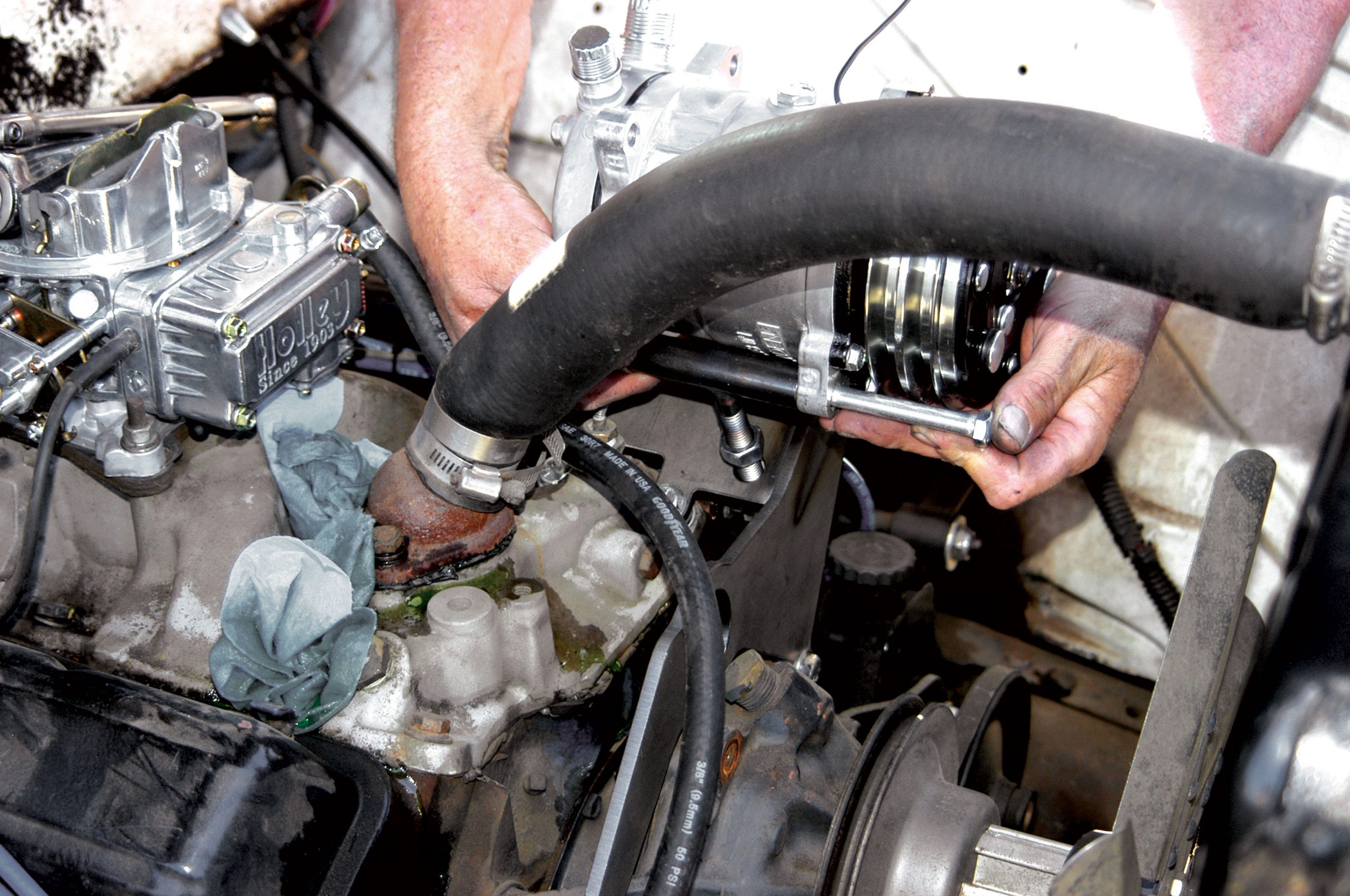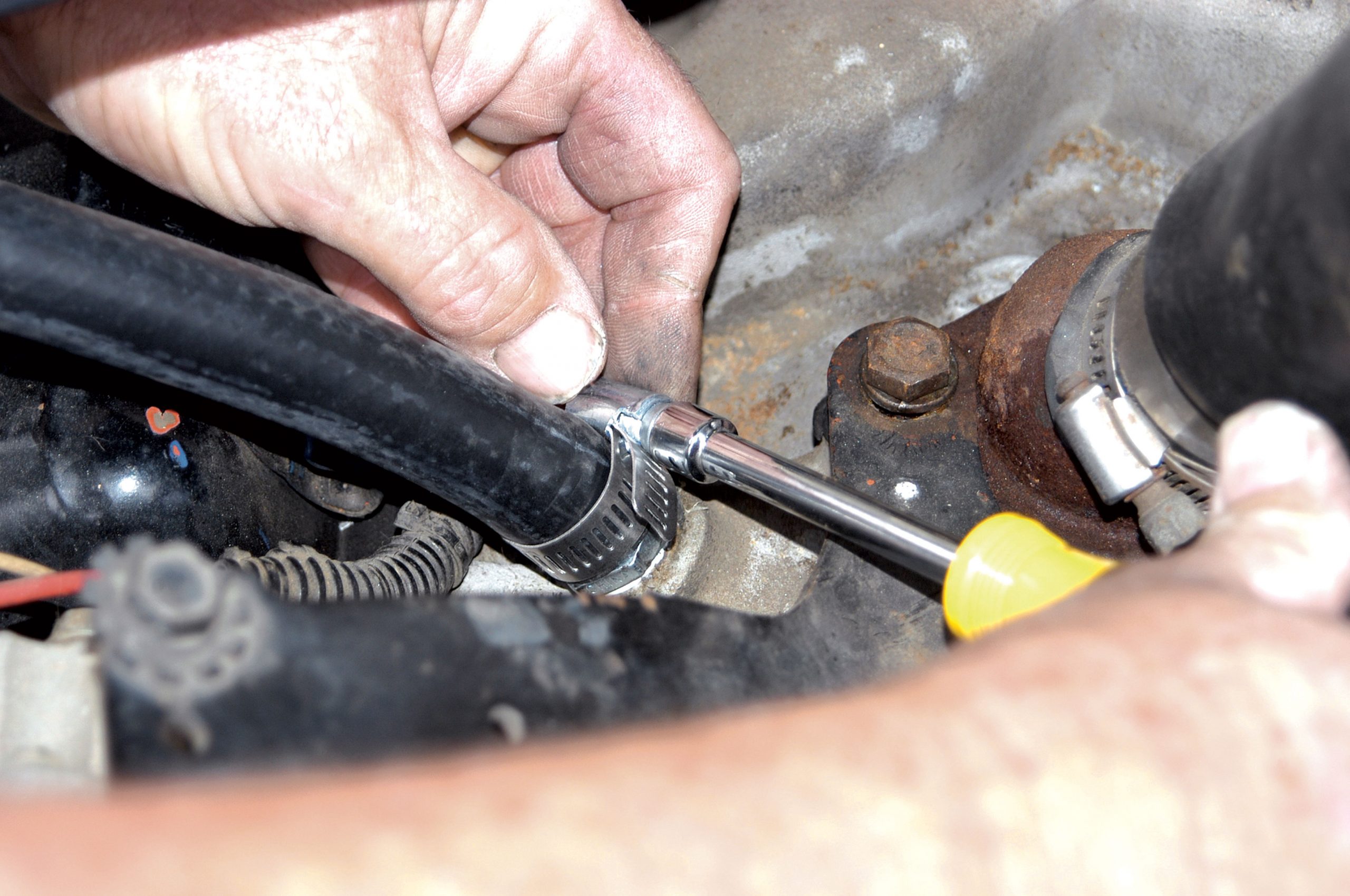 After the hose was cut to length, it was connected to the fitting in the intake manifold. Here, the clamp is tightened with a nut driver. The other heater hose connects to the fitting on the water pump. Notice how the hose passes through the hole in the bracket.