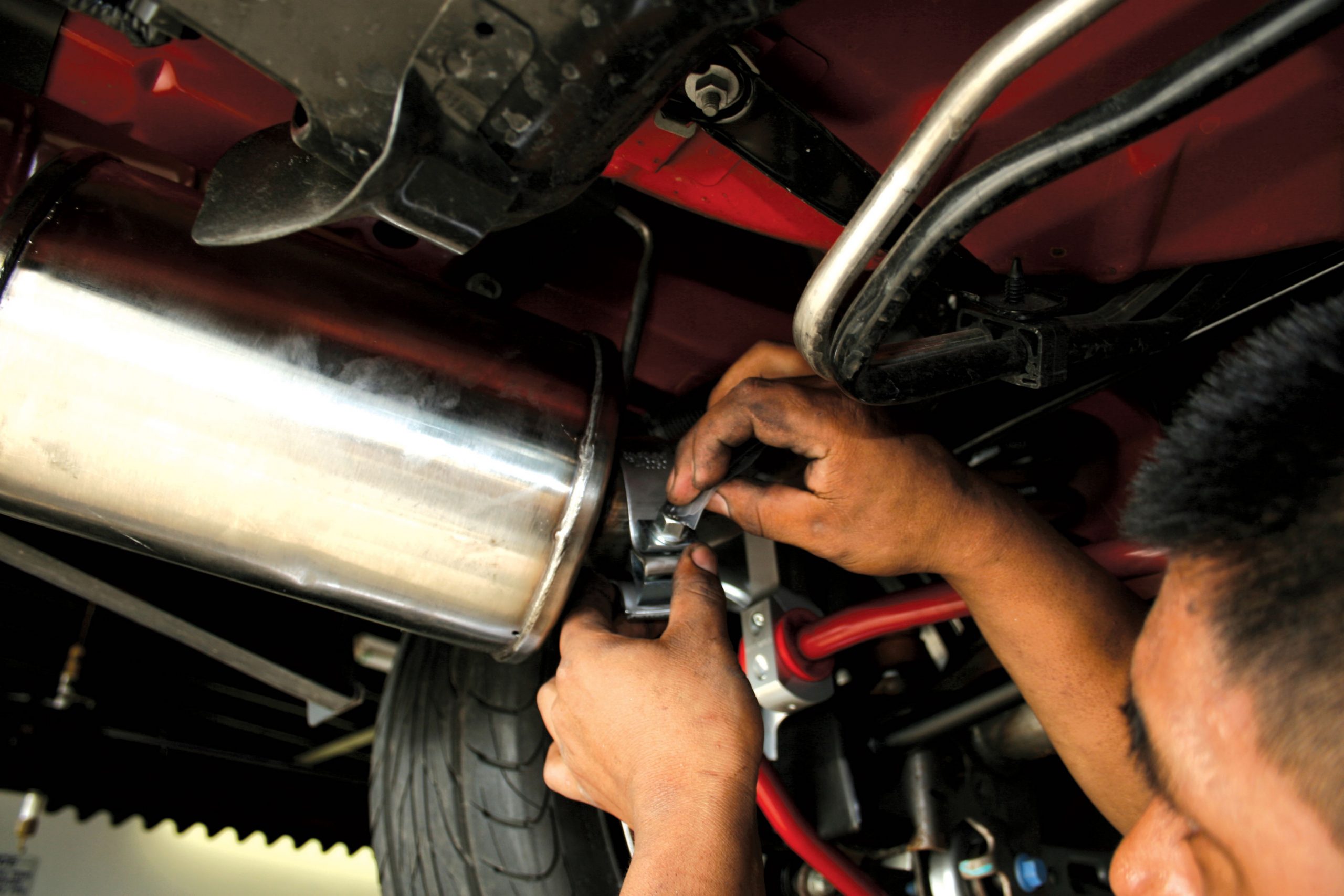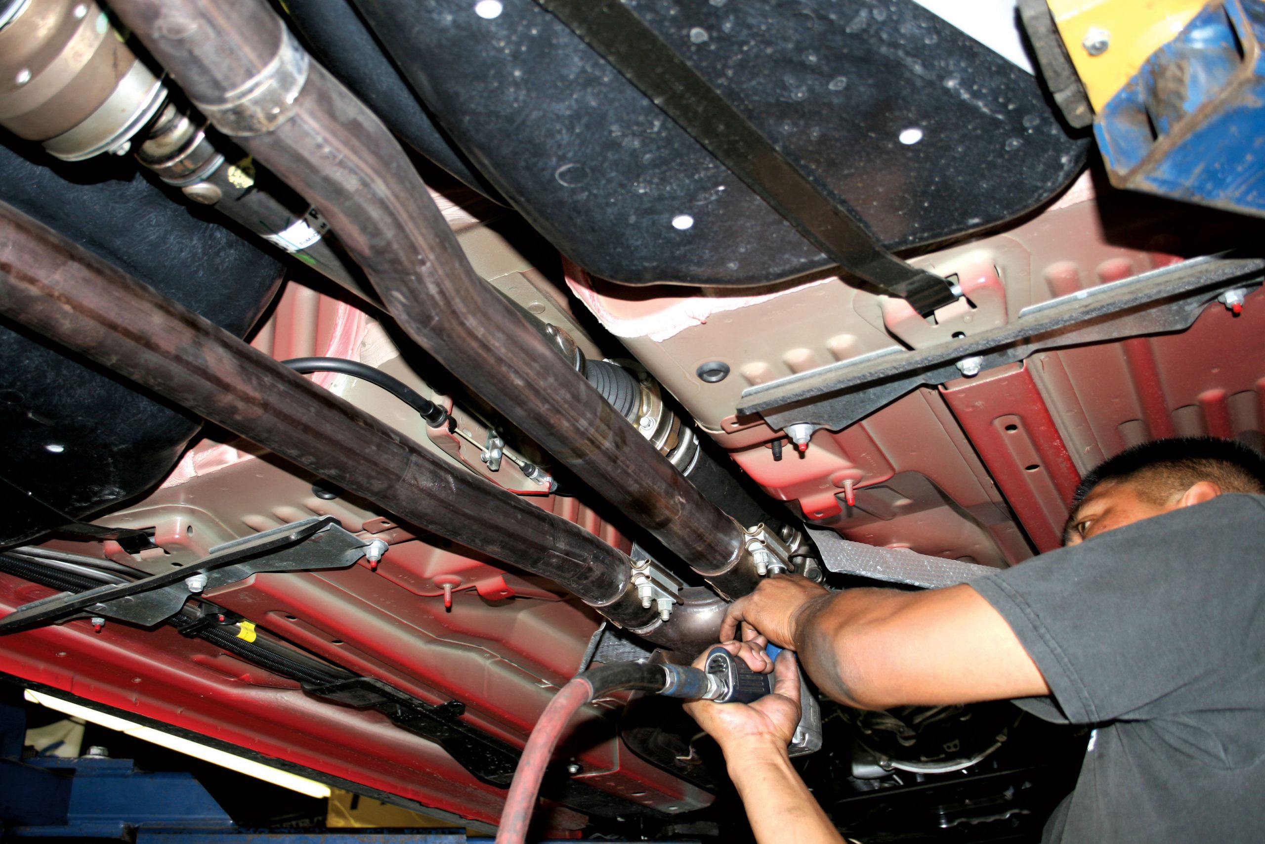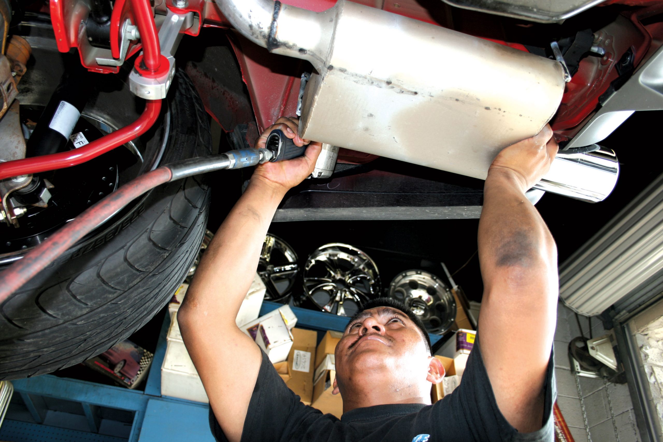 We followed along as the guys at Advantage Performance Center installed the system on Harris’ Shelby GT500. With all the necessary pauses for photography, they completed the installation in about an hour and a half. If you are performing the installation yourself, in your garage or driveway, plan on two to three hours, as the limitation of not having a hoist will likely slow you down. Follow along to see the basics of the installation, but do follow the instructions completely if you are installing the system yourself. Also, be sure to practice general garage safety rules. If you just drove the car home from the track, the exhaust will be hot, so grabbing it with your bare hands will likely result in a burn. And when lifting the car, make sure it is properly supported on jackstands.