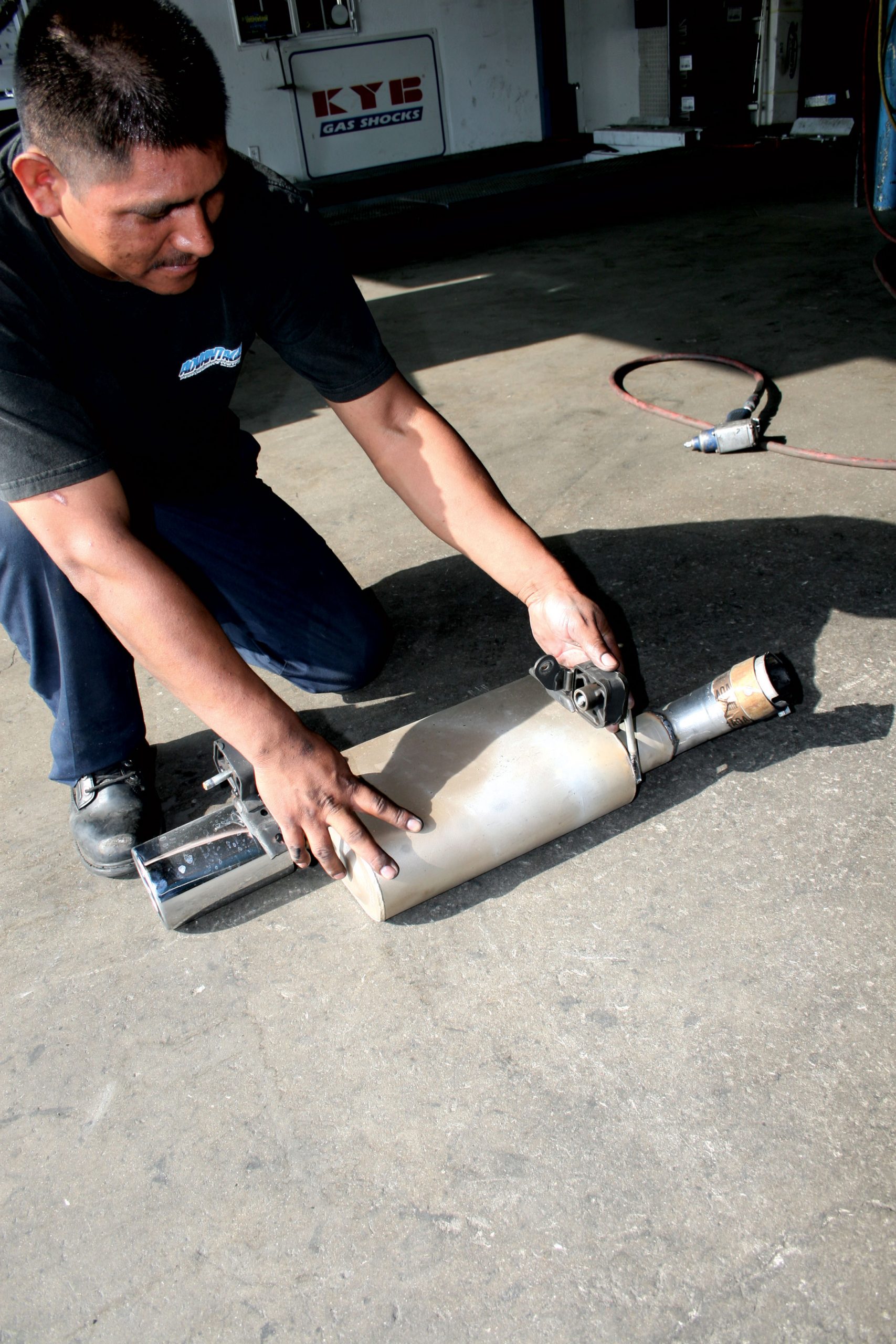 With the hangers properly installed on the Corsa mufflers, the assembly can be installed on the car by slipping the muffler pipe over the exhaust pipe and mounting the rear hanger first