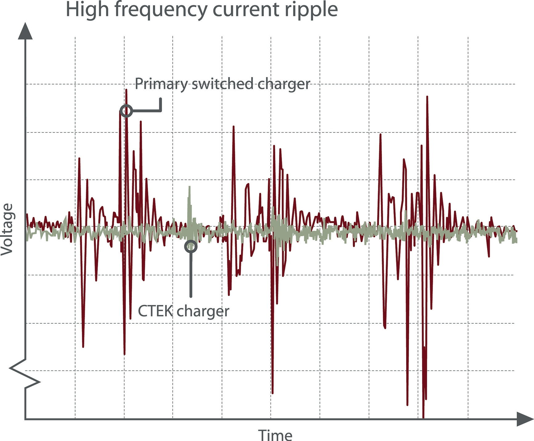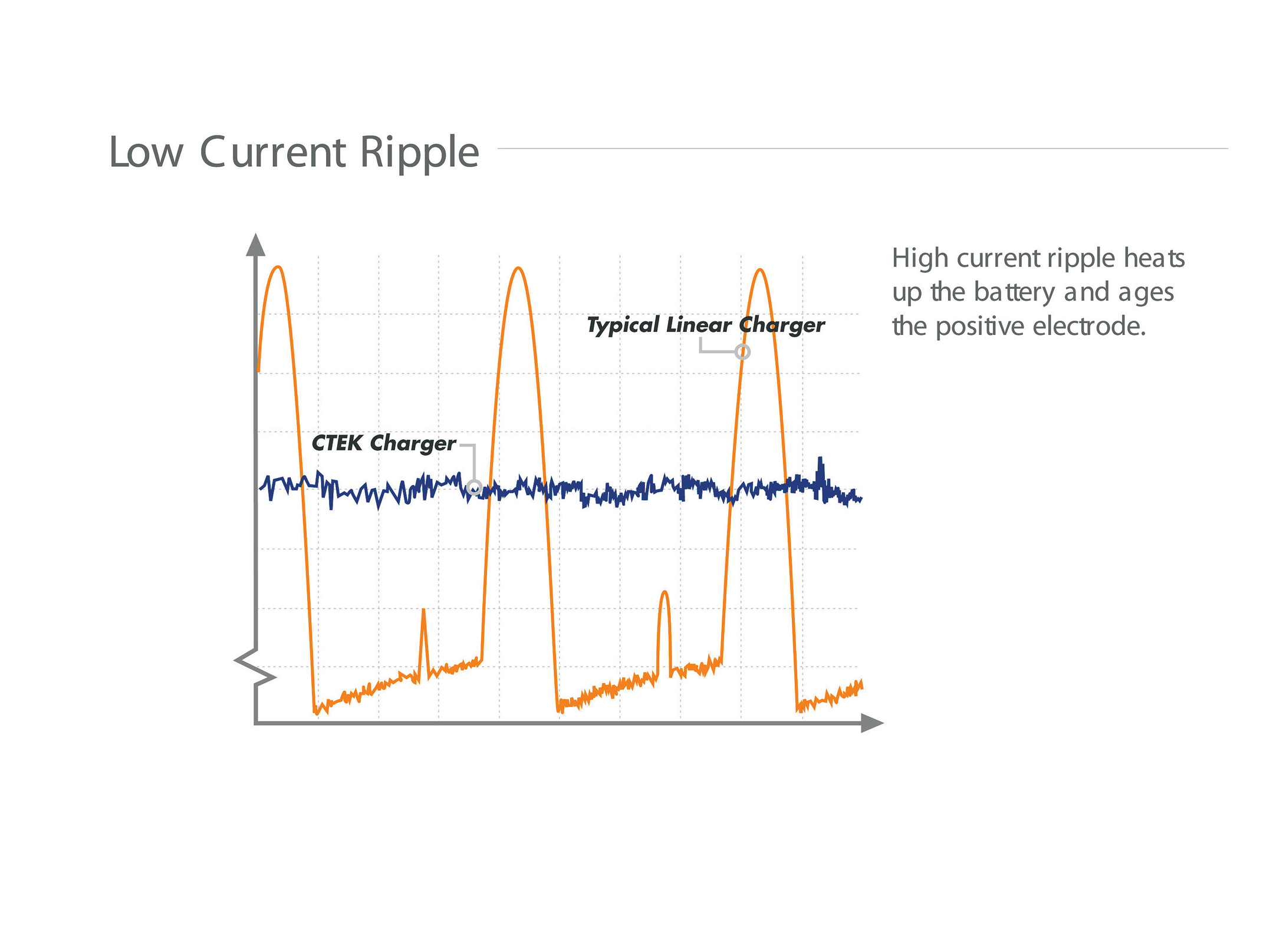 A charger that is too large is unnecessary for two reasons. First, the heating of the battery is greater, which is unfortunate. The ripple in the charger also has an effect here, i.e., how unclean the current is. A charger with high ripple, which is common in most linear chargers, heats the battery more, which means that the current must be kept down. A modern switch-mode charger has a ripple so low that the charger can be used for batteries that are smaller than you might expect. A good example of this is the CTEK MULTI US 3300 with 0.8-amp charge current, which has been used for a 2-amp battery with only 2 degrees of temperature rise. A normal maximum temperature rise is considered to be 3 degrees, which means that this CTEK charger covers an extremely wide range. It is possible, of course, to estimate the amount of high current ripple that contributes to heating the battery. A simple rule of thumb is that a traditional linear charger with 400 percent current ripple gives around four times as much heat to the battery compared to a modern charger, like the CTEK, that incorporates switch-mode technology. SR