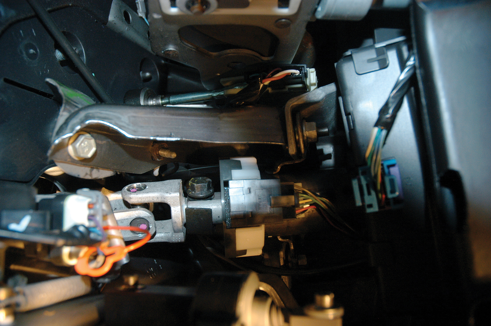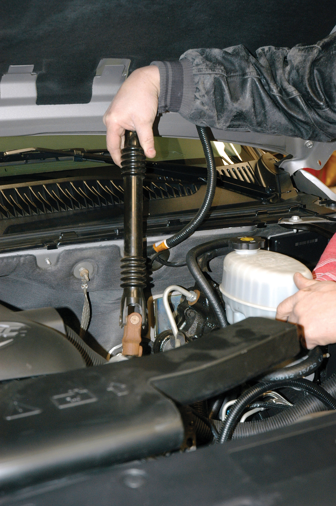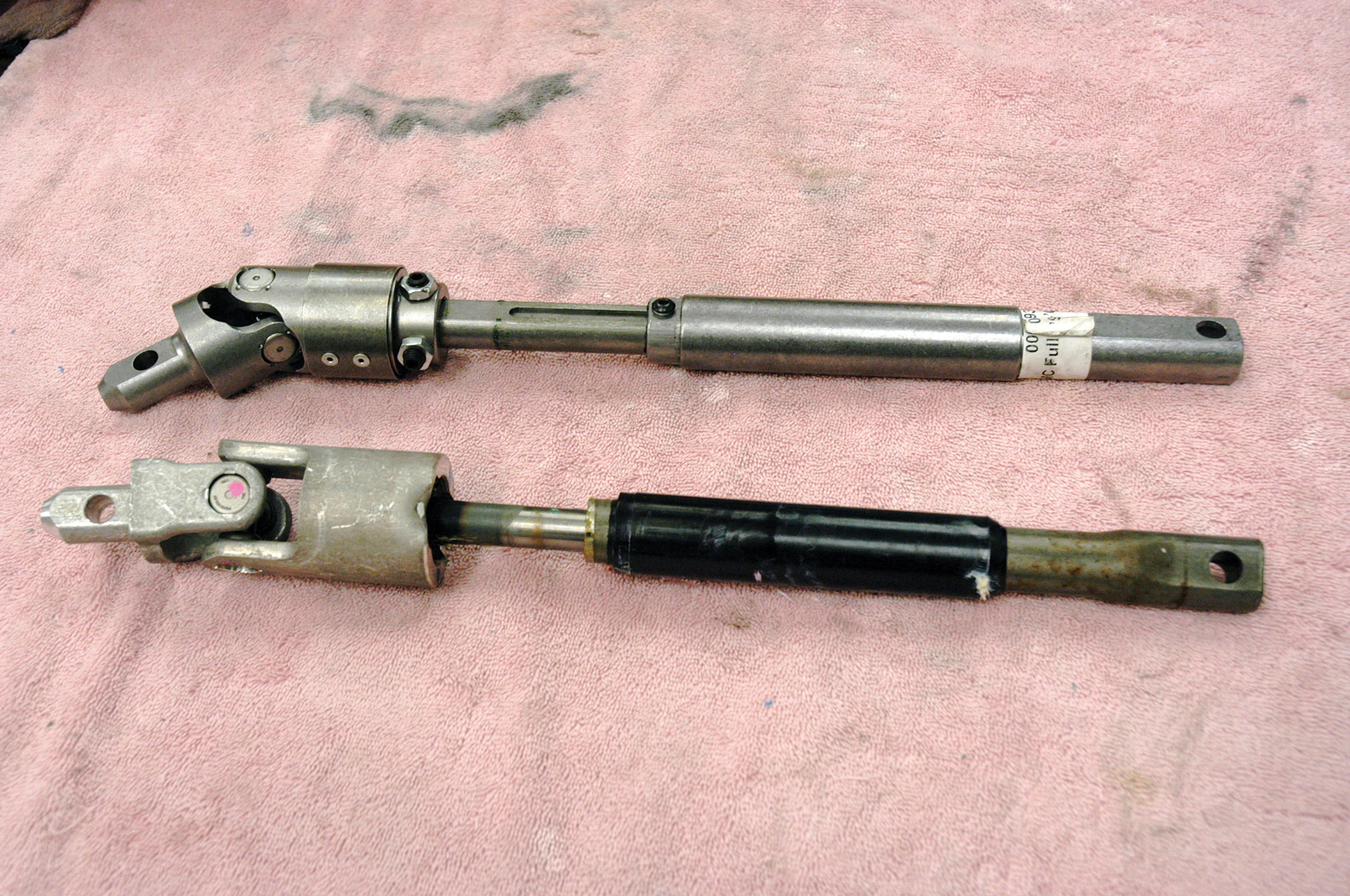 We ordered the kit and then disconnected the two-piece steering shaft from the steering box. Next, we removed the lower shaft from the upper shaft by removing the connecting bolt just outside the firewall. The shaft cover was then removed from the firewall. The upper shaft ran through the firewall and connected to the lower end of the steering column under the dash. Removing the shaft from the column required removal of a large bolt located on the end of the steering column. The new shaft was a direct replacement, so we simply reversed the steps to make the installation. One thing to remember is to make sure the steering wheel is realigned before tightening all the bolts.