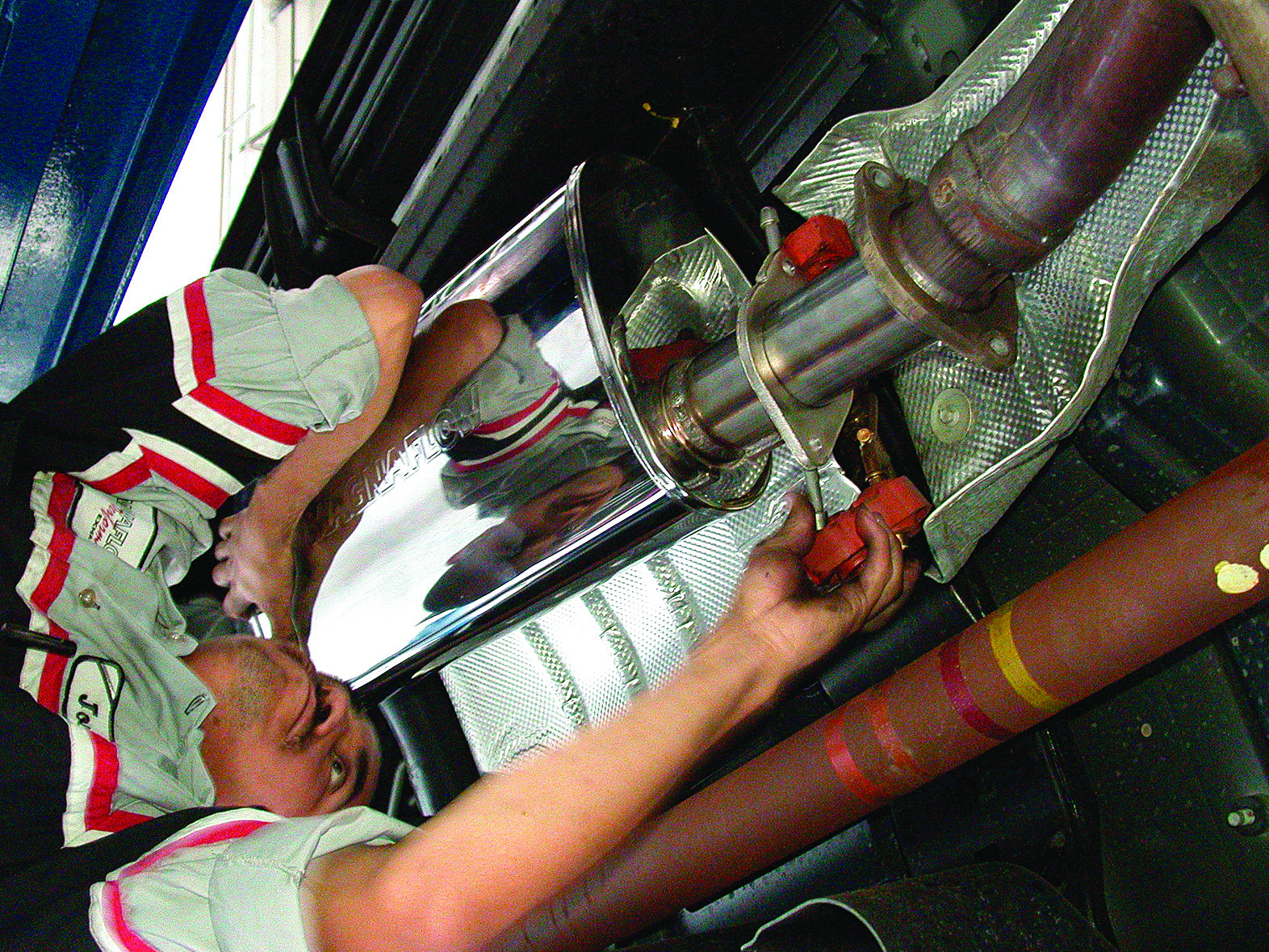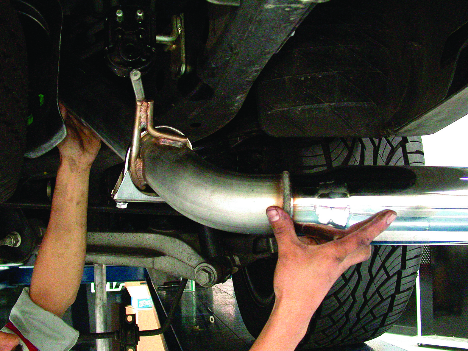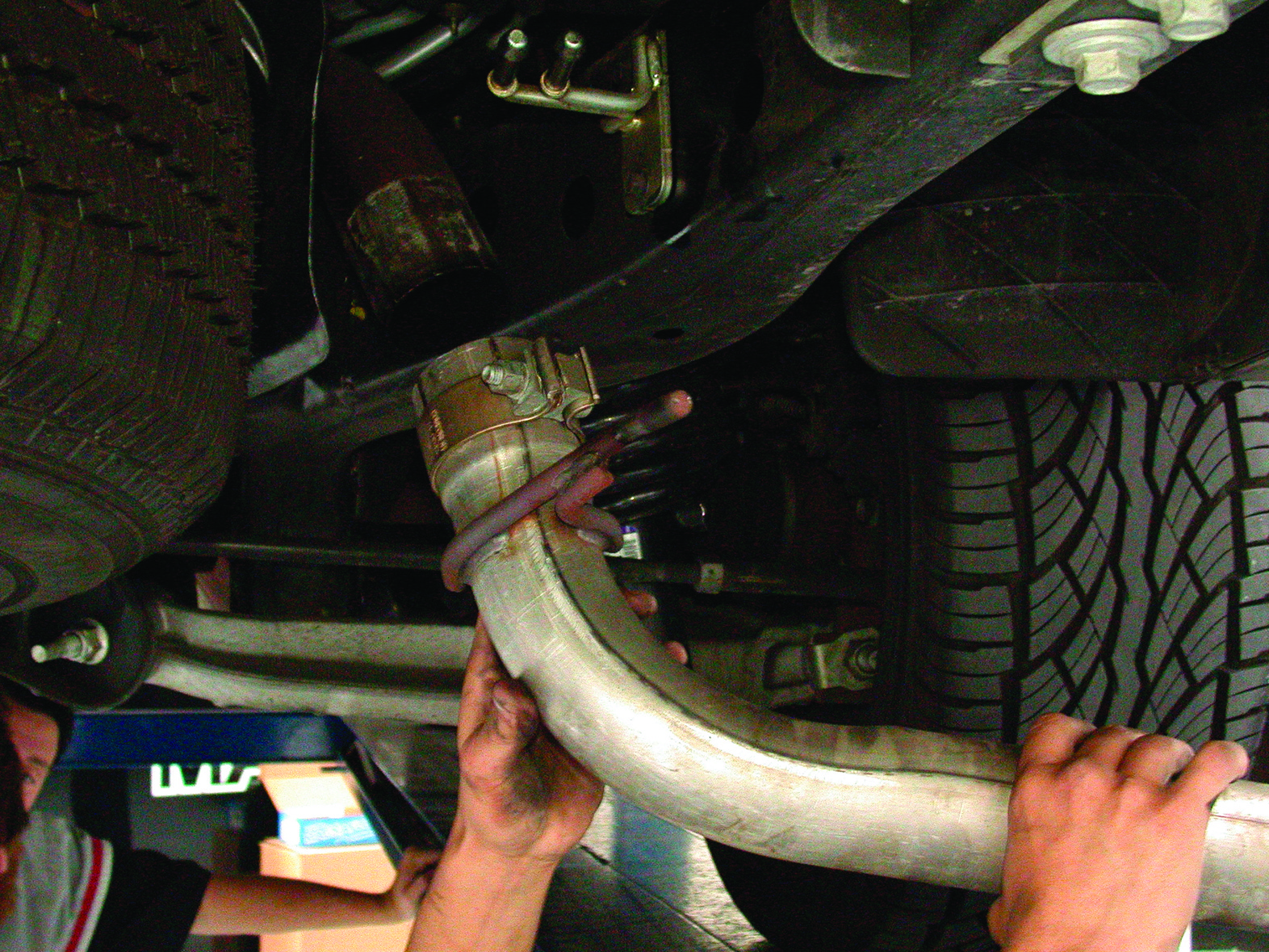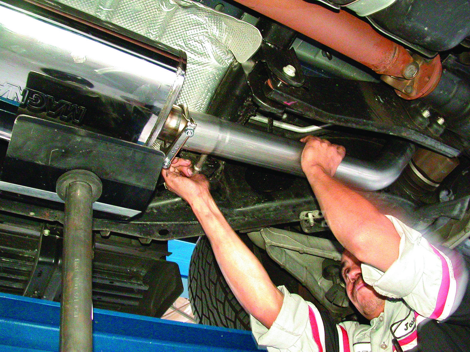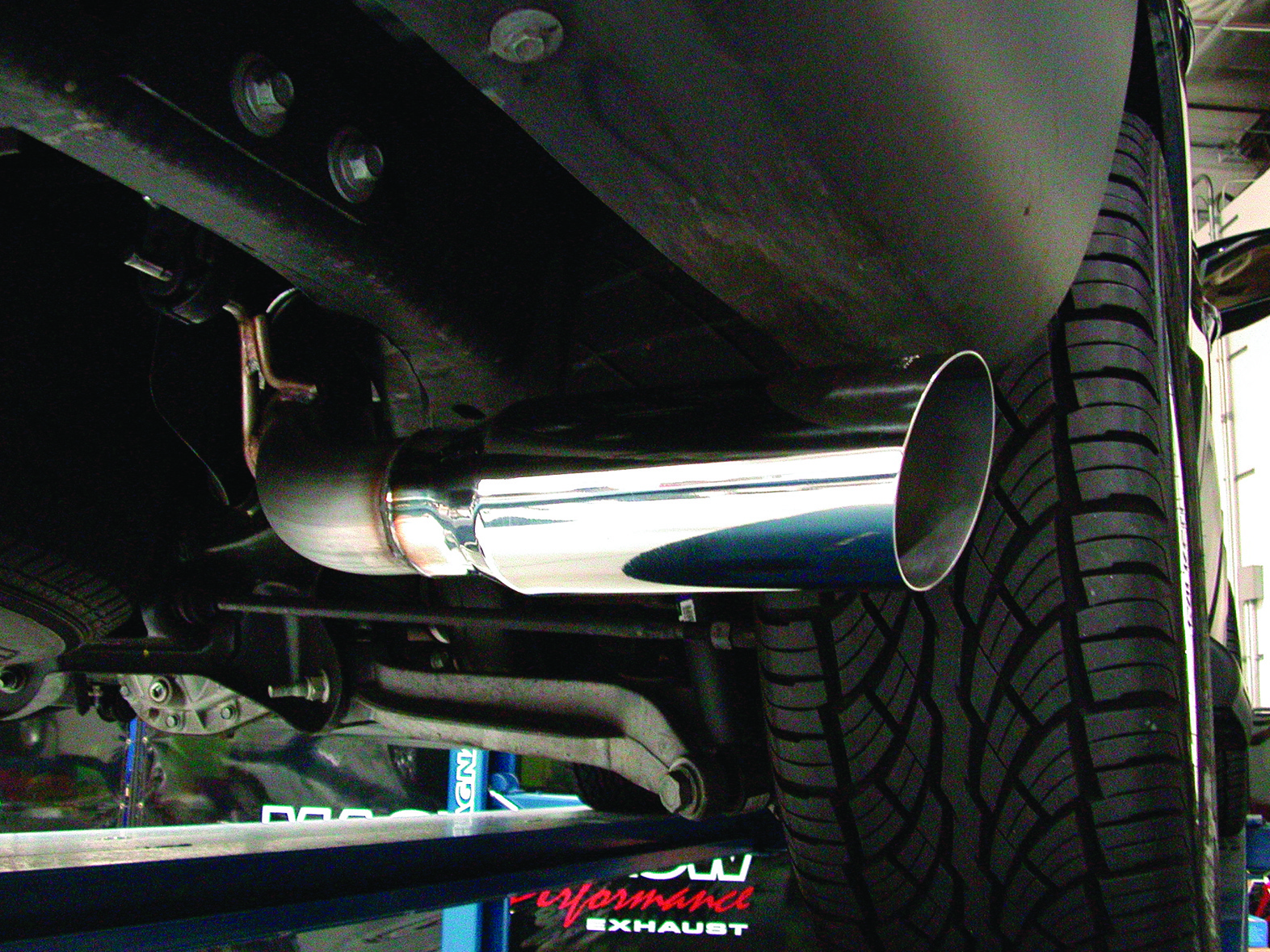 One of those areas of improvement is the after-cat exhaust system such as this one from MagnaFlow. A number of aftermarket companies make such systems for a variety of cars and trucks, since the factory systems simply leave a lot to be desired in terms of performance and sound. The OEs had to make the government happy, so their stock mufflers were as efficient and cost-effective as possible to make and employ. In their efforts to make these components quiet and cheap, they were too restrictive, power output was negatively impacted and they sound horrible. Well, a stock exhaust doesnʼt have much of a resounding note to it. Also, the exhaust tips leave lots to be desired in most cases, and on most truck applications there are no snazzy tips at all—just a treated tailpipe hanging down from below the chassis. That doesnʼt exactly look like a performance statement, either.