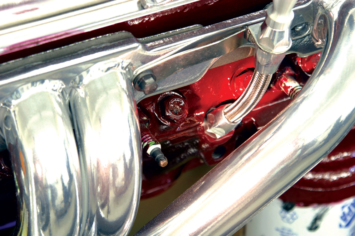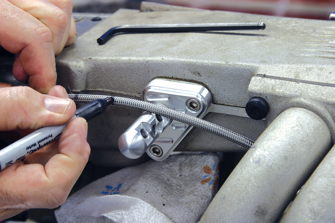 The kick-down cable housing needs to be cut to length before the transmission end can be installed. We dummy our TPI fuel injection, mount the Lokar bracket and stud, route the cable under the TPI runners and mark the desired length. Follow Lokar’s instructions and cut the housing.