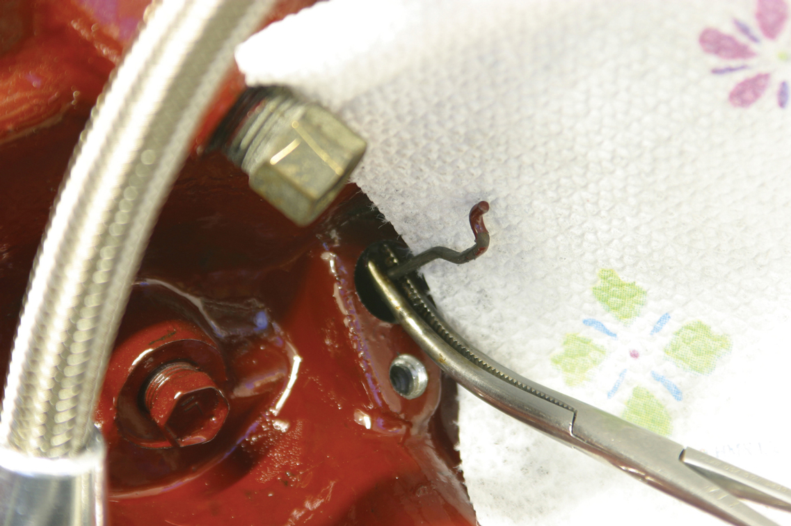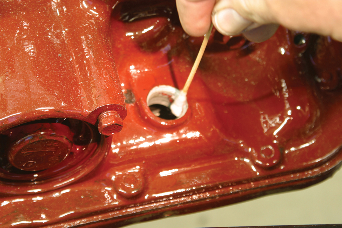 Another cotton swab soaked with alcohol is used to clean the inside of the dipstick tube hole. Remember, silicone will not adhere to an oily surface.
