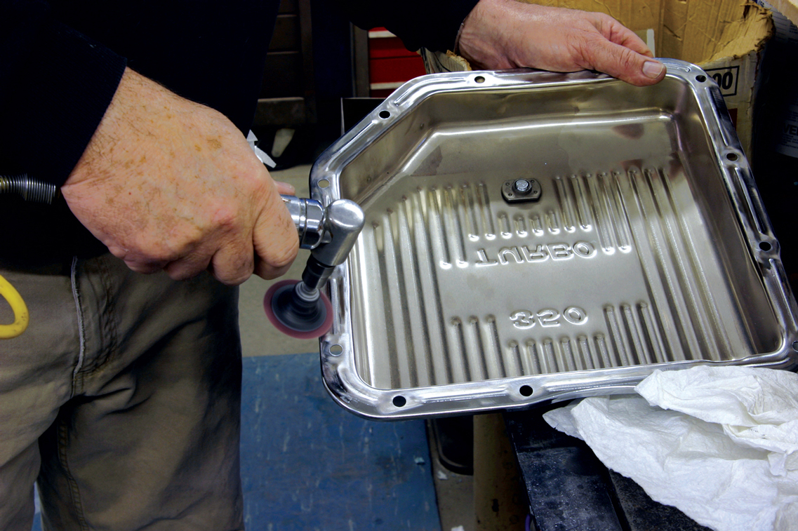 Here’s one more tech tip before we leave the “silicone valley.” Chrome is good, but it’s also very smooth. Before we install the new transmission pan, we scuff up the gasket surface with a 100-grit sanding disk on our 2-inch grinder. This will give the surface something for the silicone to adhere to.
