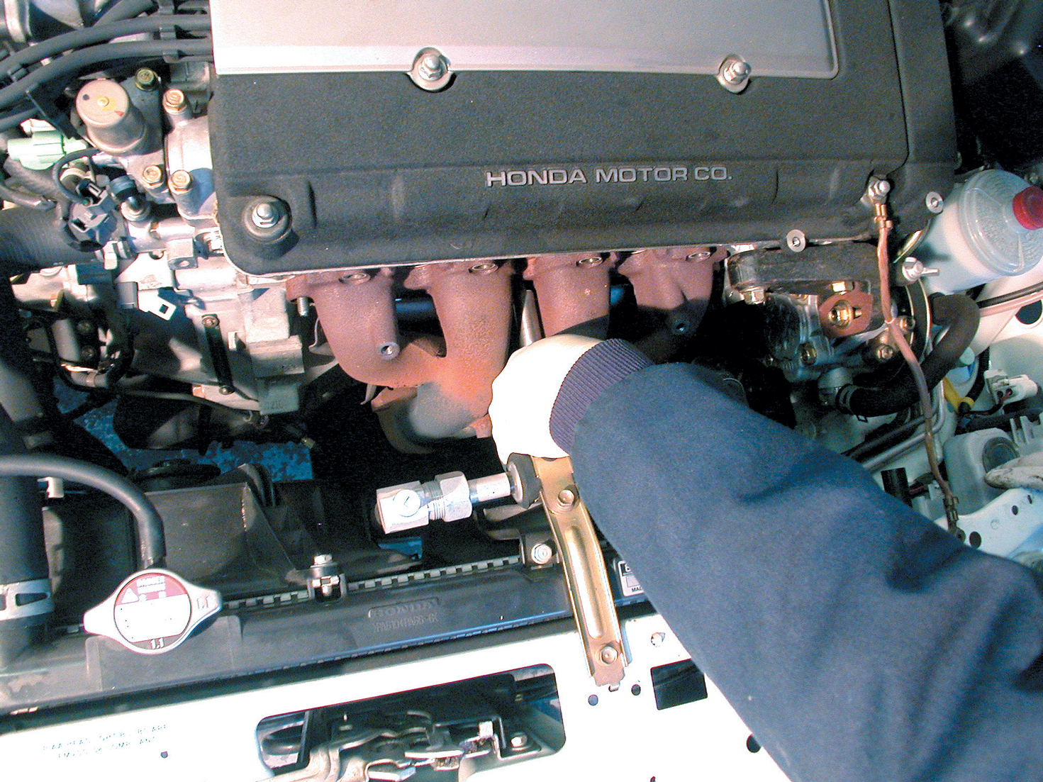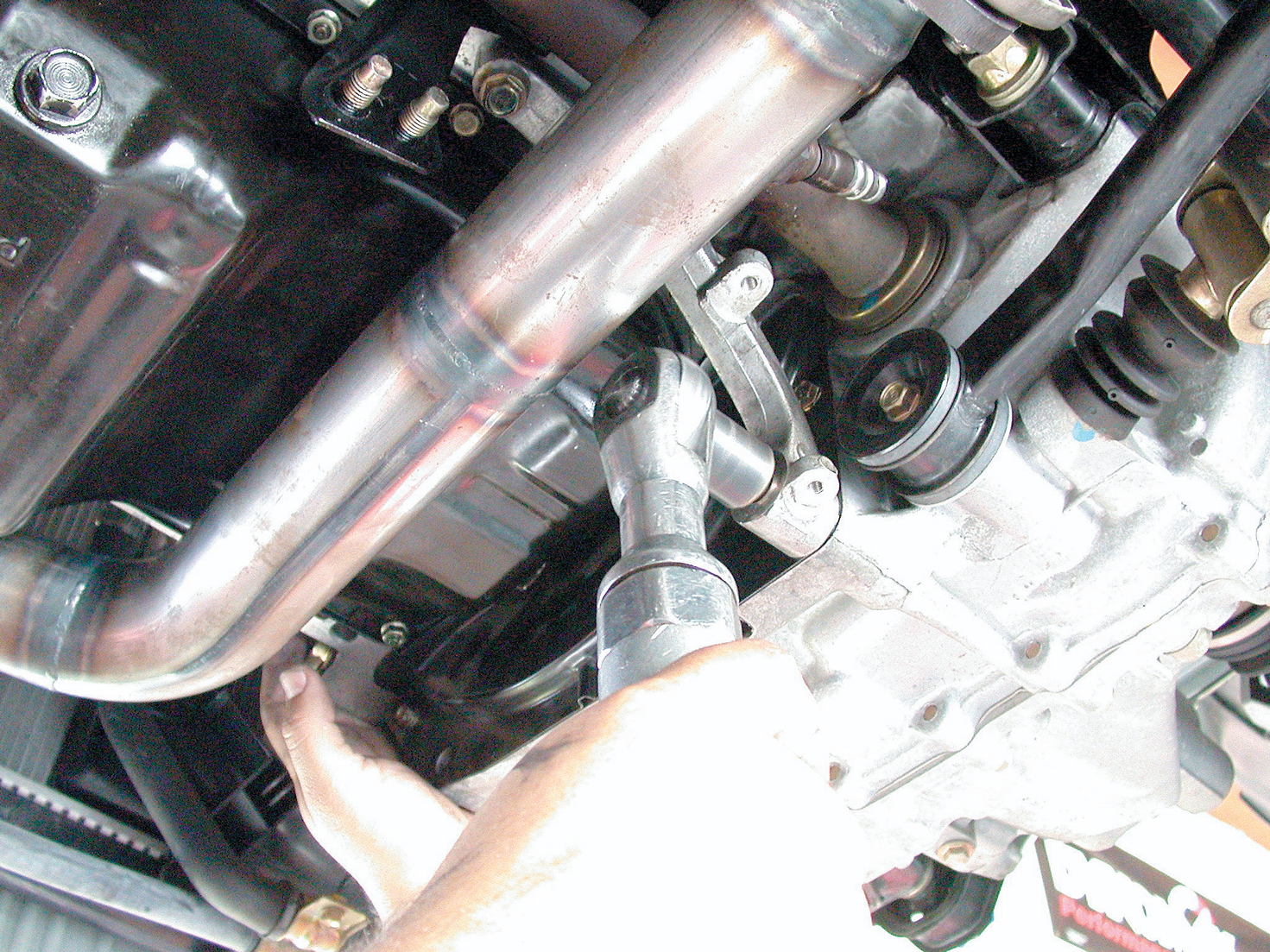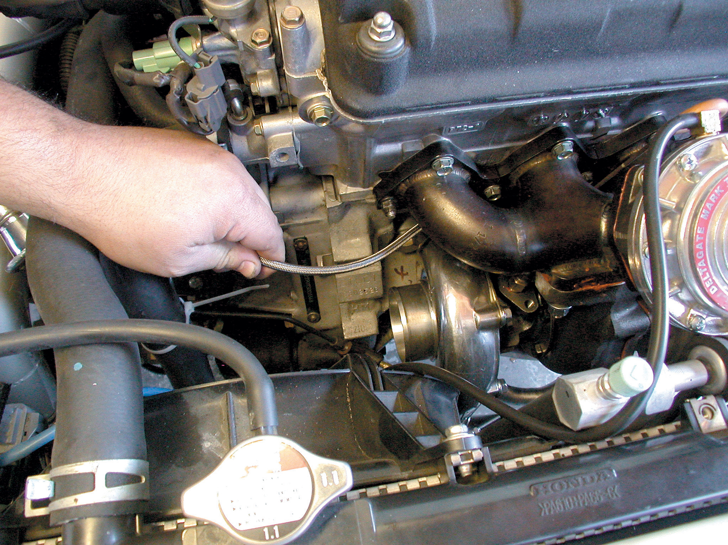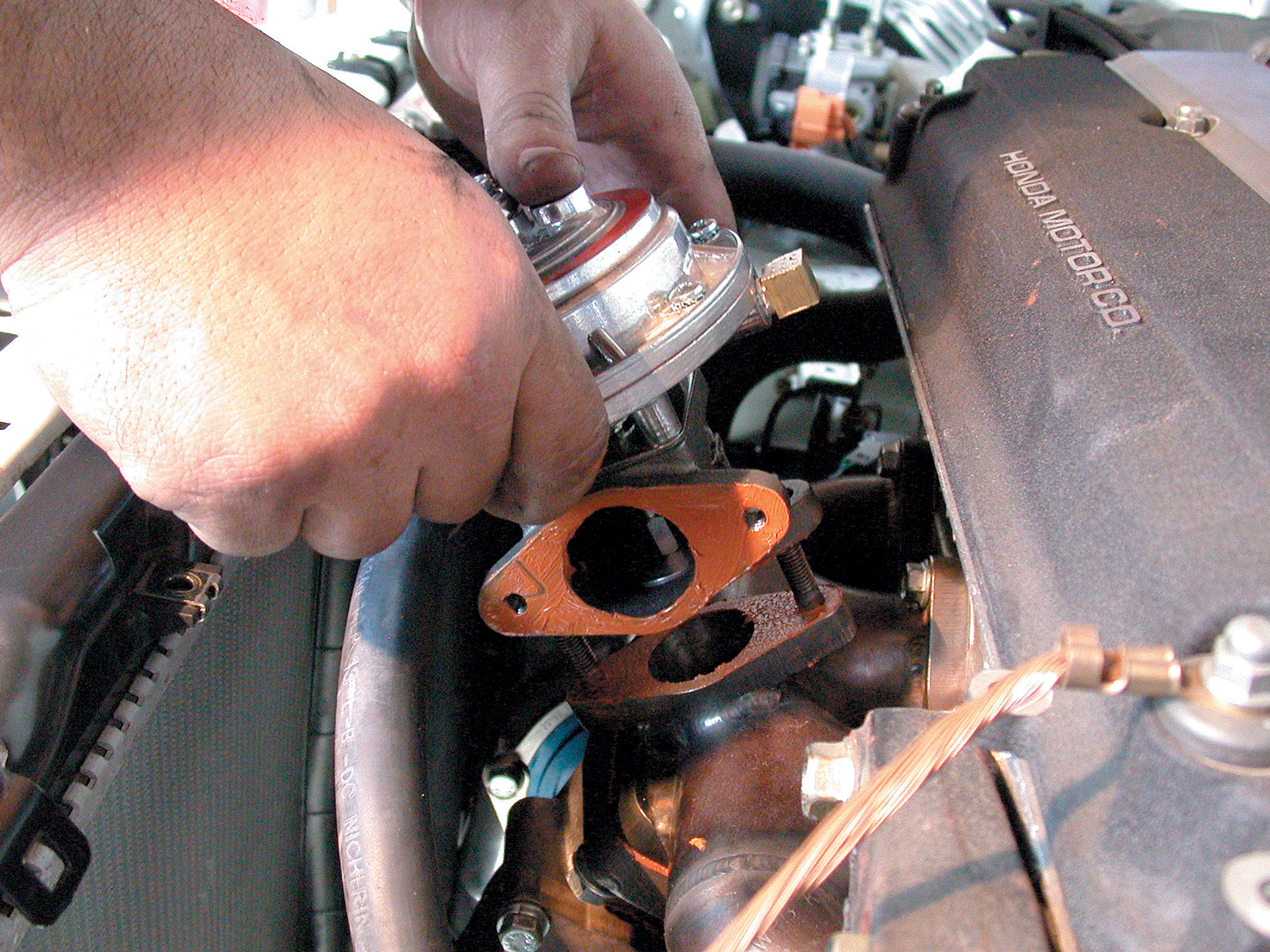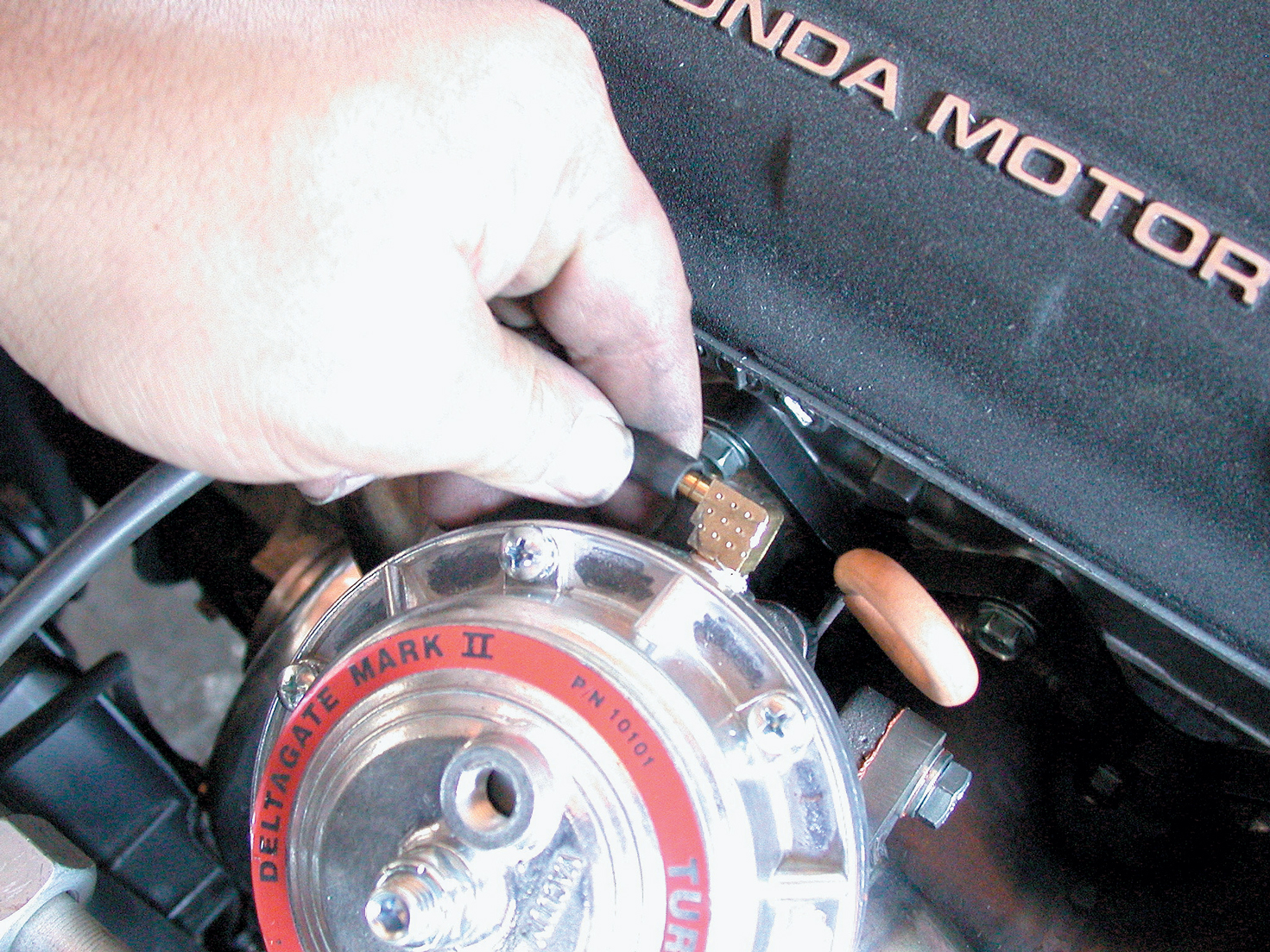Though B&M began life as a competition transmission company (it sponsored the likes of Don Prudhomme and even had the only automatic trans-equipped Indy car in history), as of late it has branched out into other forms of performance technology. For this Acura, adding one of B&M’s new CommandFlo fuel flow modifiers was a must. The B&M CommandFlo is a billet aluminum fuel flow modifier that allows adjustment of the fuel flow rate. This lets you properly tune the air/fuel ratio, which is ideal for use with free-flow intakes (like a turbo system) and exhaust systems. George Carrera, owner of Thirteen Twenty Motorsports, also added one of B&M’s SuperCooler oil cooler and remote oil filter kits, which was a necessity given the drastically enhanced performance that this Acura was to exhibit.