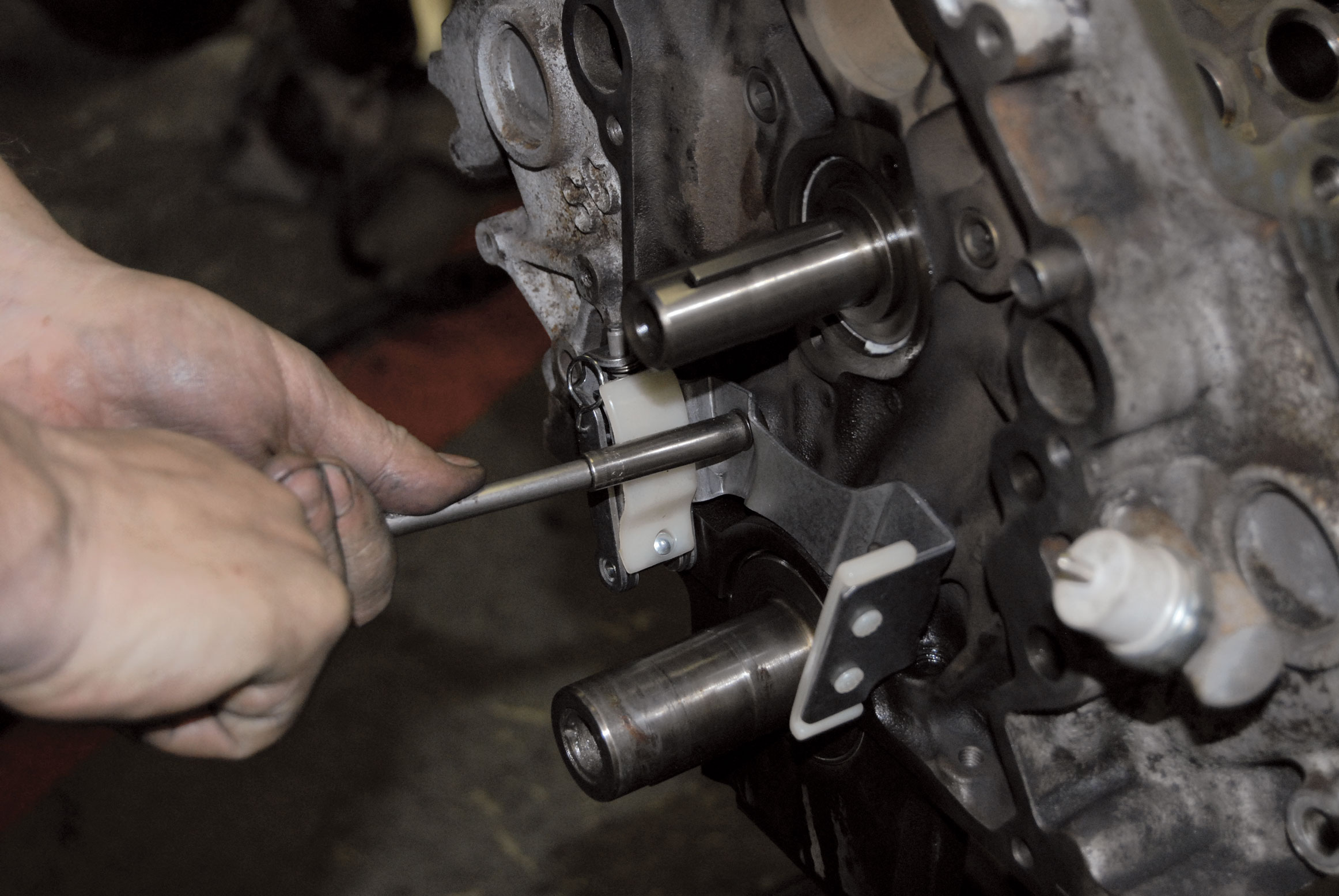 • To avoid breaking the timing cover, don’t miss the hidden 6mm Allen bolt behind the oil pump on the lower driver-side corner, and typically the long water pump studs that go through all the way to the engine block usually want to stay stuck in the block. Always remove them before attempting to break loose the timing cover.
