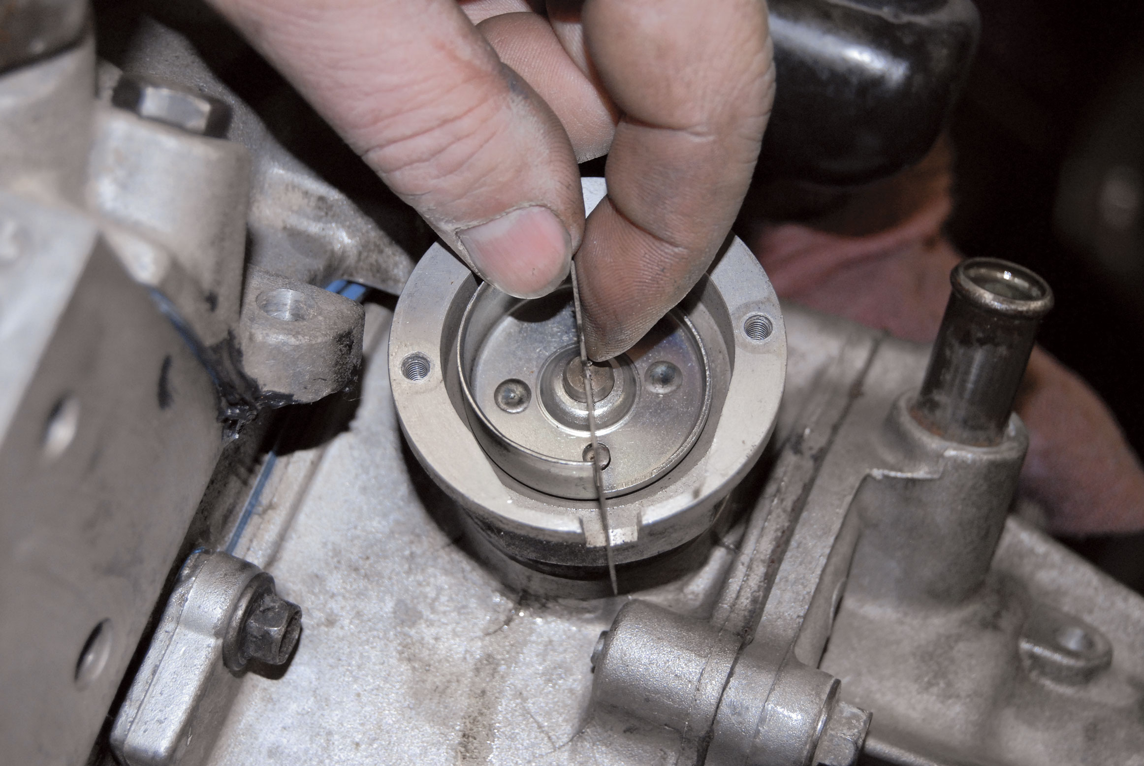 • Some water will end up in the oil pan after the timing cover is removed. Antifreeze is death to bearings and other wear points, so the less you get in the motor, the better. A good way to minimize the amount of water getting into the motor (and all over the floor) is to use a small siphon bulb to suck the coolant out through the water passages in the front of the block before removing the cylinder heads.