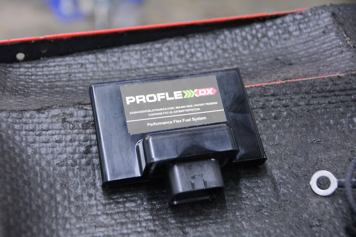 Advanced Fuel Dynamics offers kits that work with port fuel injection as well as direct injection. This Mustang features port injection and direct injection from the factory, and the PROFLEX DX kit has the necessary components to work with both injector systems. The kit includes a Port Commander Module, a Direct Commander Module, fuel content sensor, wiring harness and pre-assembled braided fuel lines with factory-style locking connections.