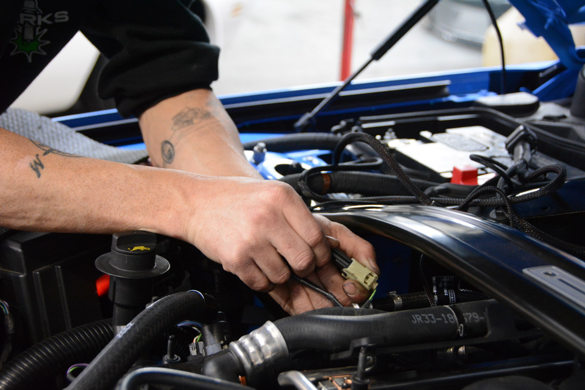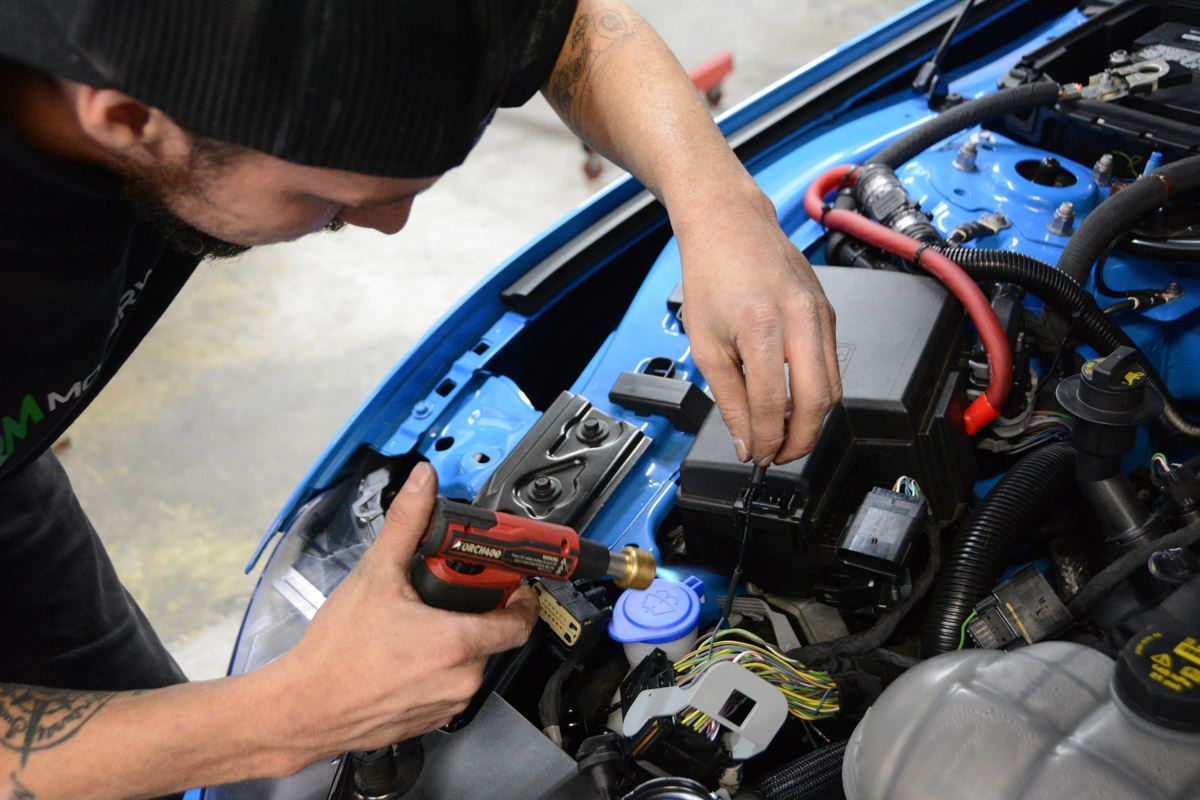 Joey Bolden at RM Motor Werks is handling the PROFLEX install on this S550 Mustang. He begins by laying out the injector wiring harness.