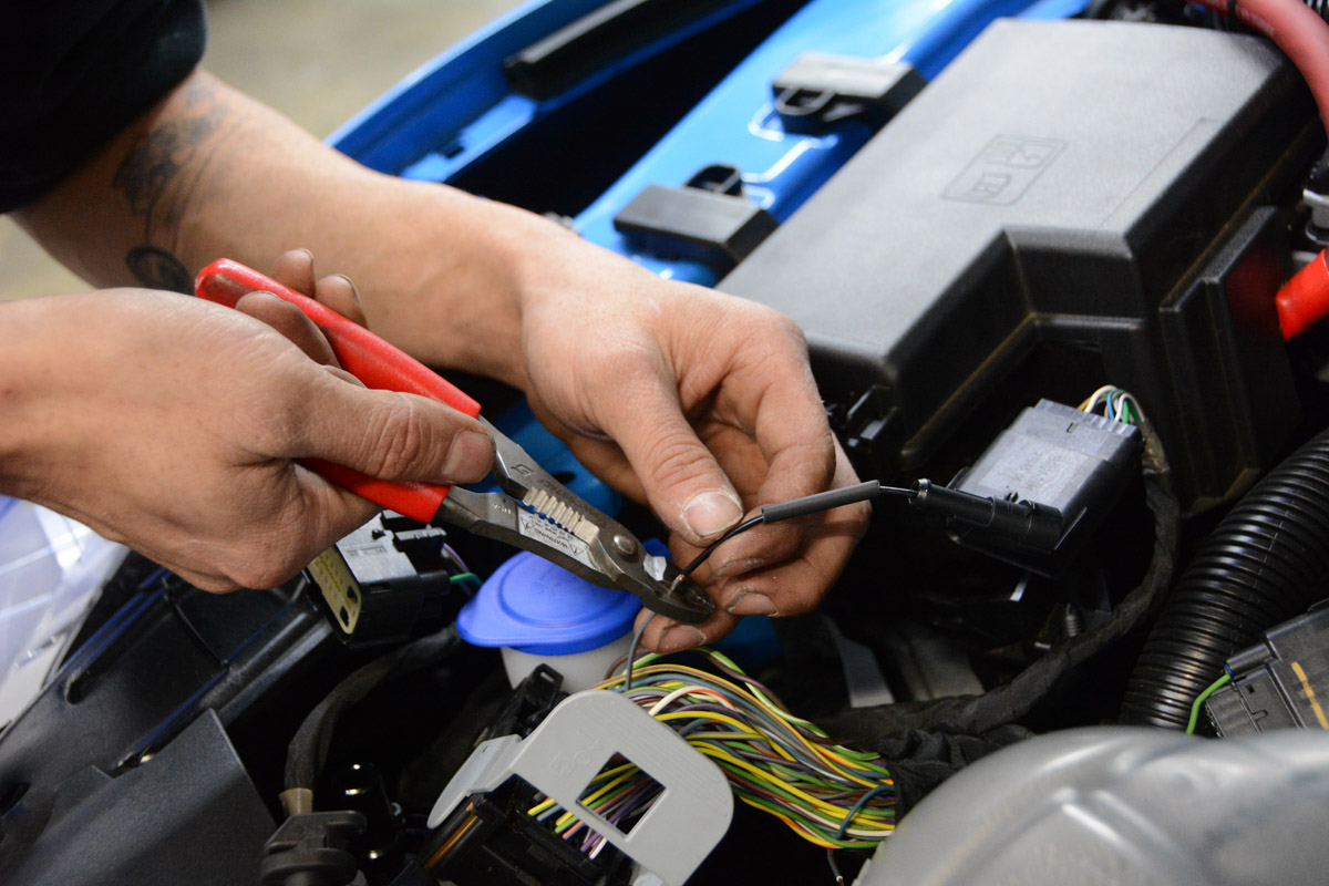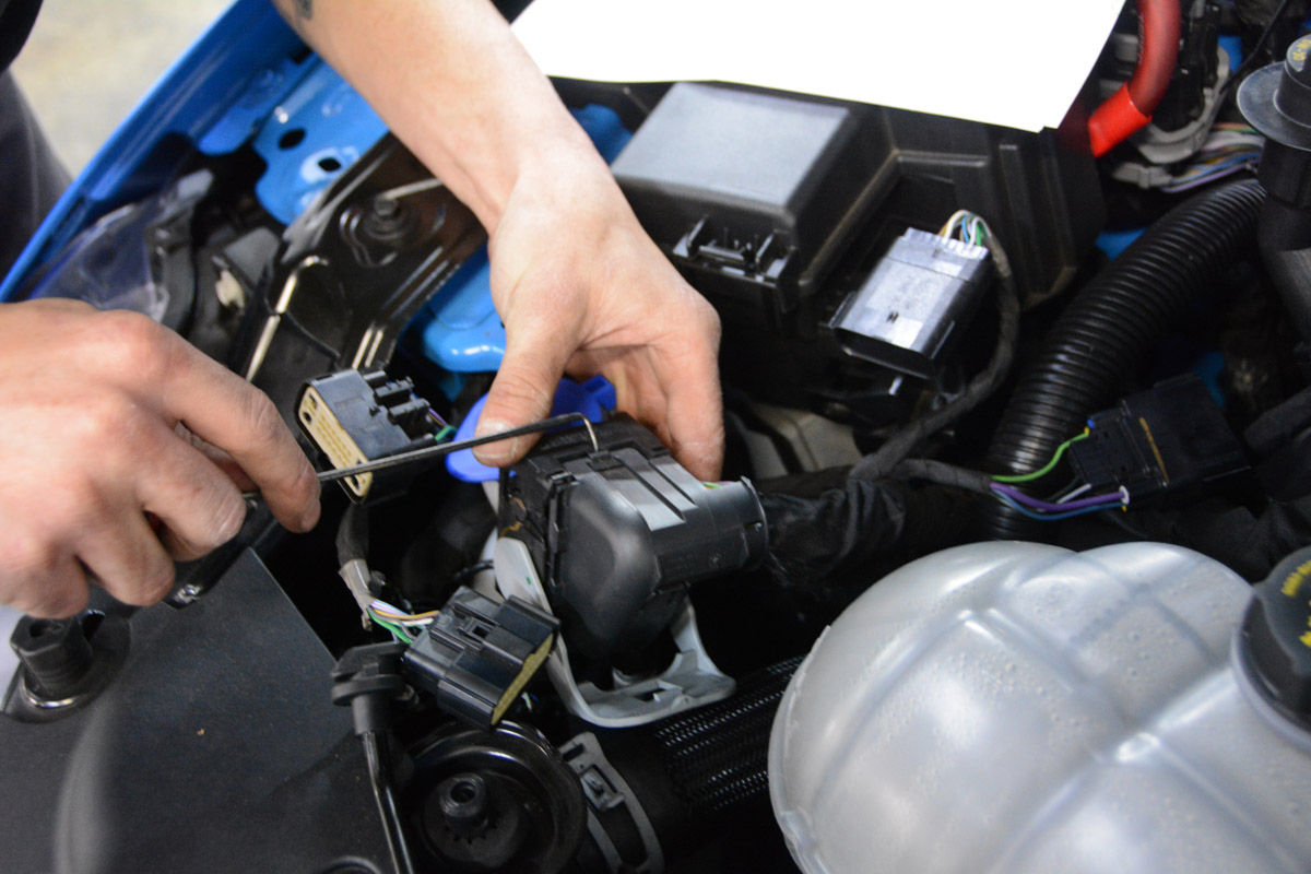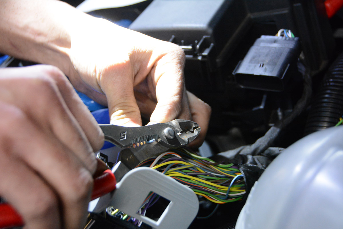 In order to tie into the car’s ECU wiring harness, Joey removes the large connector that resides under the fuse panel. A pick tool is used to open the connector and gain access to the bundle of wires.