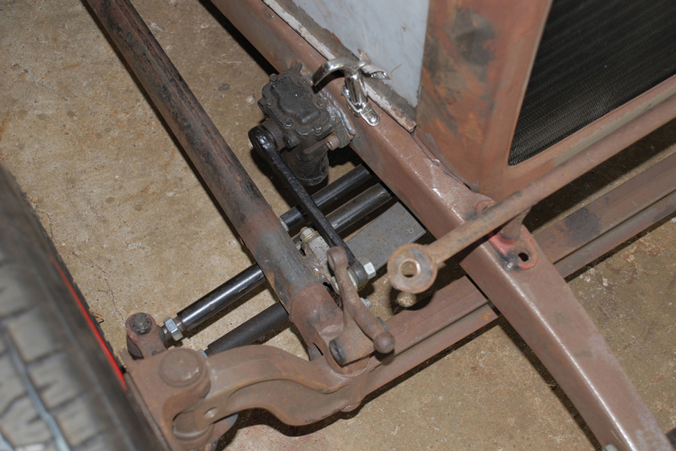 The front suspension on the sedan is basic hot rod stuff. A dropped axle, mono-leaf spring and a set of Armstrong hydraulic lever-action shocks keep it simple. Those shocks were standard equipment on cars like MG.