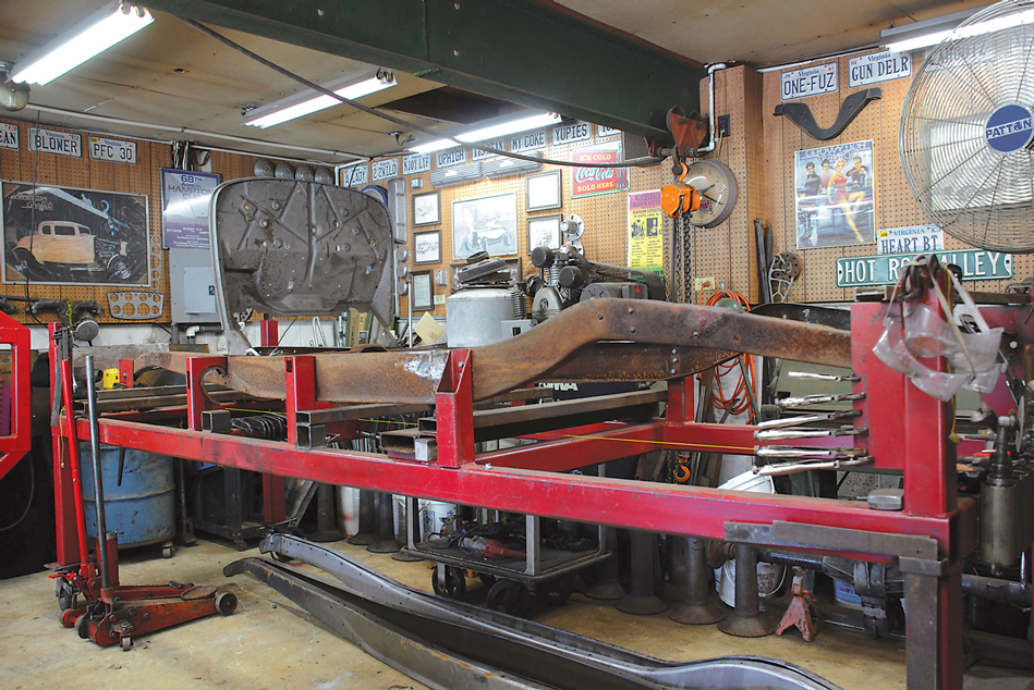 An original frame is now in the fixture, but note that there are a couple of sets of brand-new framerails under the table. Fuller’s Frame & Axle will build your frame any way you want it.