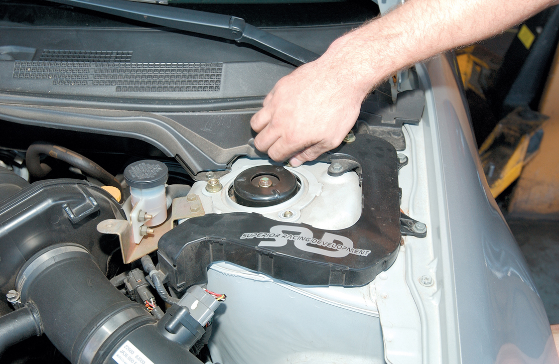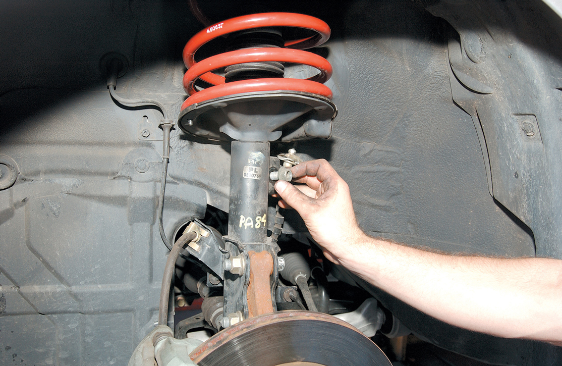 To replace the spring, the factory strut assembly is removed. To accomplish this, the two lower bolts are loosened and removed, followed by the three upper attachment tower bolts located in the engine compartment. Once the bolts are removed, the strut assembly is easily lifted out of the Altima.