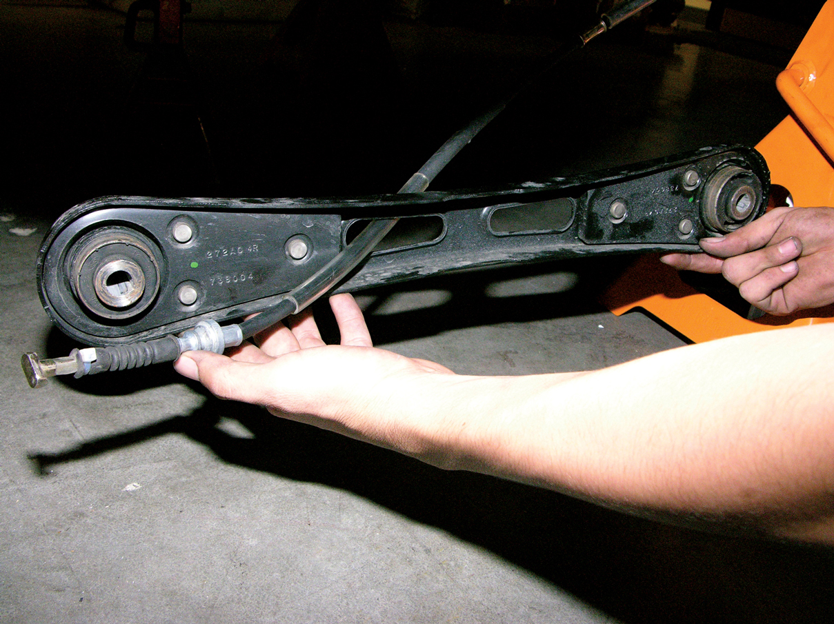 With the rear axle supported on jackstands, remove the bolts that secure the suspension arm to the subframe and the rear axle.