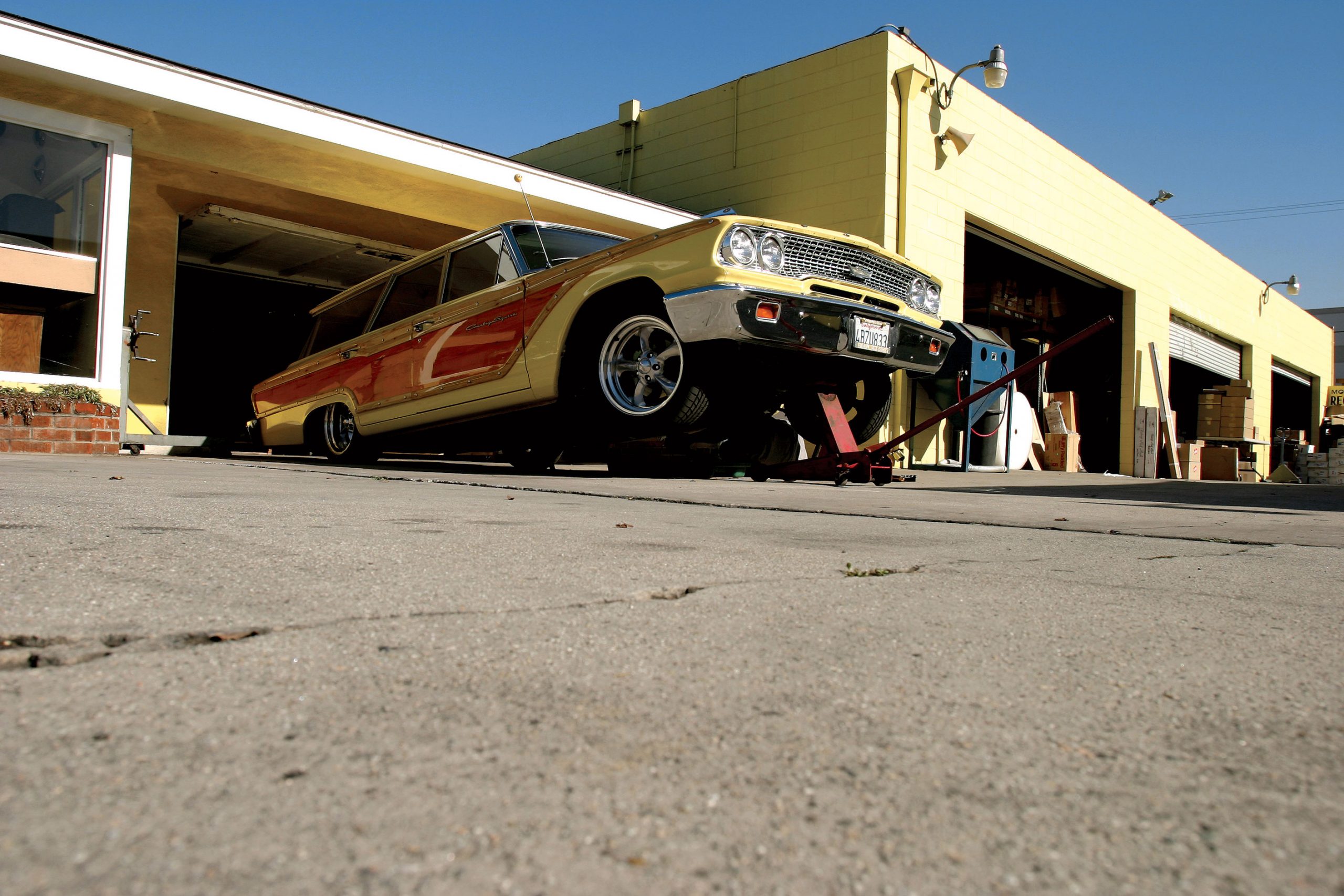 Out in the yard, hot rod guru Ken Farrell wrenches on a ride, popping the new push-button transmission controls in the company station wagon. With the hand-painted wood grain ’63 Country Squire on a jack, he installs the Smart Shift to the rolling laboratory. Recognized for his development of Moon’s new-fangled fuel injection units, Farrell fuses new computer technology with classic hot rod ingenuity. Spinning wrenches on the concrete pad in the warm California sun, he is totally oblivious to the fact that he is occupying the same turf as the notorious Rat Fink reunion parties. These one-day events that host pinstripers, hot rod artists and music reunite rodding legends with the younger crowd. With over 500 cars attending last year’s Christmas party, the mid-December event was moved up the street to a bigger parking lot in Whittier.