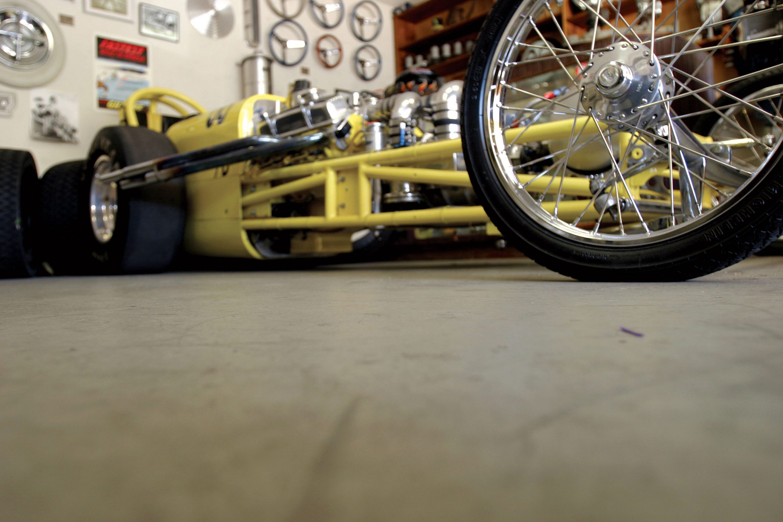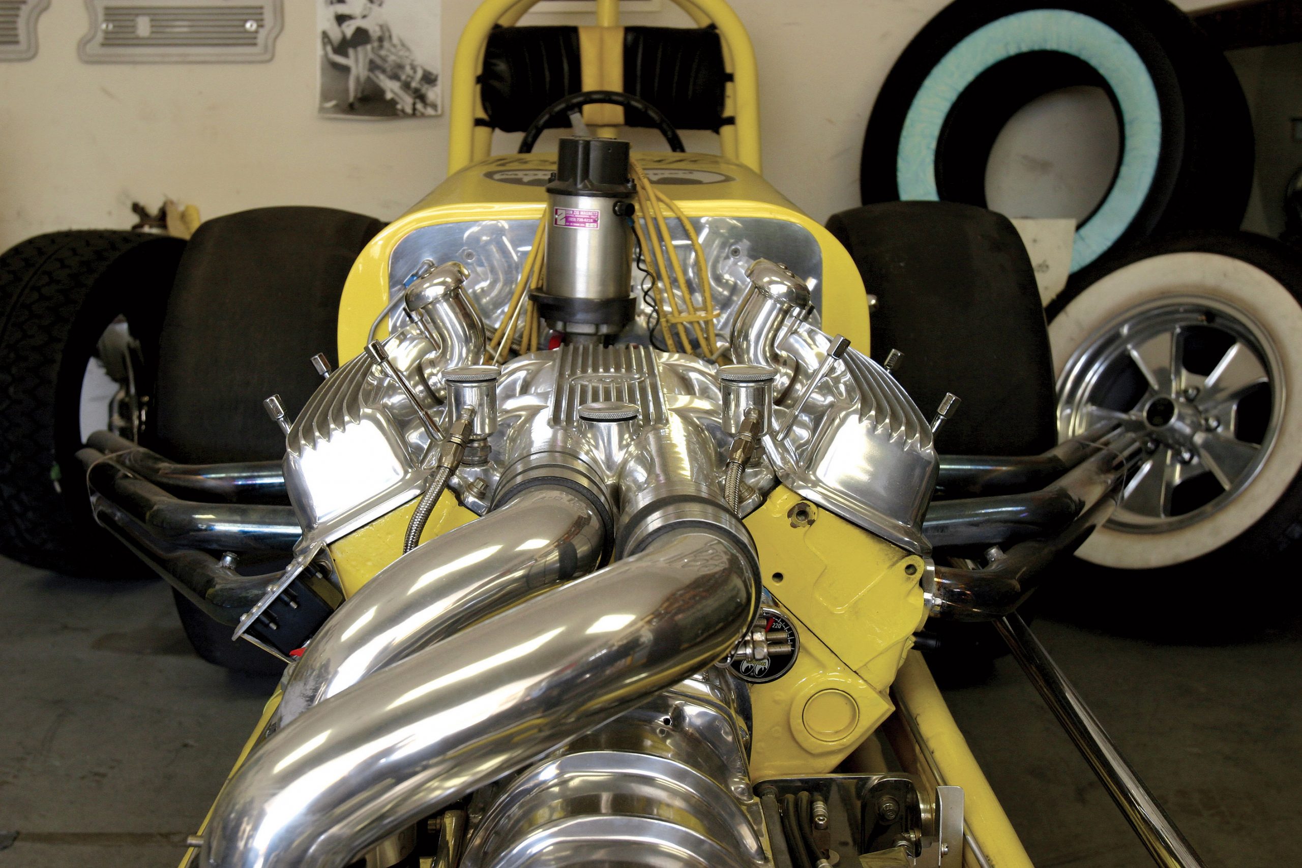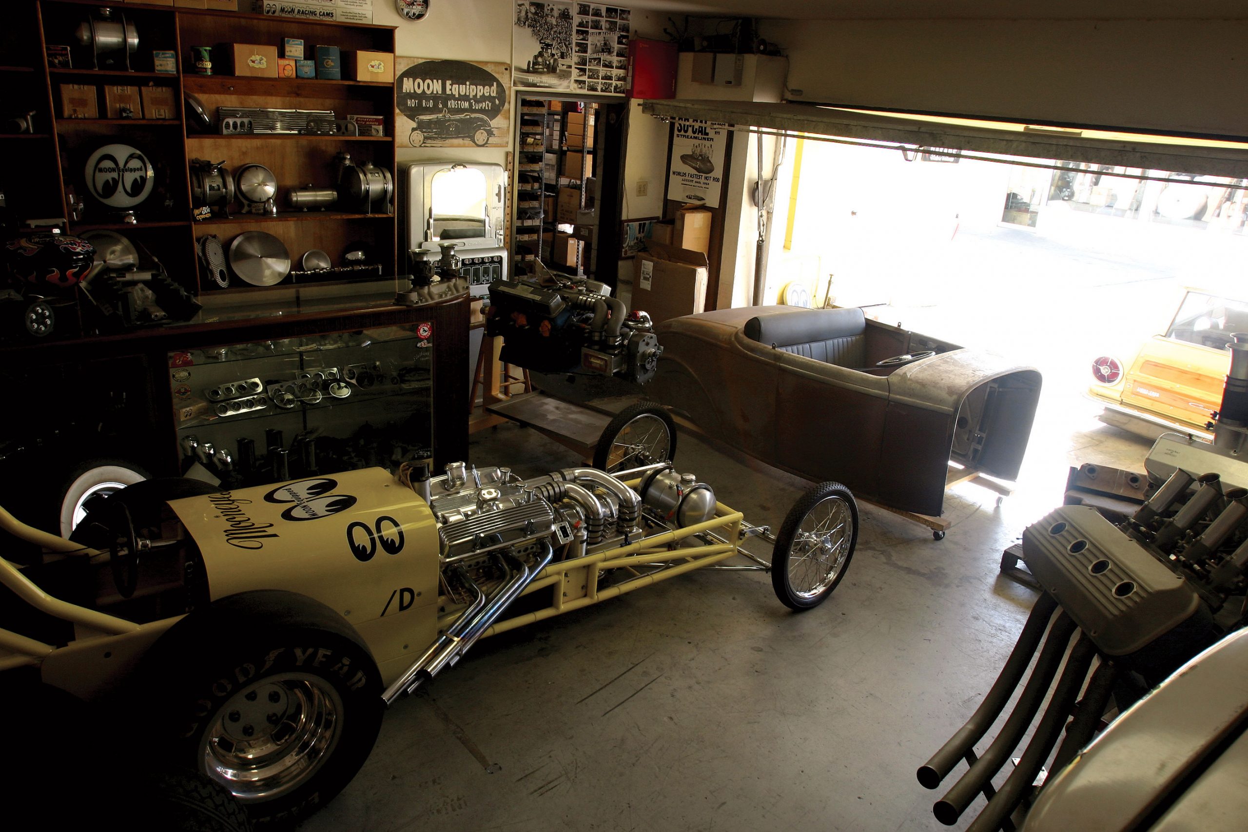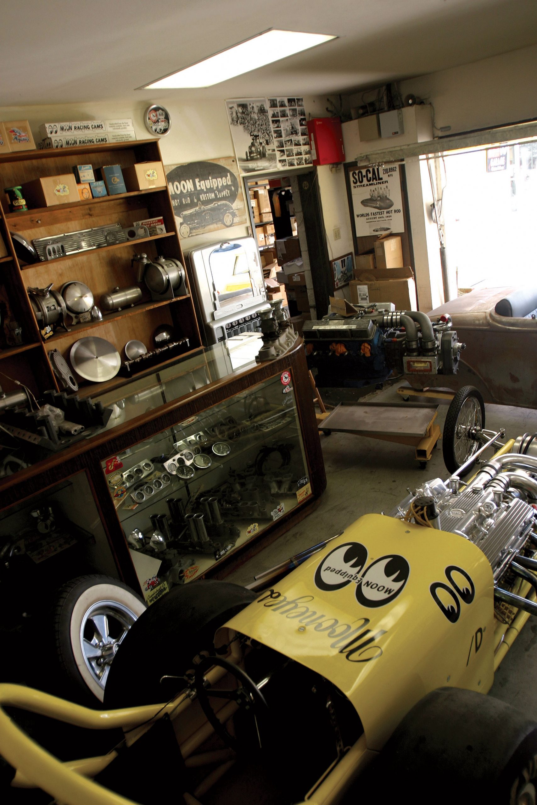 Step into the back room and you won’t believe your eyes–a Moon Dragster in living color? Bonneville strong man Fred Larson put this one together a few years back for the sole purpose of massive burnouts and drag strips exhibition runs. The original Moon Dragster is retired and now lives in Florida, but this newer creation dressed in American mags with drag slicks delivers all the thrills and chills of yesteryear. On the walls are faded posters from all the important strips surrounded by Hemis and small blocks perched on stands, waiting for their next tour of duty.
