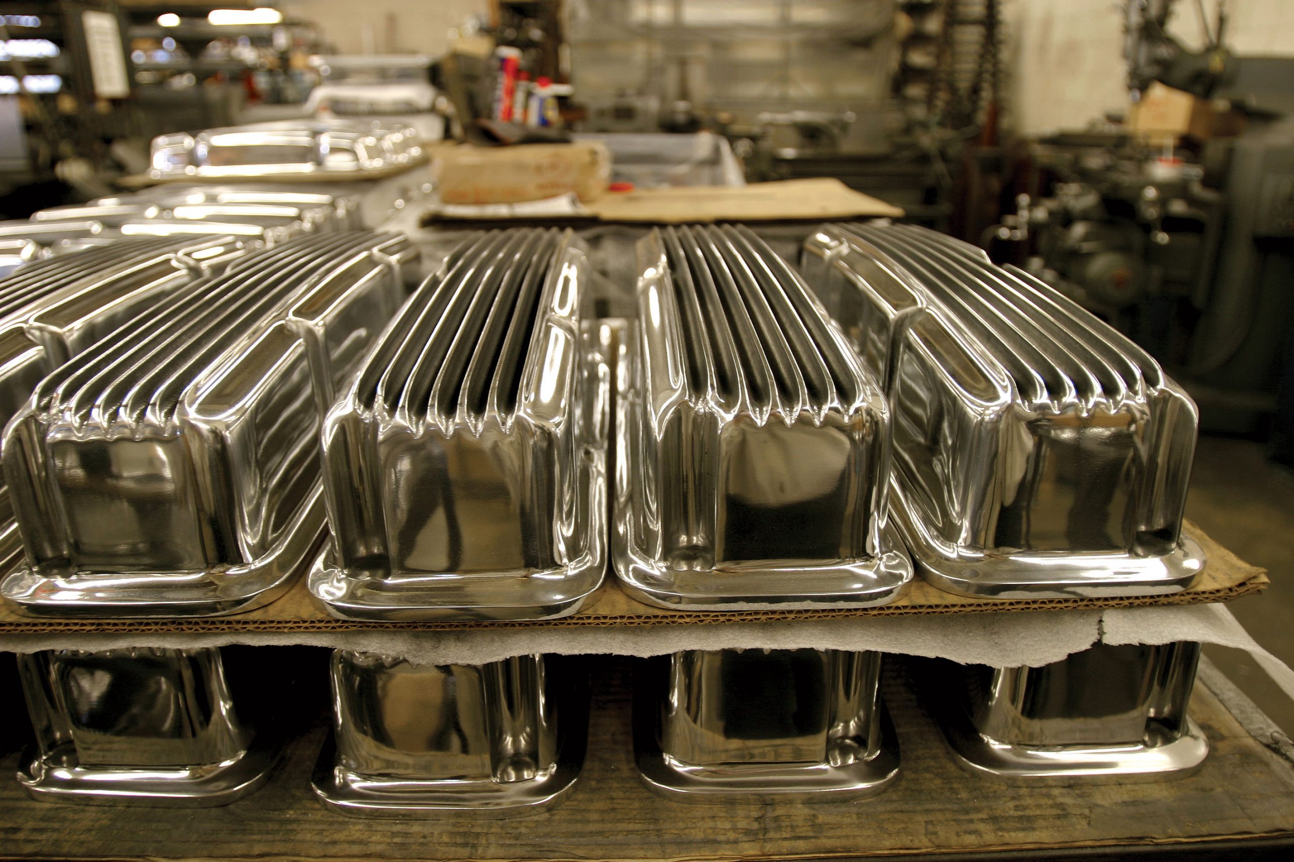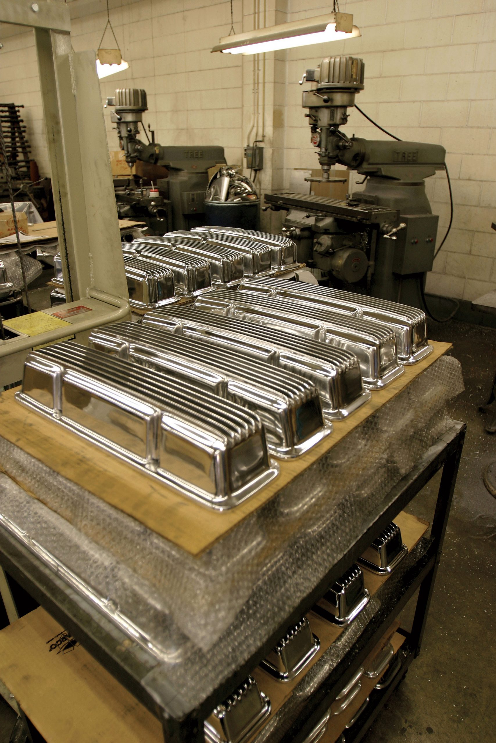 Back in the shop, the staff works hard to fab the hop-up parts. You won’t see a CNC machine here, only lathes, milling machines and drill presses. By the window, you’ll find cam-grinding legend Bill Jenks, who usually works on custom orders or builds one of Mooneyes famous gas tanks. At any stage of the process, Moon tanks are a thing of beauty; fabricated from the finest aluminum, each tank is finished in the company’s signature sunray surface. Traditionally mounted in front of the grill, the polished tank can easily clamp onto a deuce spreader bar in minutes. Over in the corner, Manuel Flores pumps out Moon discs spun from circle cut aluminum, each a different thickness. Like a fine ceramicist on a potter’s wheel, it’s mesmerizing to watch as he shapes the spinning aerodynamic covers.