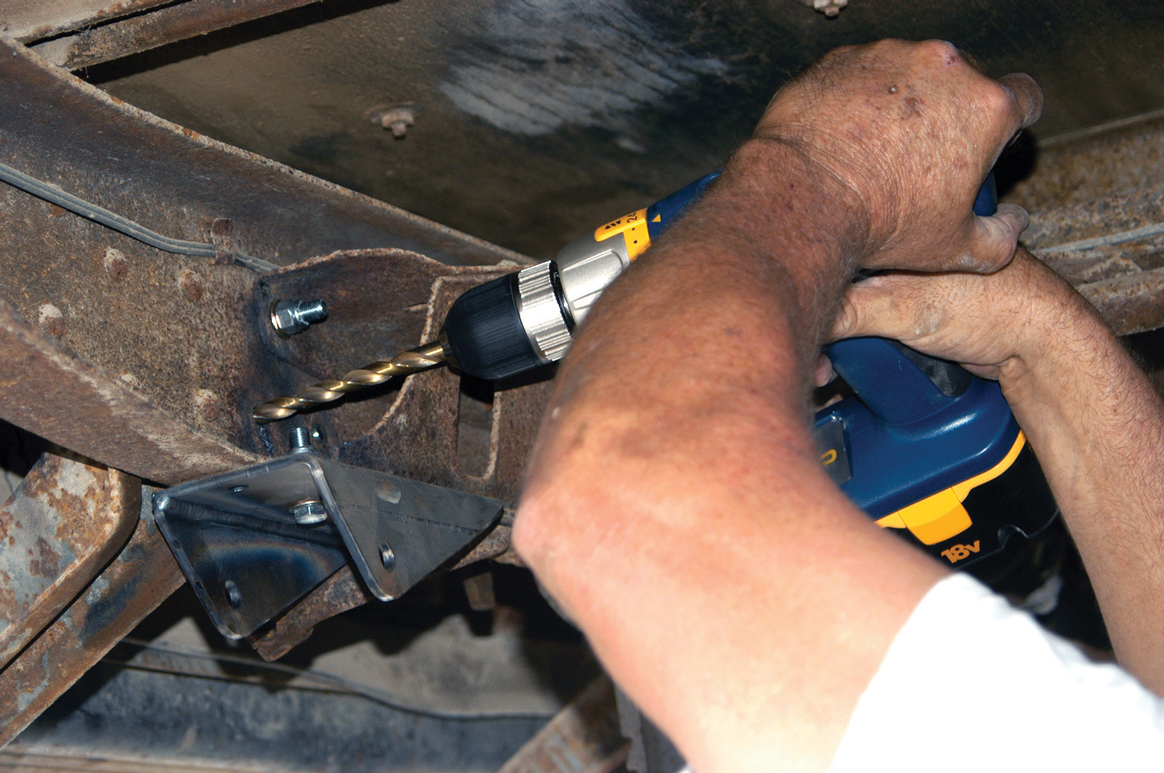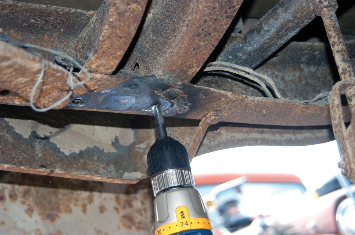 The rear spring mounts also have to be installed and they share the same mounting location as the original mounts. Here the original rivet holes are being cleaned out with a drill motor.