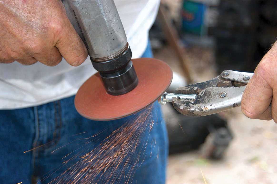 The holes are located very close to the original rear crossmember so the bolts had to be modified to fit. Here the bolt is being sanded on one side so it can be installed in the frame.