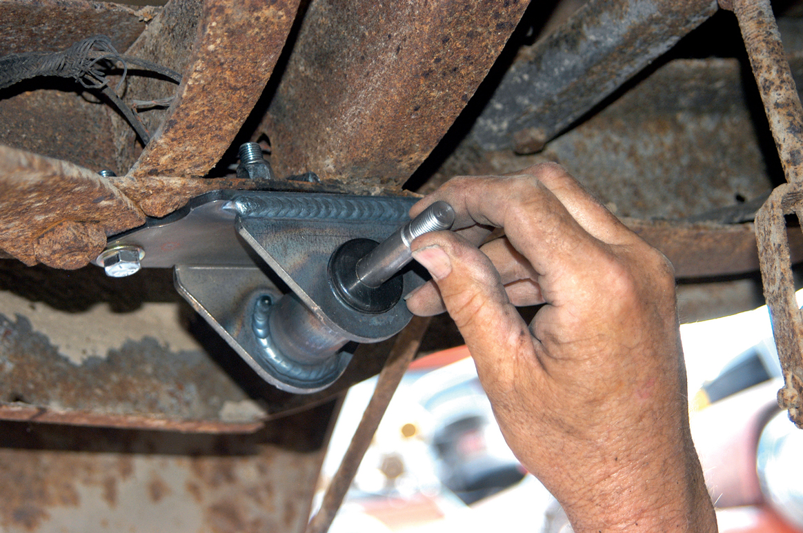 Here the spring perch bolt is being installed in the urethane bushing.