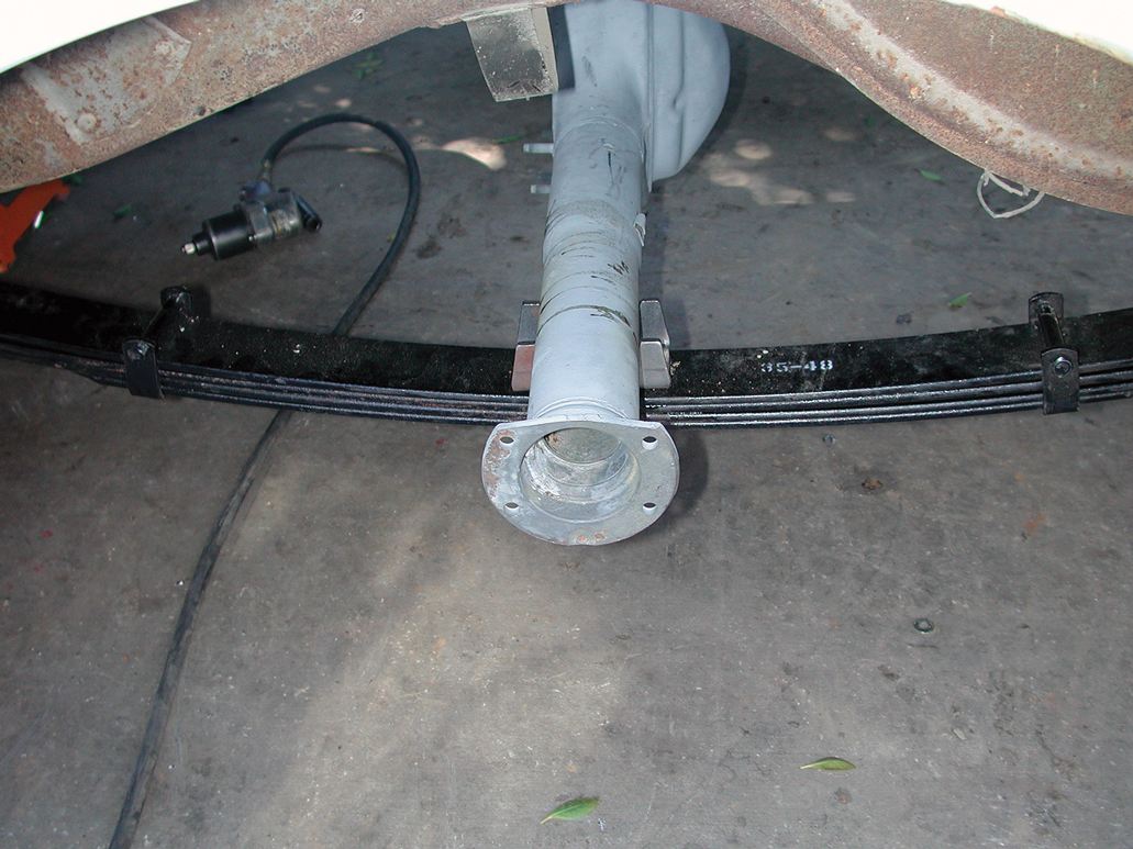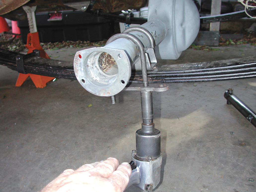 The original springs were disconnected from the original spring mounts and then the differential was removed from the truck. This truck was equipped with a torque-tube-style differential. It will be replaced by a Ford 9-inch differential with an open driveshaft.