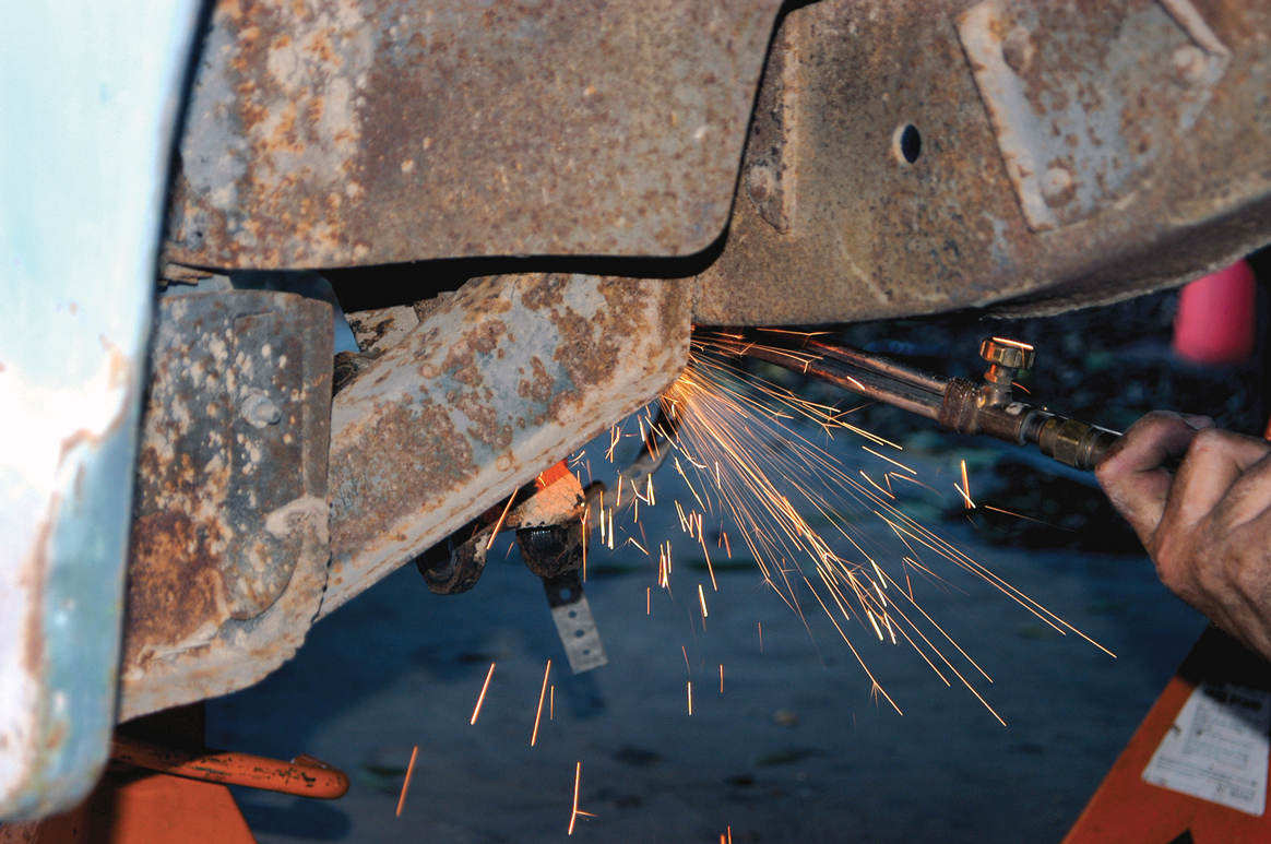 Before the new spring mounts can be installed the old mounts have to be removed. Here the rivets that secure the mounts to the frame are being cut out with an oxy-acetylene welder.