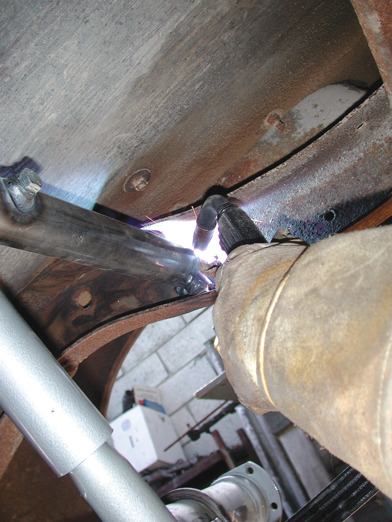 Here the shock crossmember is being connected to the frame with a MIG welder.
